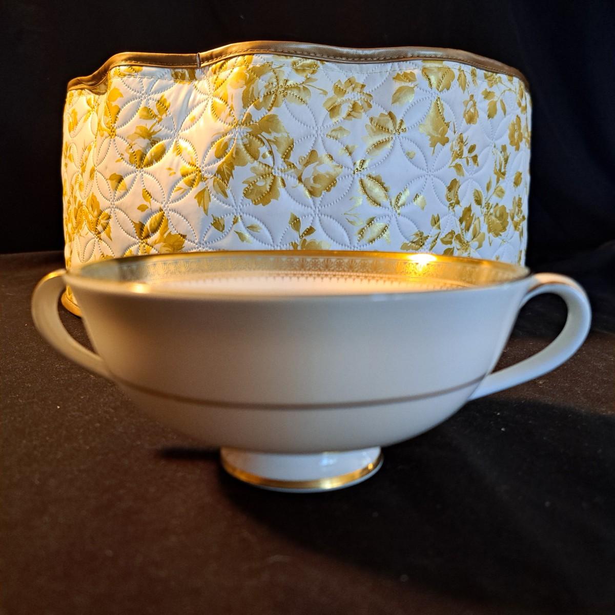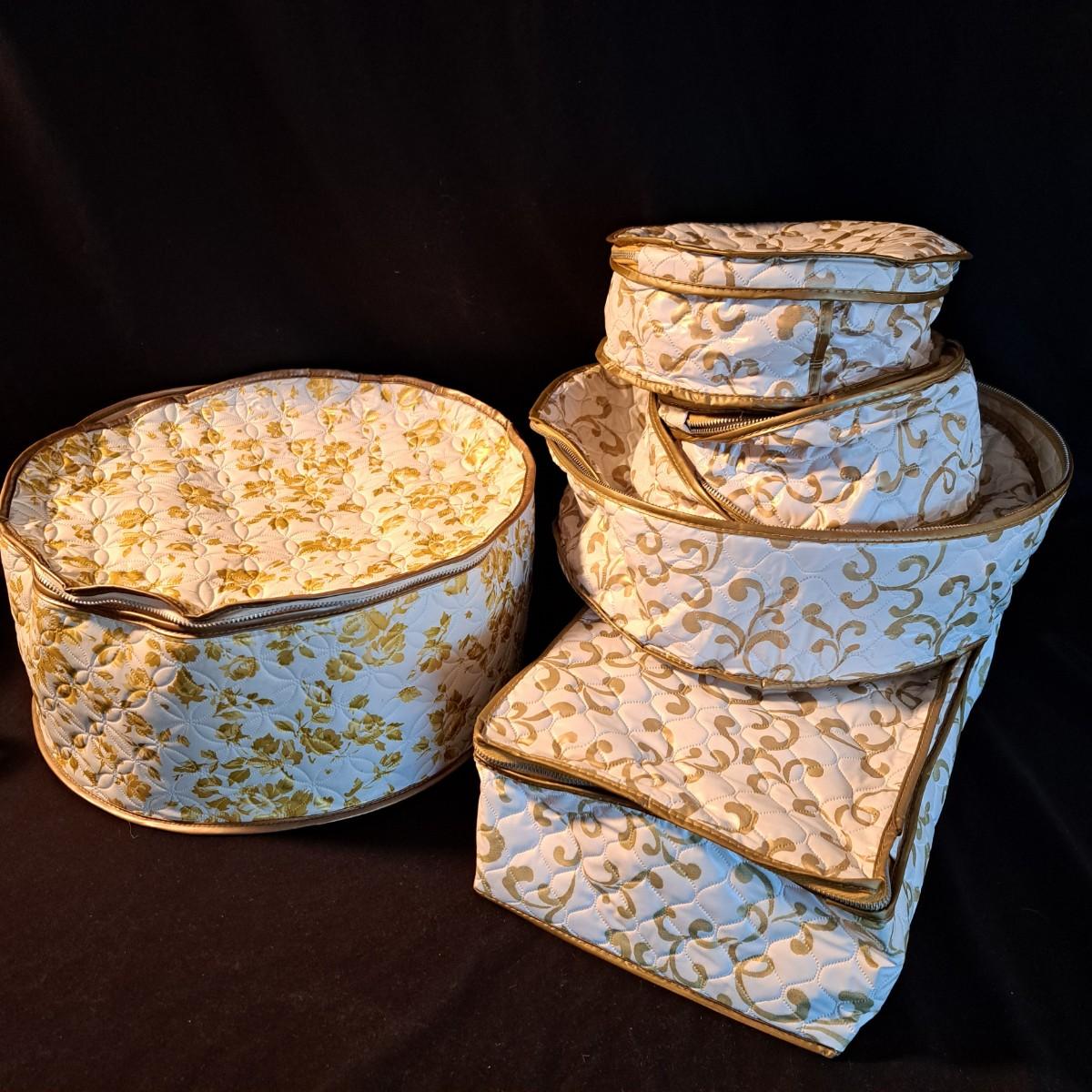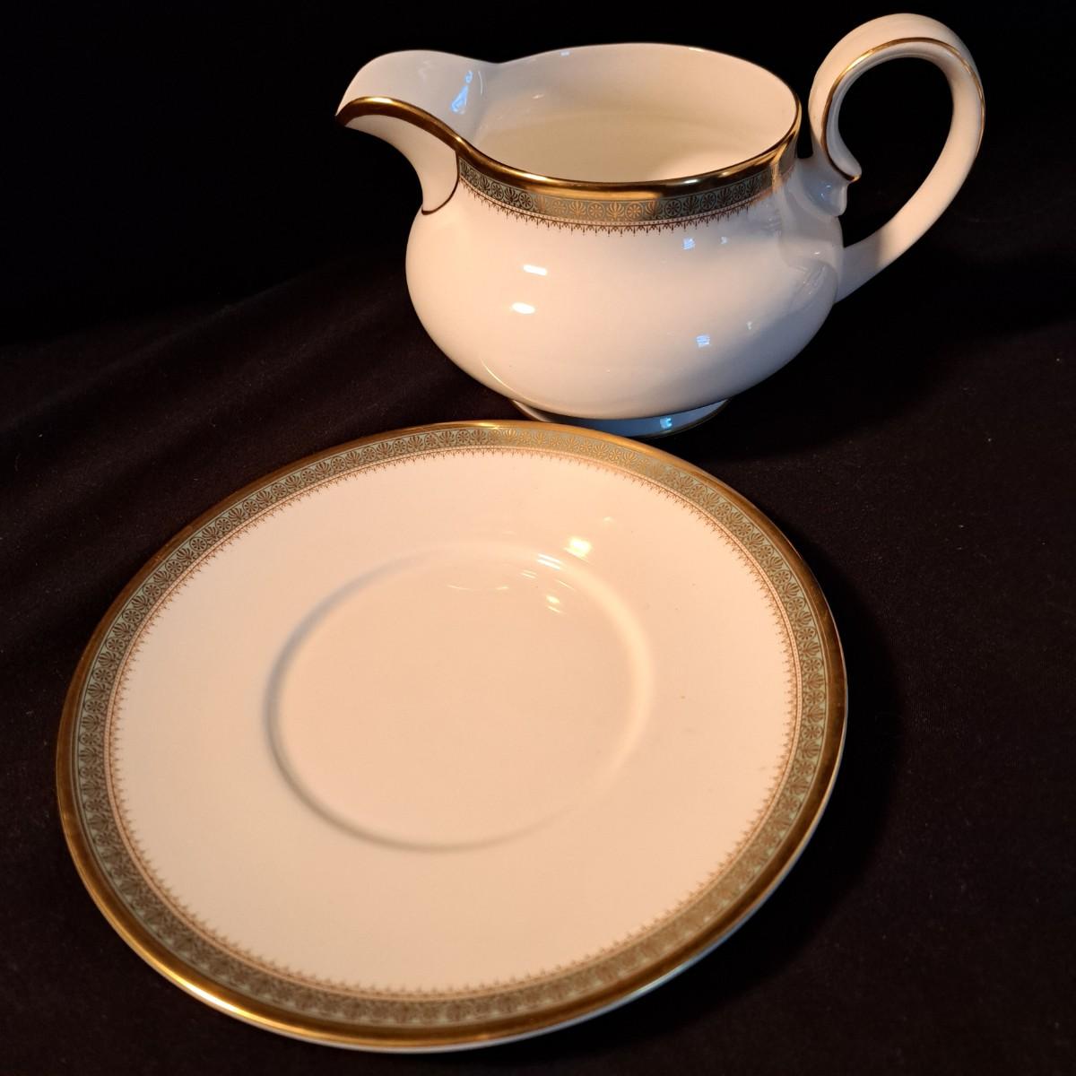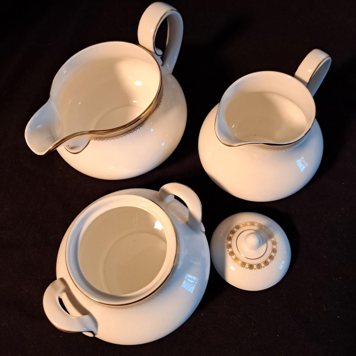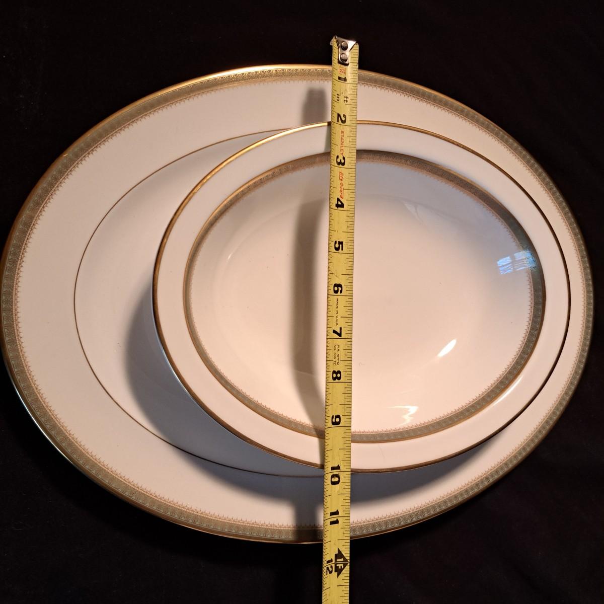 Lovely, well-cared for Royal Doulton 'Clarendon' china setting for 12, each piece rimmed with a gilt gold and turquoise filigree design. Includes extra saucers (*an additional 12) for teacups, 3 sizes of plates, two-handled soup bowls, large platter, lidded tureen, vegetable serving bowl, lidded sugar, creamer, gravy boat -- and more. See photos for measurements. Includes protective quilted care covers. Shipping available. Shipping can be costly. We suggest contacting our preferred local shipping provider, Postage Express, with dimensions and getting an estimate before bidding: (828) 255-9250 or shipping@postageexpressnc.com.