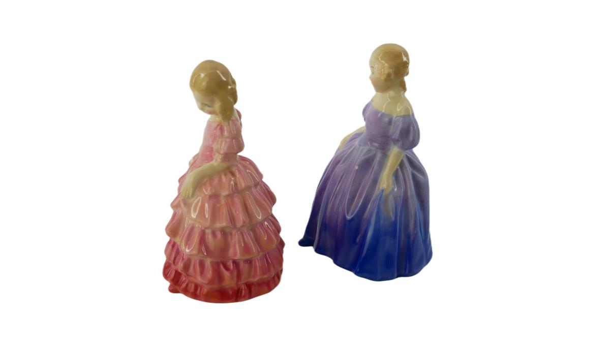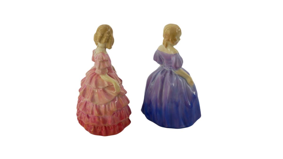 Two Royal Doulton figurines of women in Victorian style dresses. Purple dress marked "Marie". Small chip in dress is only visible defect. Pink dress marked "Rose HN 1368", repairs have been done to her neck and chip on dress. Please review all photos. Each measures H 4.75" x L 3". Weight of lot is 6 oz. (C8)
