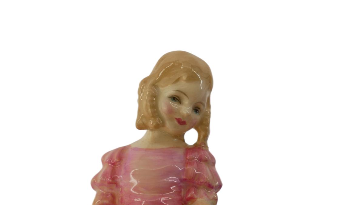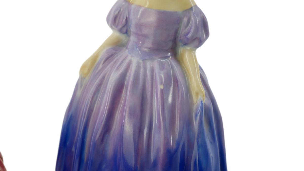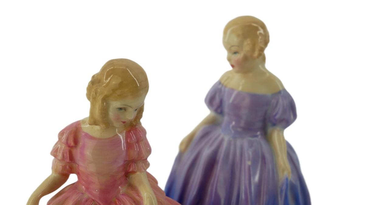 Two Royal Doulton figurines of women in Victorian style dresses. Purple dress marked "Marie". Small chip in dress is only visible defect. Pink dress marked "Rose HN 1368", repairs have been done to her neck and chip on dress. Please review all photos. Each measures H 4.75" x L 3". Weight of lot is 6 oz. (C8)
