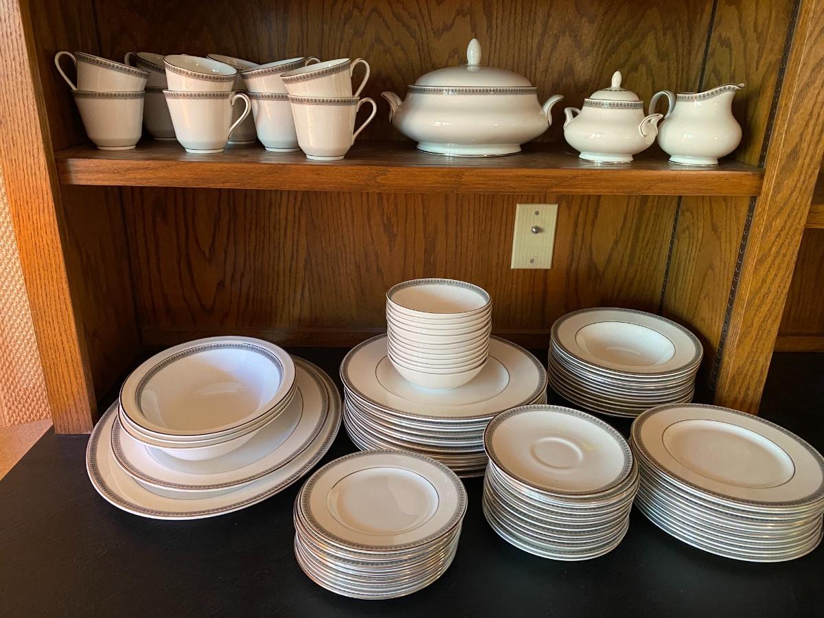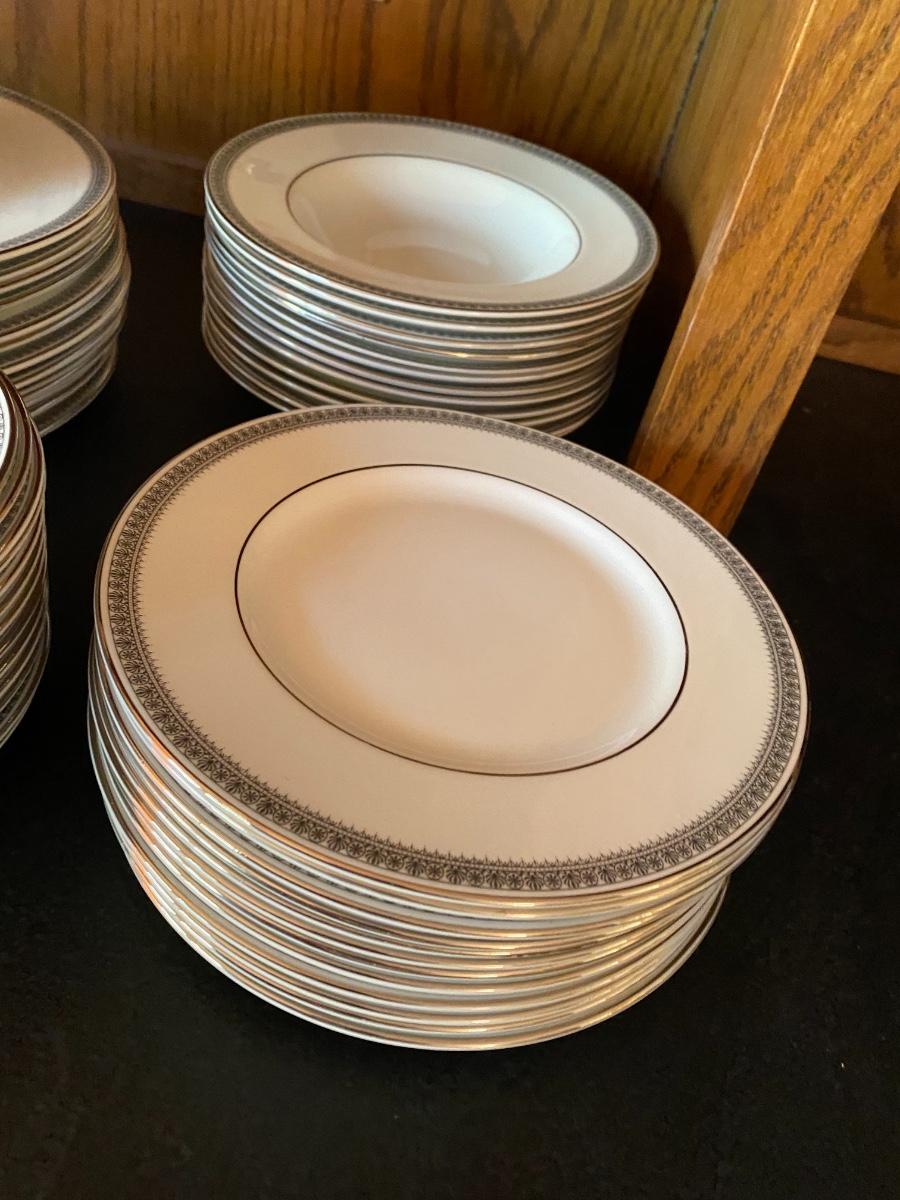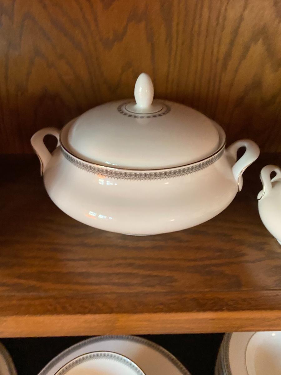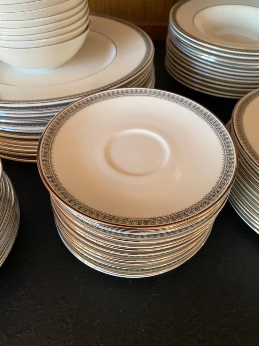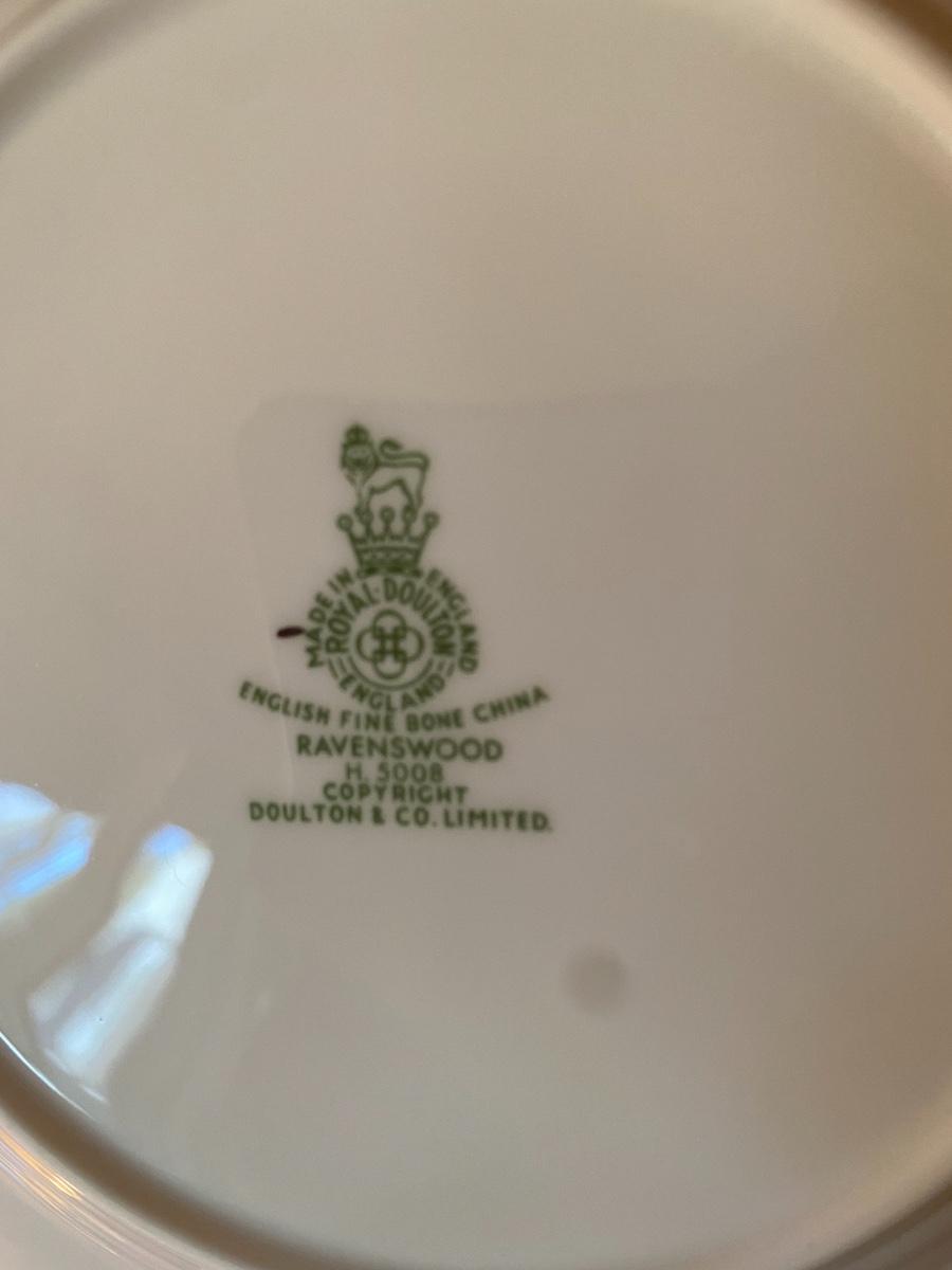 Ravenswood Pattern. Includes 12 dinner plates, 12 bread and butter plates, 13 Saucers, 12 coffee cups, 12 dessert plates, 12 soup bowls, 12 berry bowls, three serving bowls, two platters, one terrine and a creamer and sugar. Overall condition is very good. One tiny chip found to the edge of a saucer. All as is. All in den. If shipped, then this item will be packed and shipped by UPS at the cost to the buyer.
