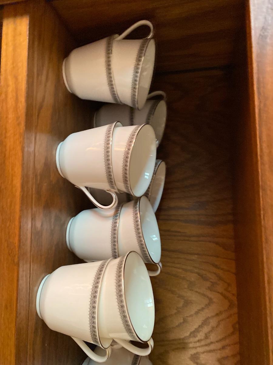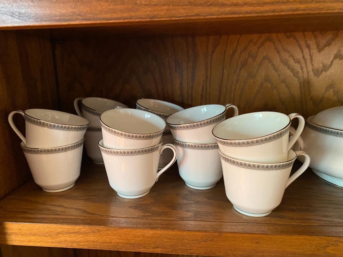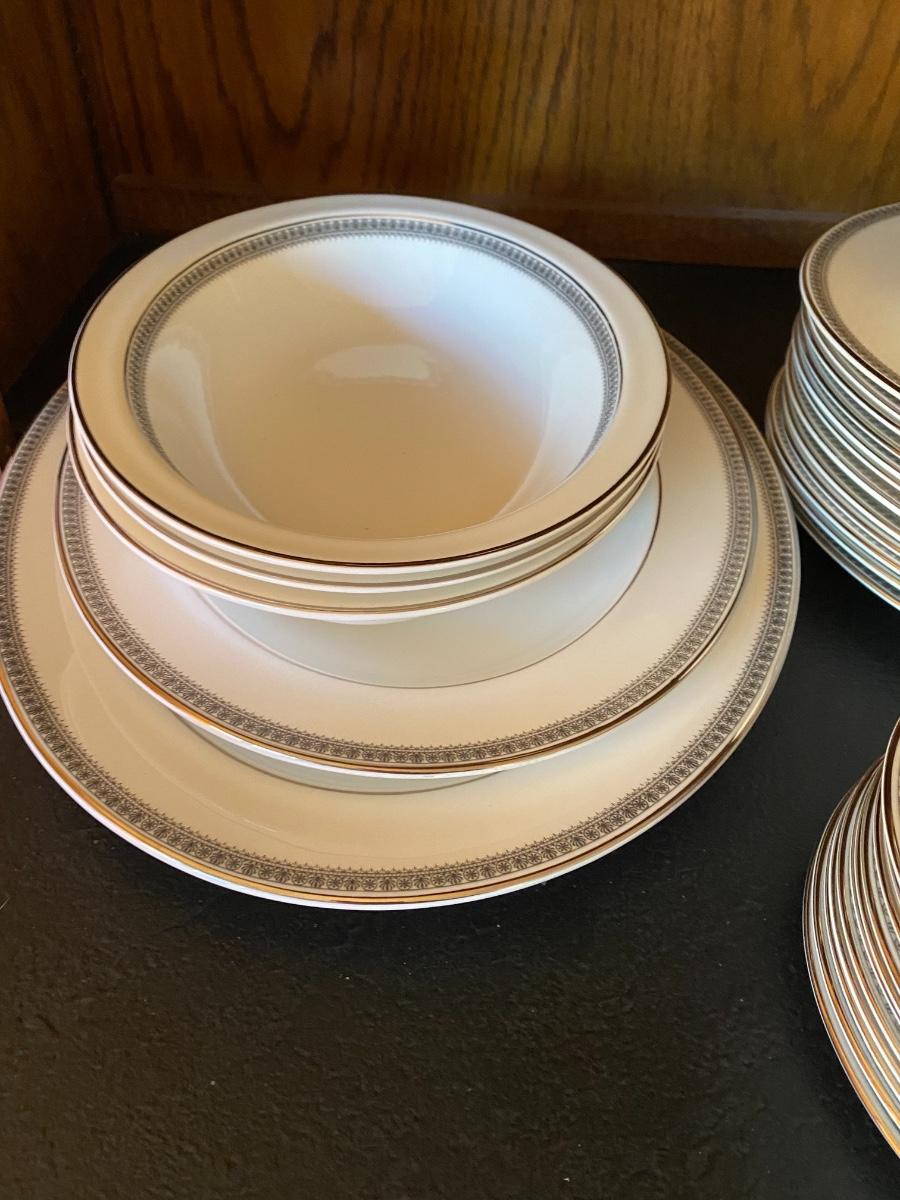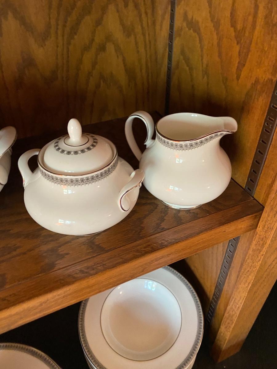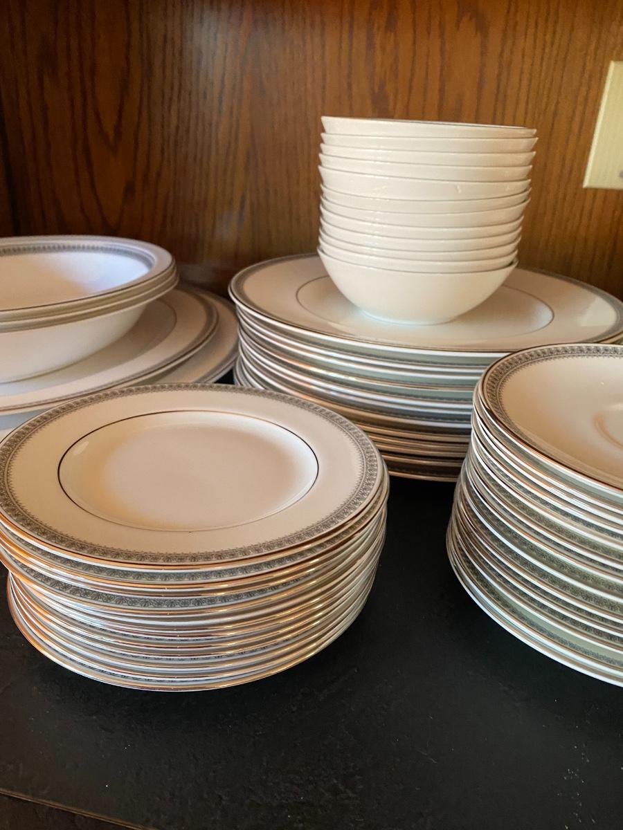 Ravenswood Pattern. Includes 12 dinner plates, 12 bread and butter plates, 13 Saucers, 12 coffee cups, 12 dessert plates, 12 soup bowls, 12 berry bowls, three serving bowls, two platters, one terrine and a creamer and sugar. Overall condition is very good. One tiny chip found to the edge of a saucer. All as is. All in den. If shipped, then this item will be packed and shipped by UPS at the cost to the buyer.