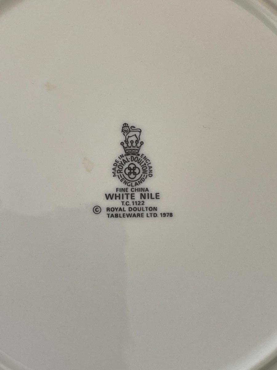 Royal Doulton fine china. Pattern is White Nile. Service for 12 minus one teacup. Set includes 12 Dinner Plates, 12 salad plates, 12 saucers and 11 cups.