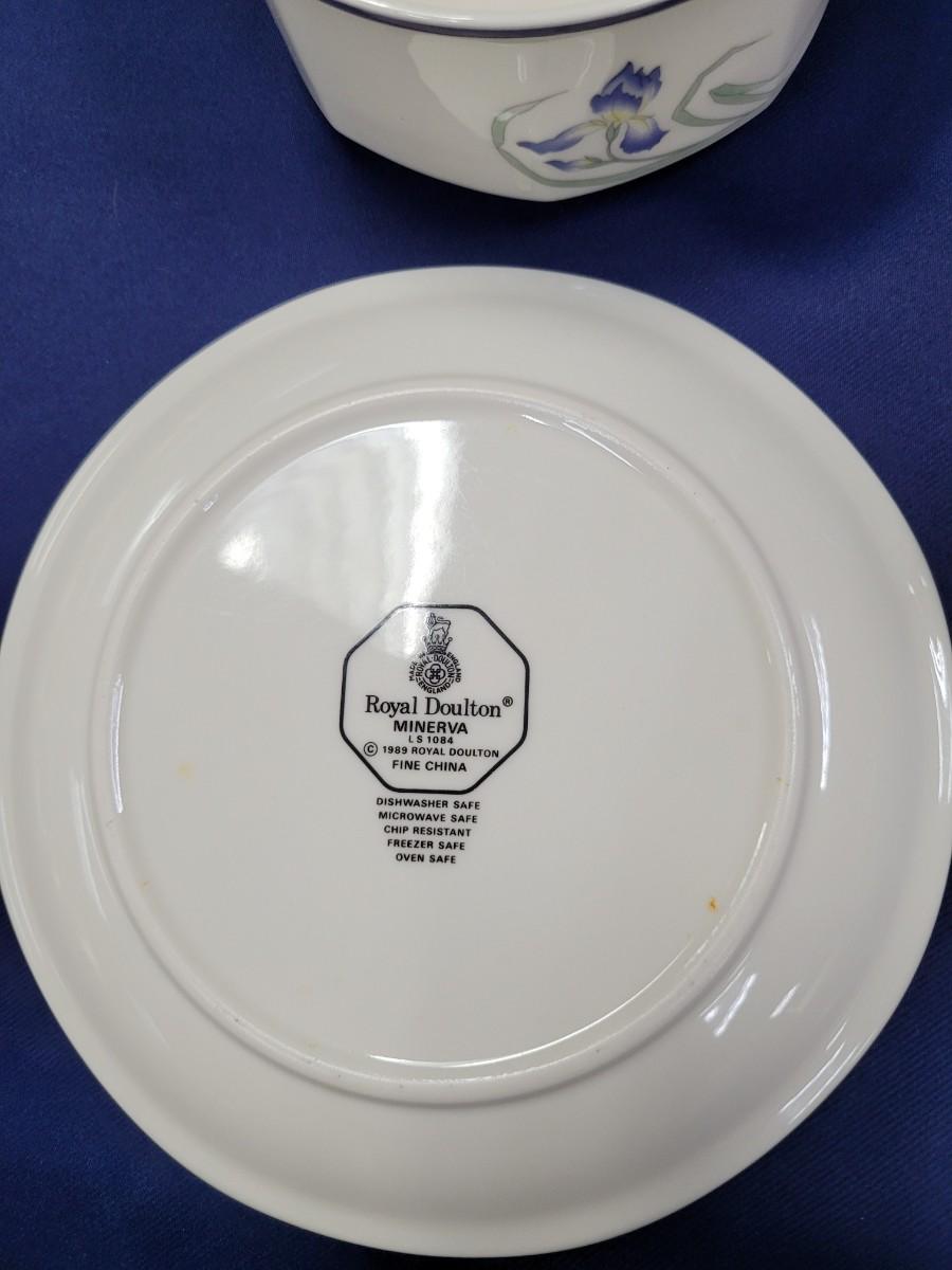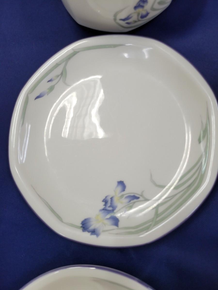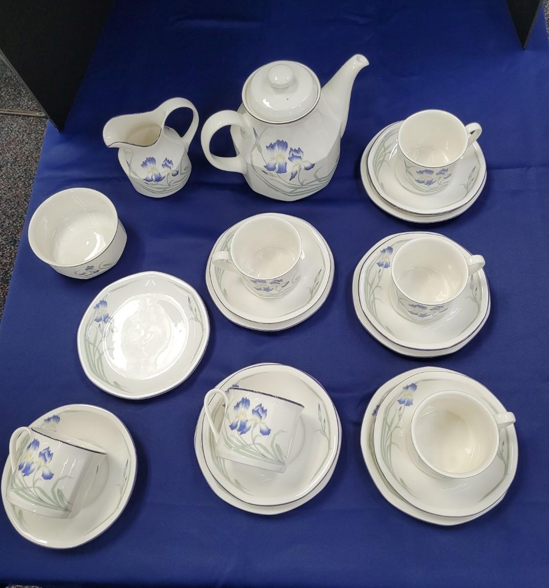 Service for 6, in very nice condition, looks new, with a lovely Iris pattern. Dishwasher safe, Microwave safe, chip resistant, freezer safe, oven safe. It's hard to find all those features these days. Includes teapot, creamer, sugar bowl, 6 each dessert plates, cup, and saucer.