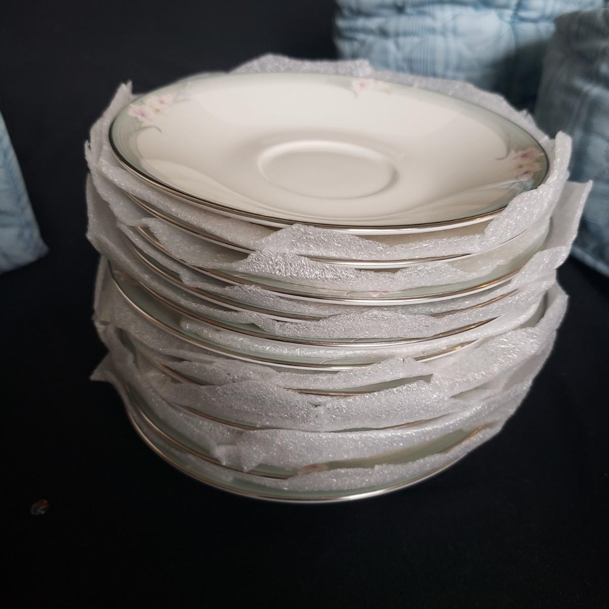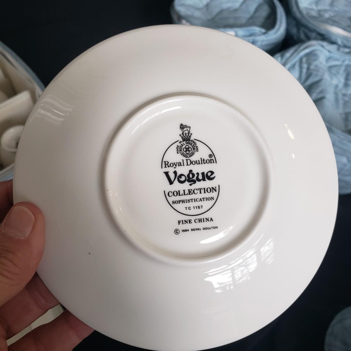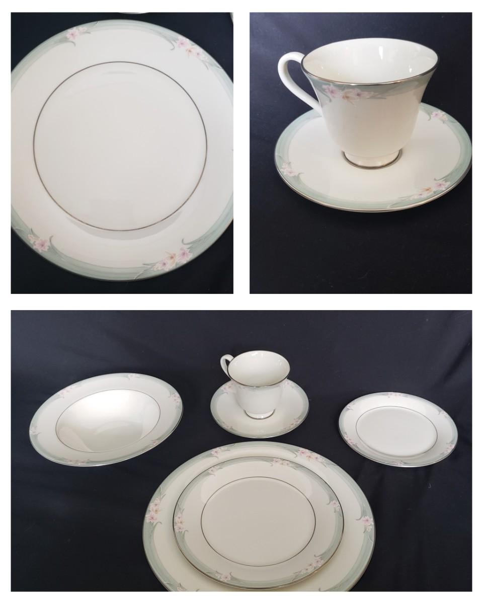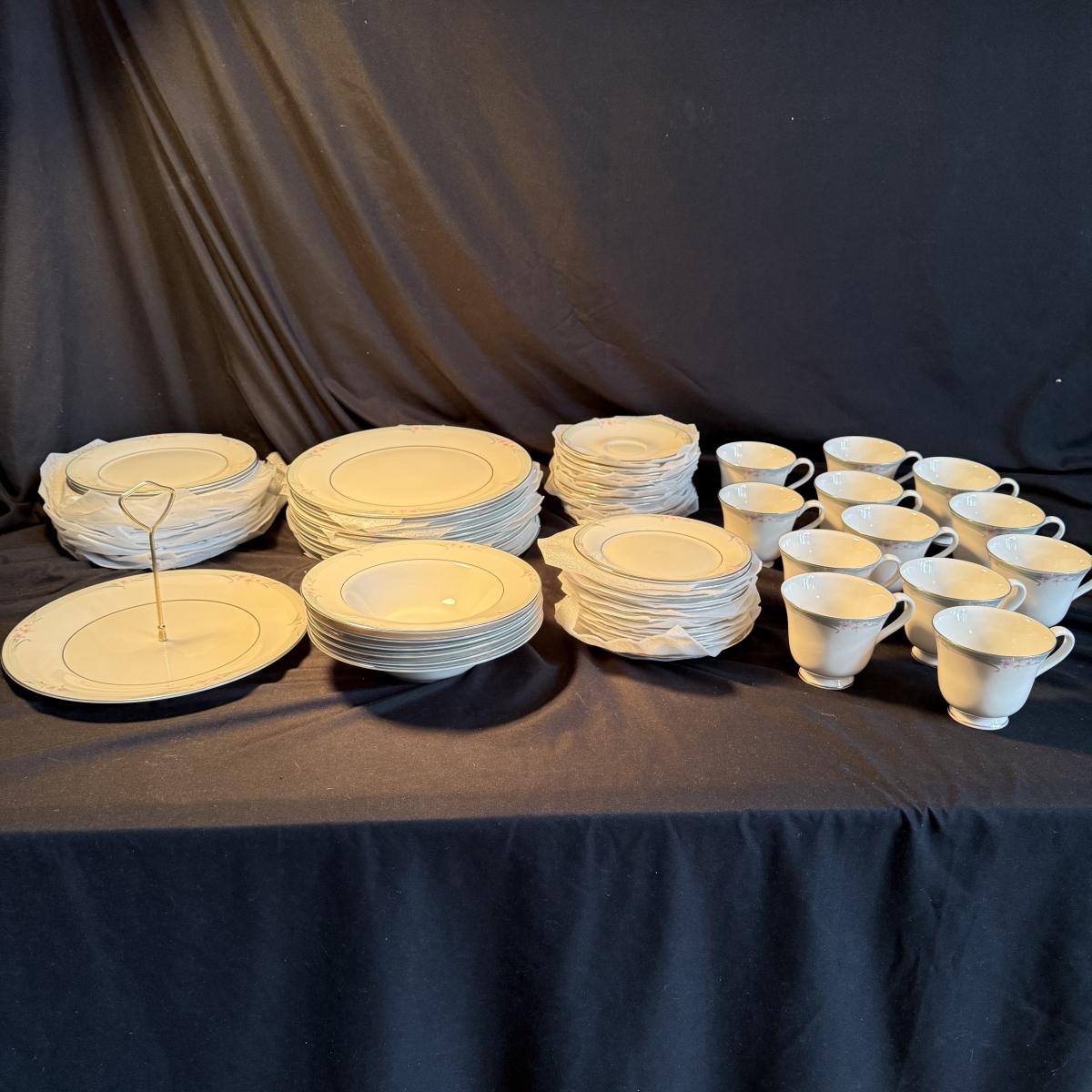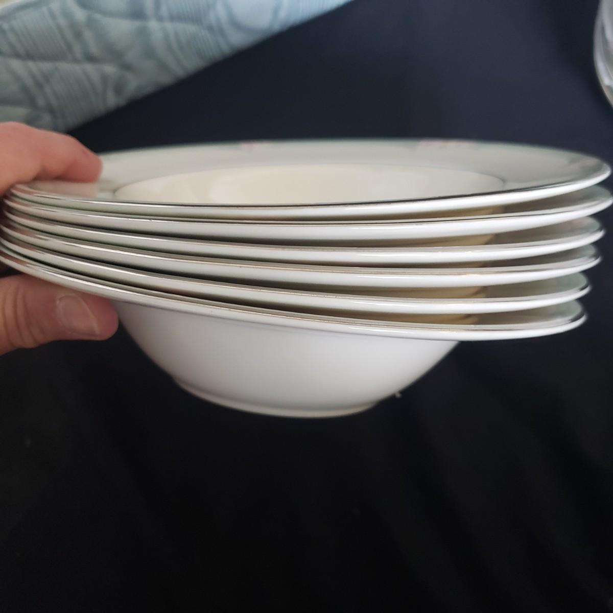 This Royal Doulton China set is their Sophistication pattern. The set contains 12 dinner plates with a 10"D, 13 salad plates, 12 dessert plates, 6 bowls, a serving plate with handle and 12 teacups and saucers. One bowl has some red residue from the bag they were kept it, see picture, otherwise all dishes appear to be blemish free- please come to preview to verify.