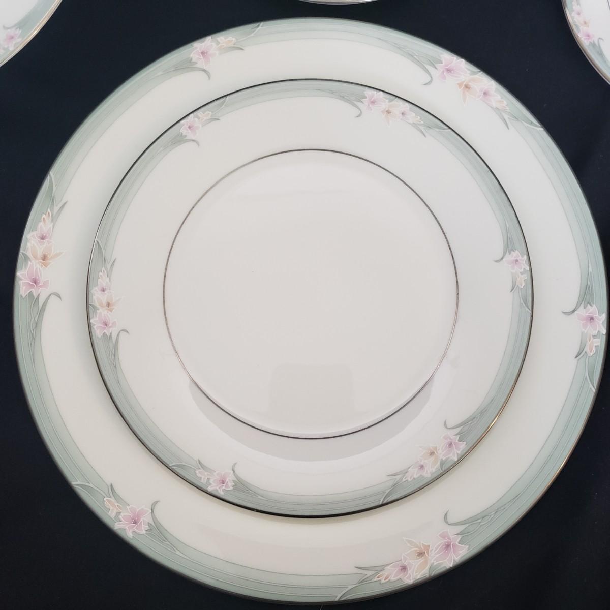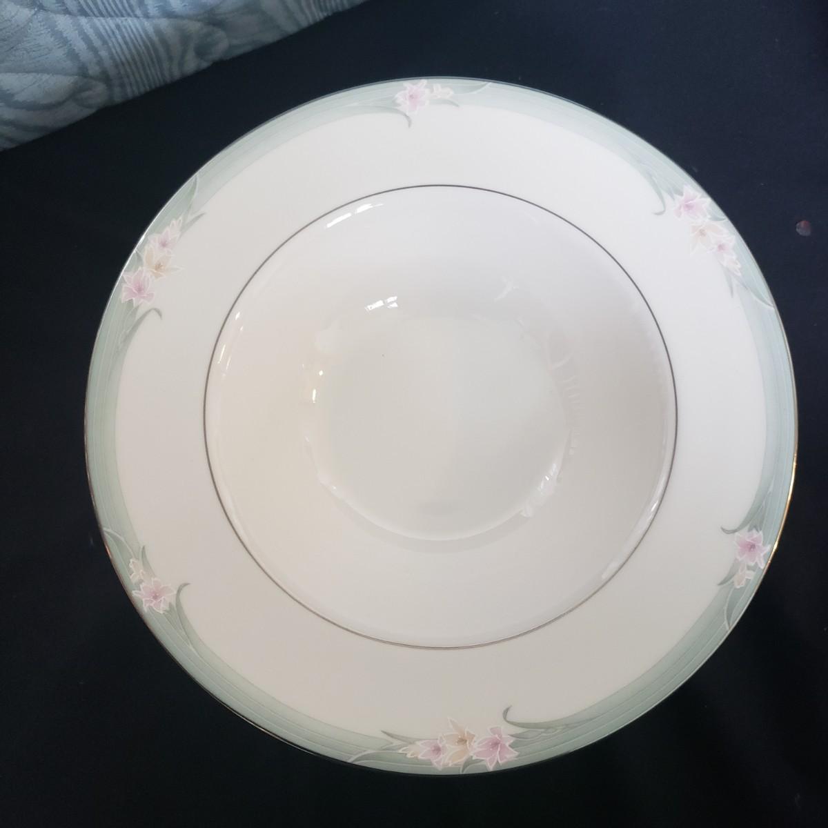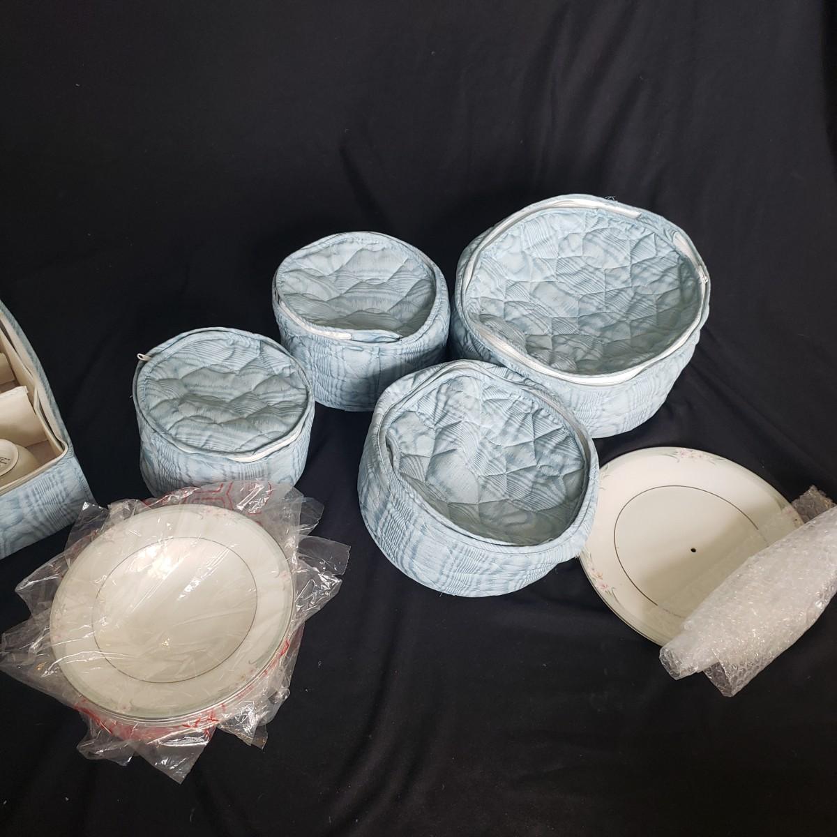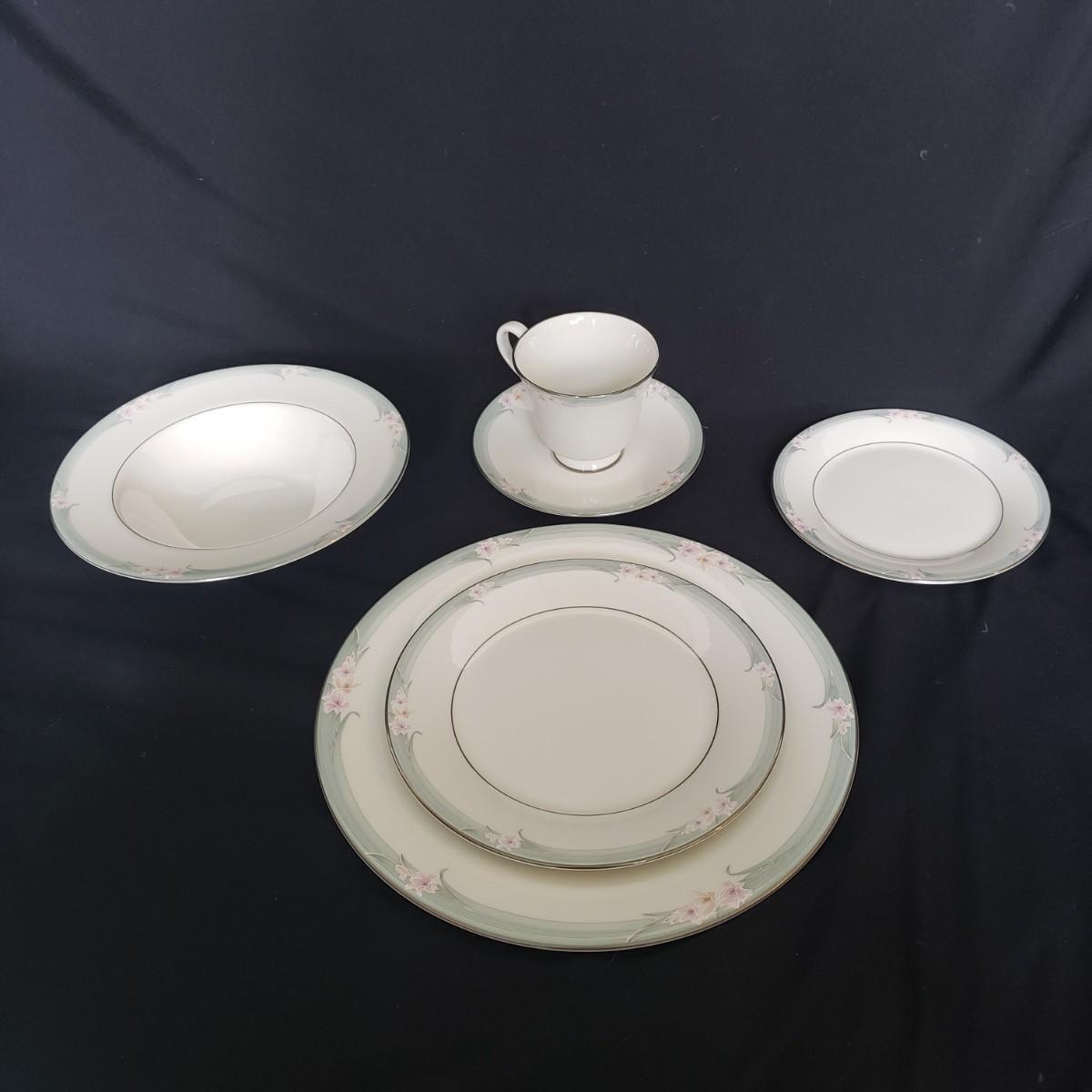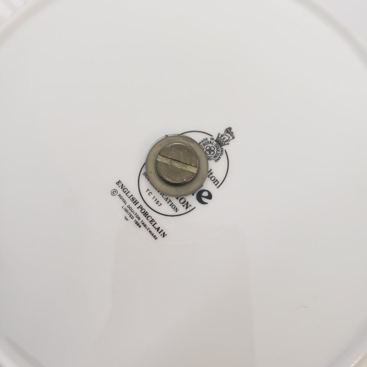 This Royal Doulton China set is their Sophistication pattern. The set contains 12 dinner plates with a 10"D, 13 salad plates, 12 dessert plates, 6 bowls, a serving plate with handle and 12 teacups and saucers. One bowl has some red residue from the bag they were kept it, see picture, otherwise all dishes appear to be blemish free- please come to preview to verify.