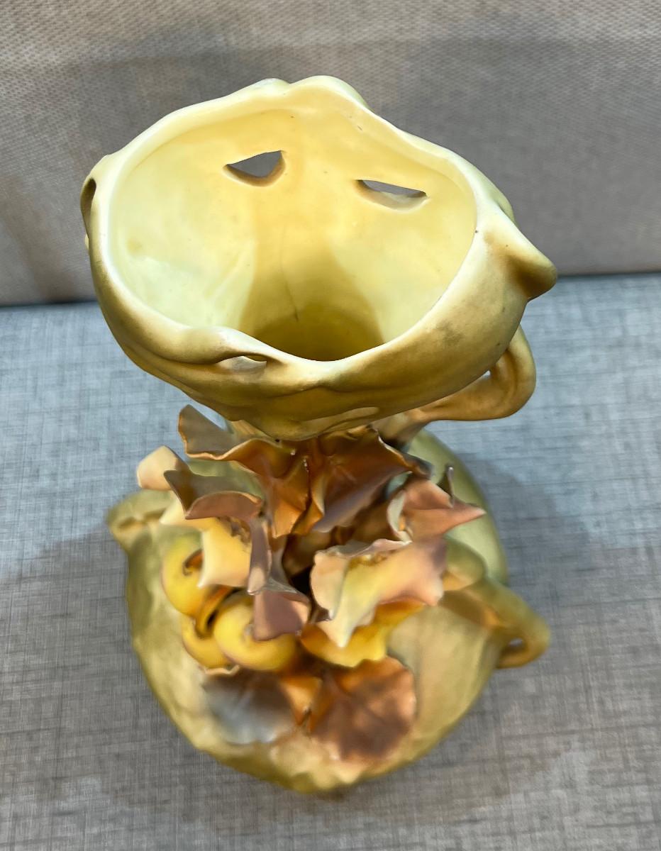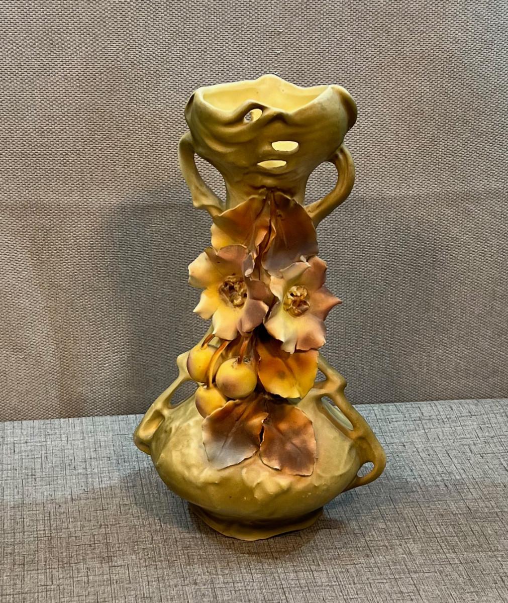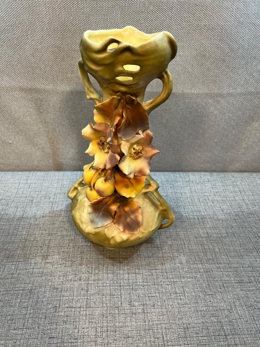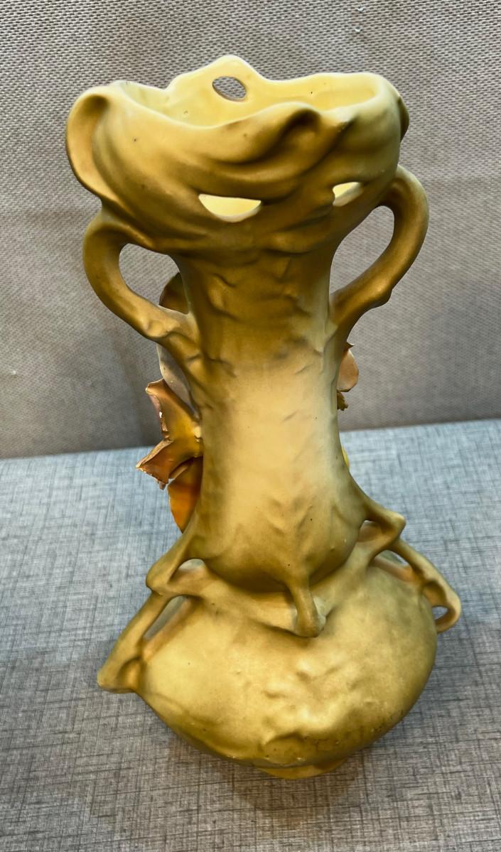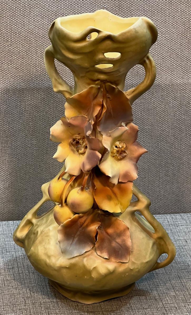 Art Nouveau period vase 13" tall most likely Royal Dux. Small chip on one of the leaves, mat finish german porcelain c.1900.