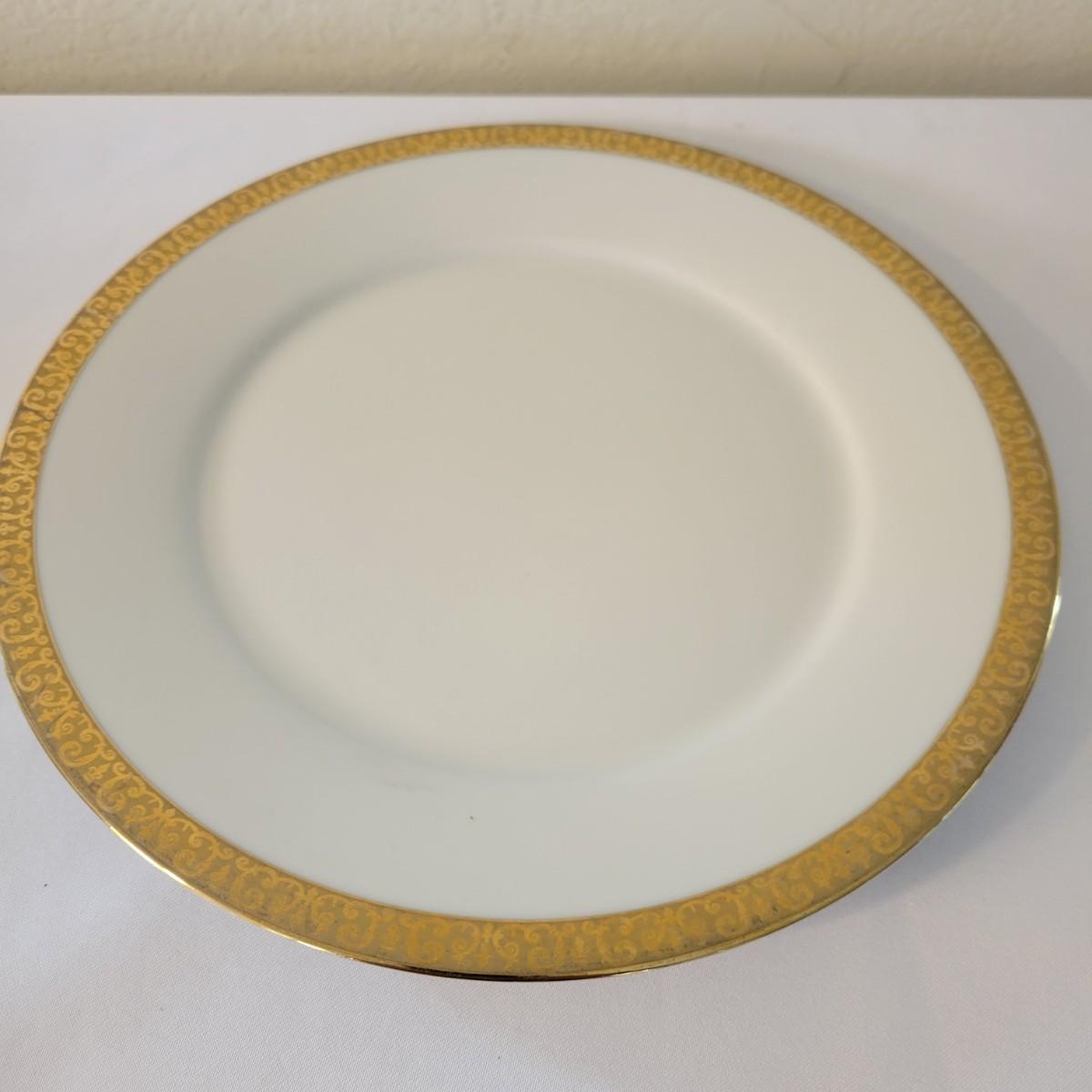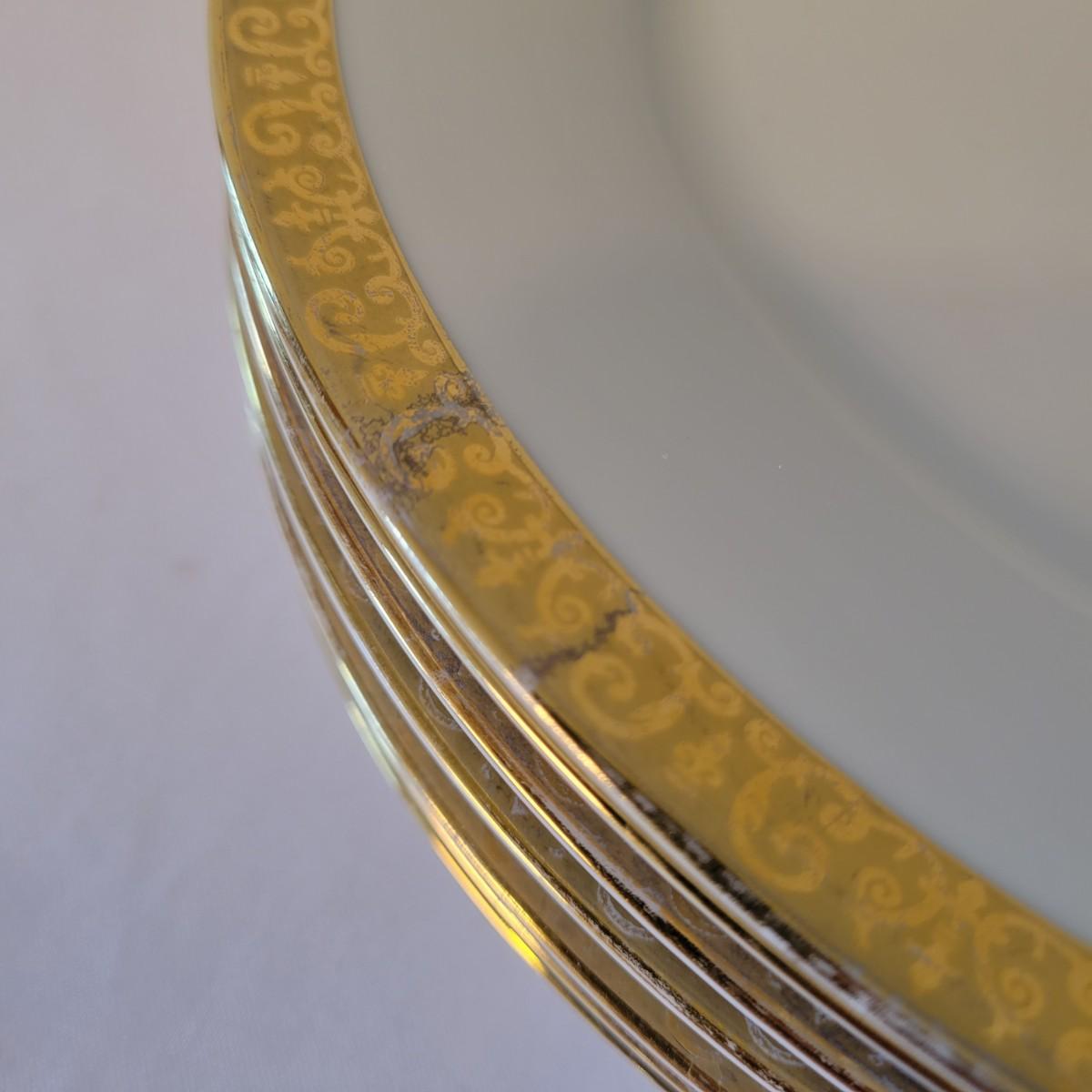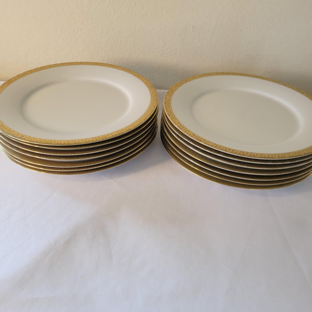 A collection of 14 plates in good condition, but with some minor blemishes. The plates are manufactured in Sri Lanka by Royal Gallery. Each plate is white with a decorative gold edge. Plates measure approximately 11"D. Shipping available. Shipping can be costly. We suggest calling our local UPS with dimensions and getting an estimate before bidding: (828) 252-6930.