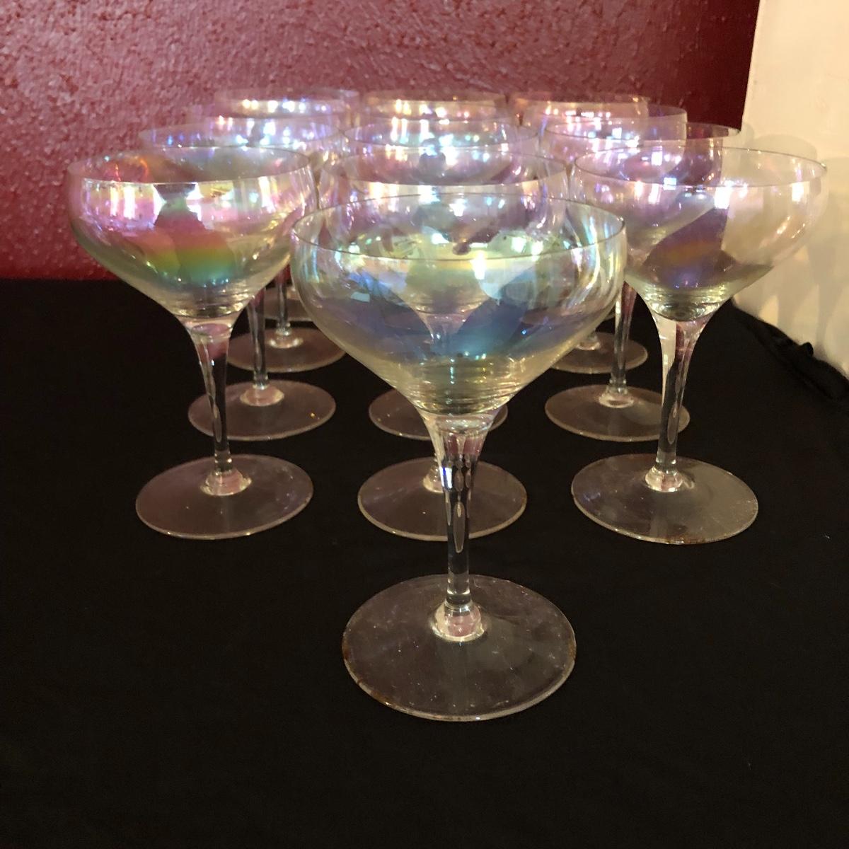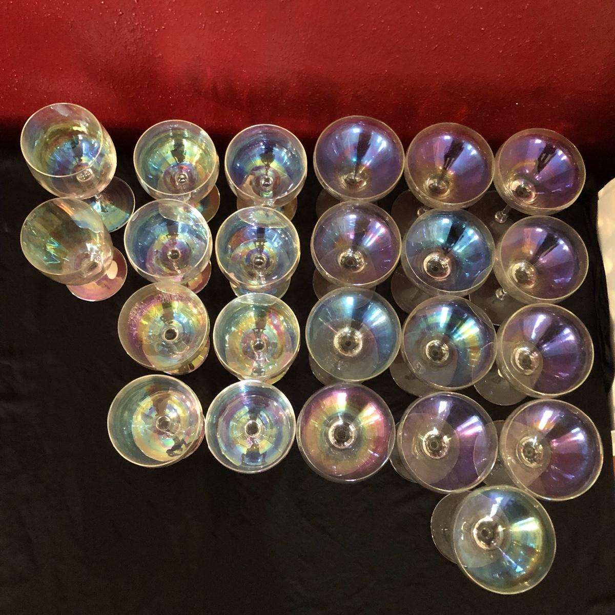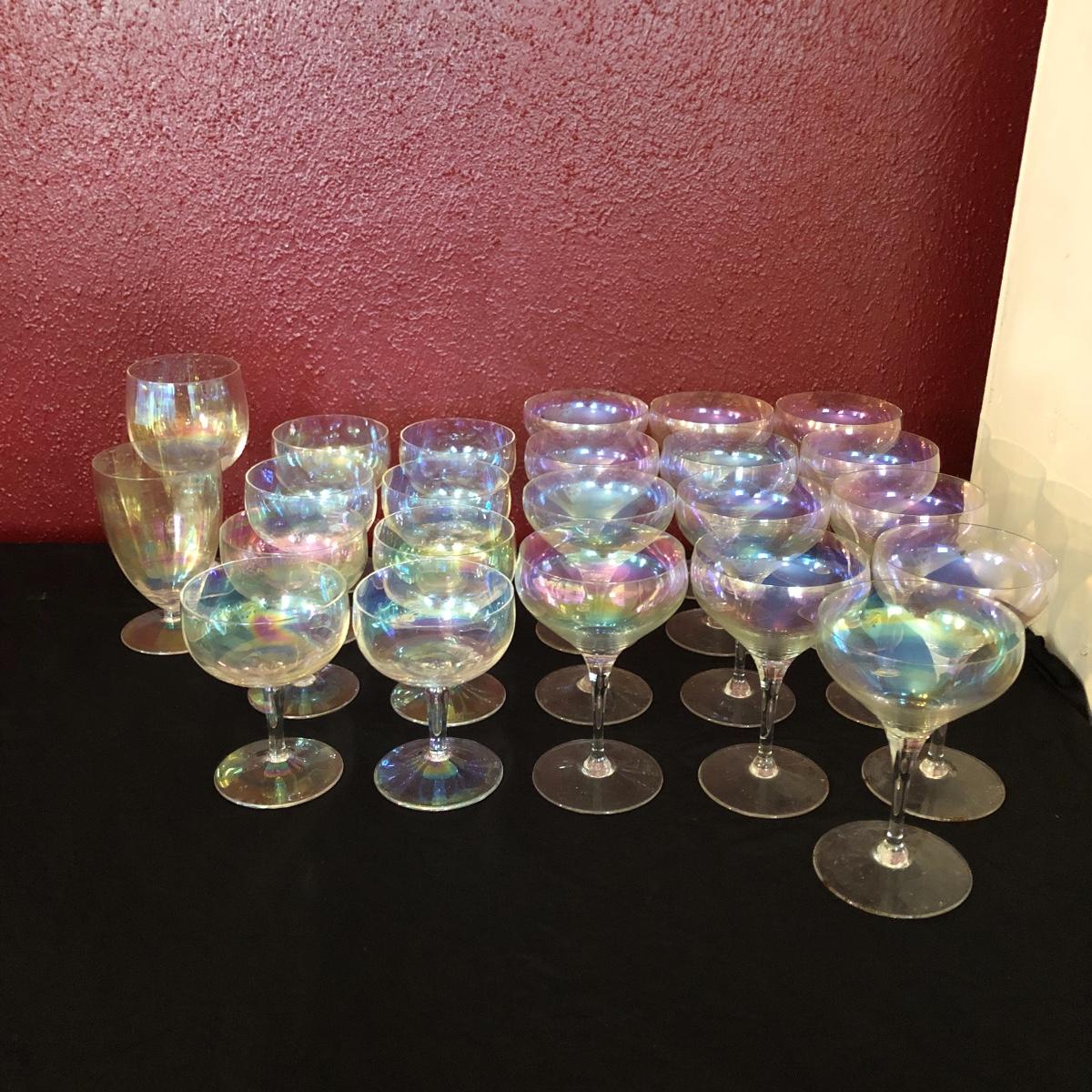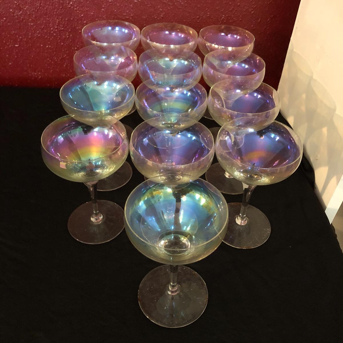 Lot features Royal Moselle iridescent stemware that includes thirteen coupes, eight s herbert glasses and two assorted glasses. Tallest glass measures 3”D x 6.75”.