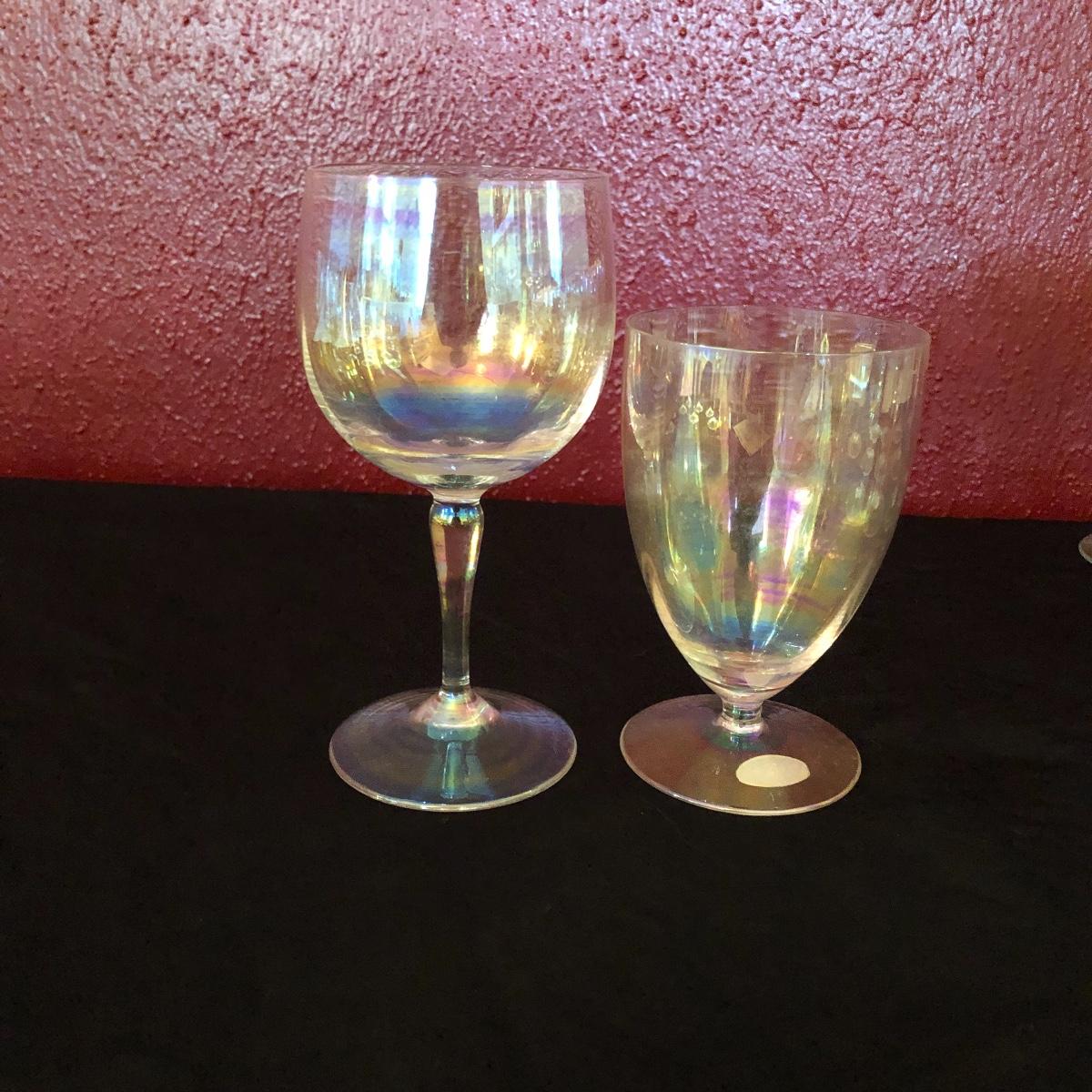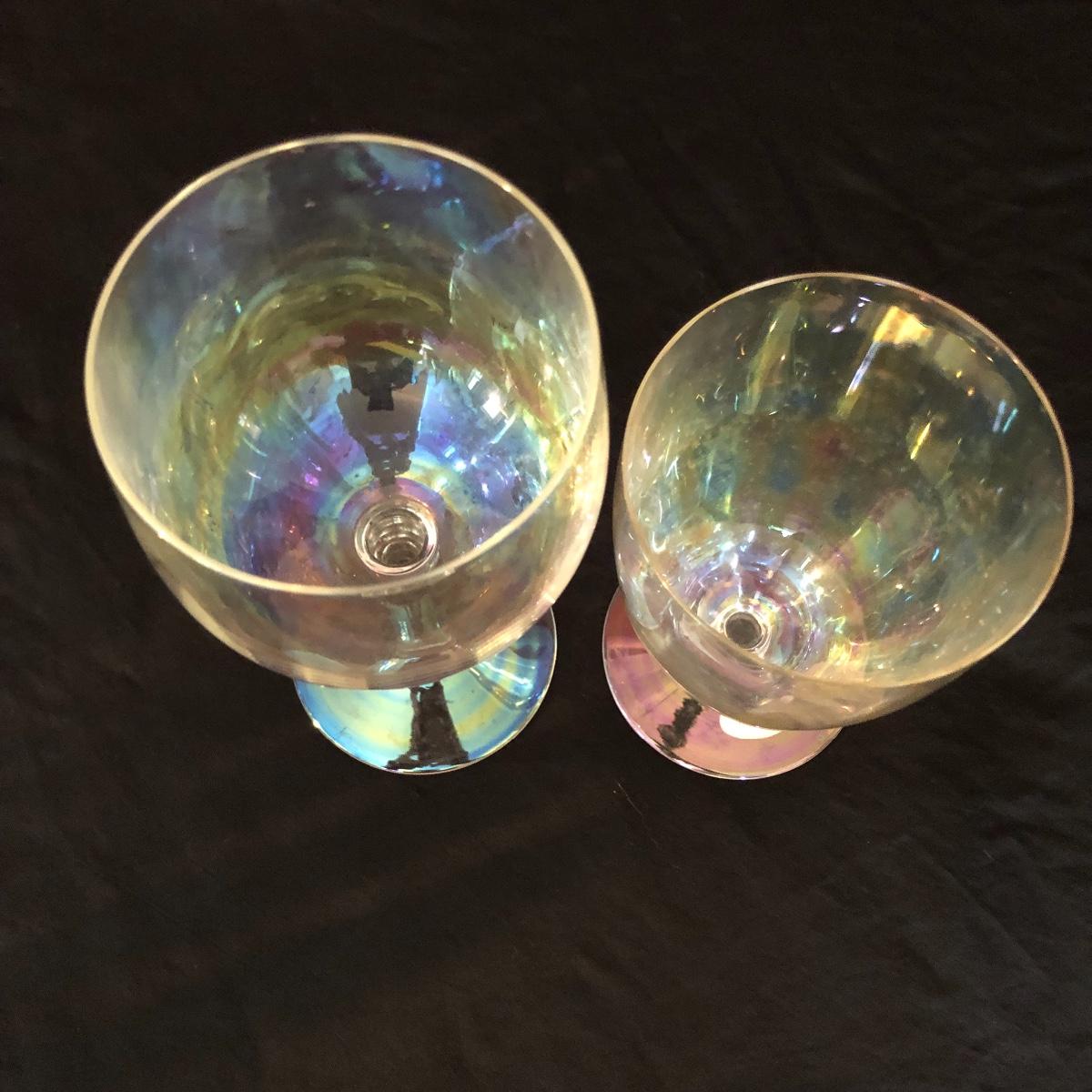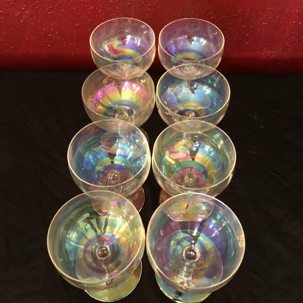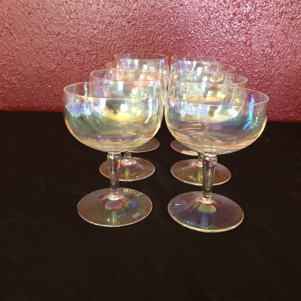 Lot features Royal Moselle iridescent stemware that includes thirteen coupes, eight s herbert glasses and two assorted glasses. Tallest glass measures 3”D x 6.75”.