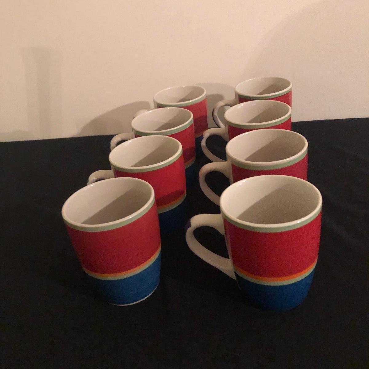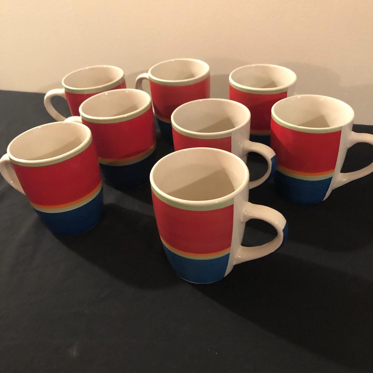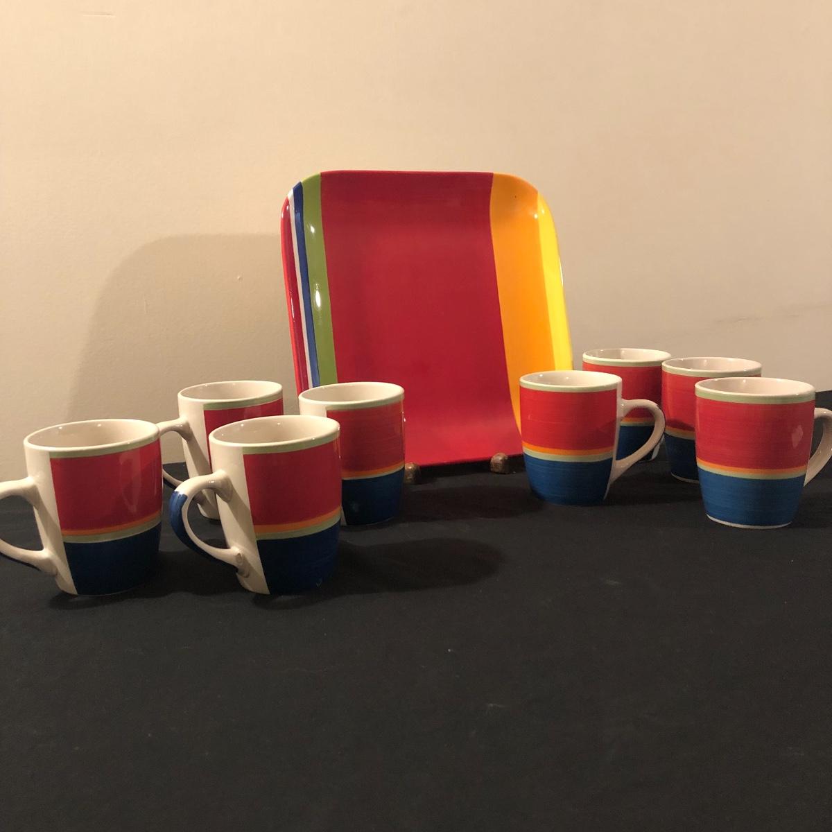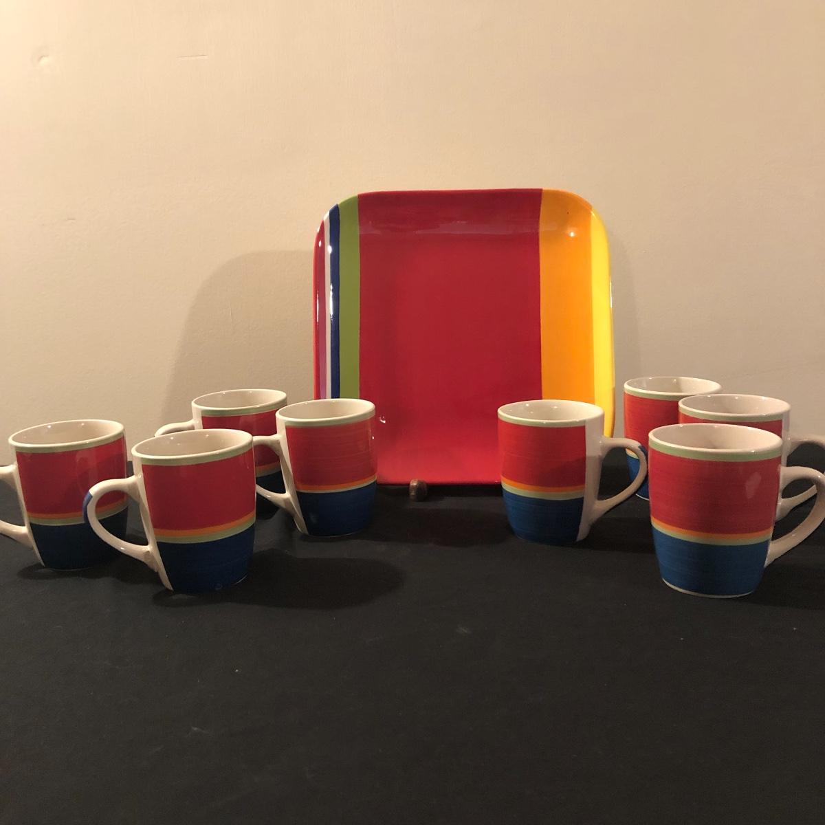There are eight ceramic coffee cups and one ceramic platter. The platter measures 11.5” x 11.5”. There are no chips on the coffee cups or platter. Shipping Available.