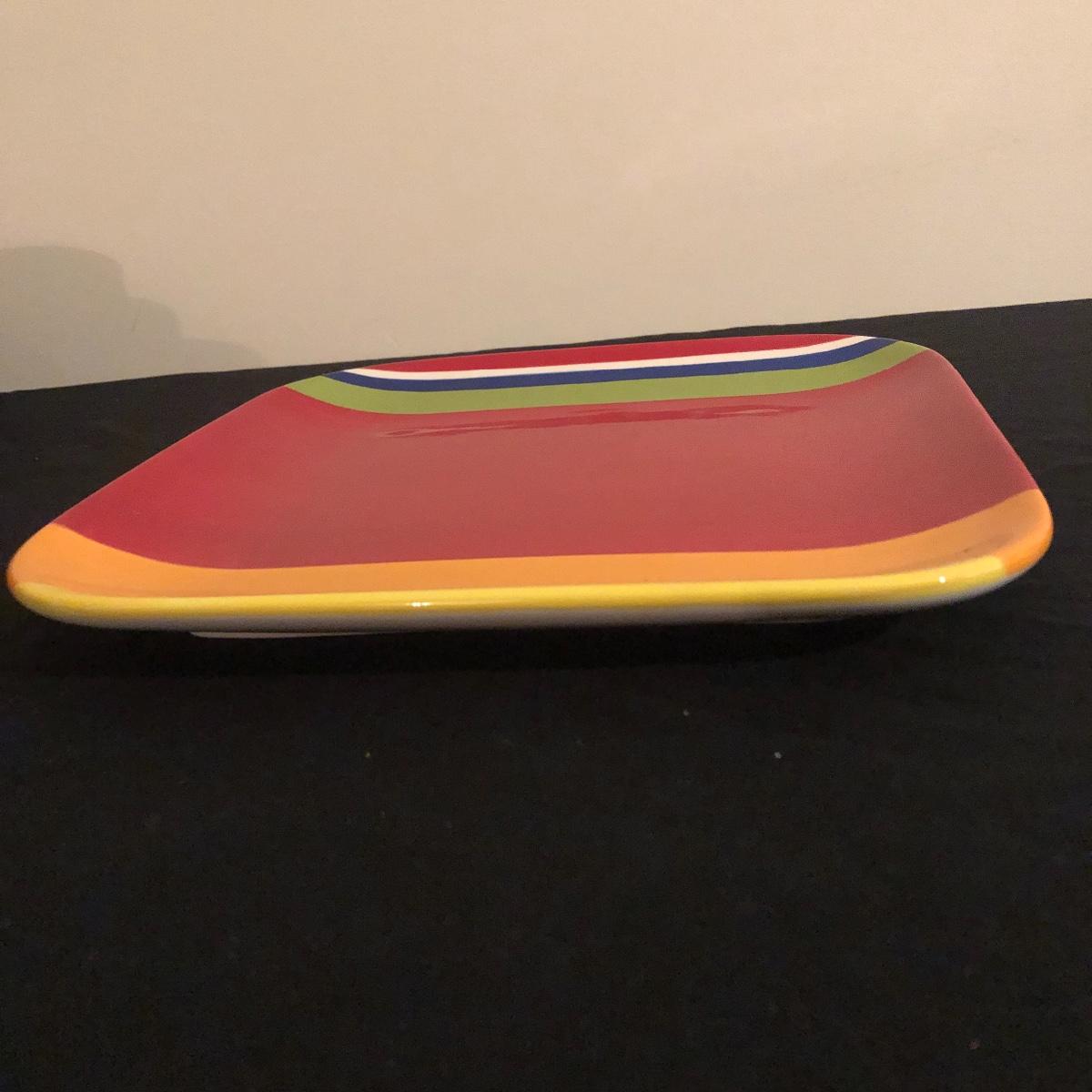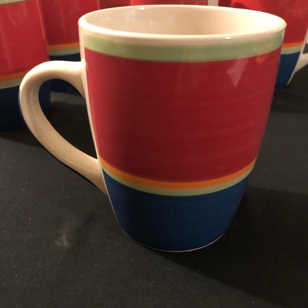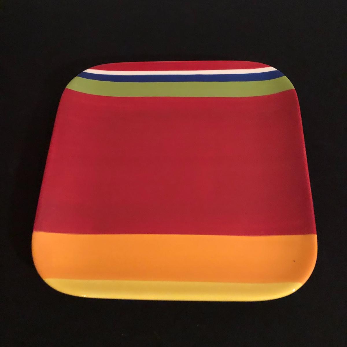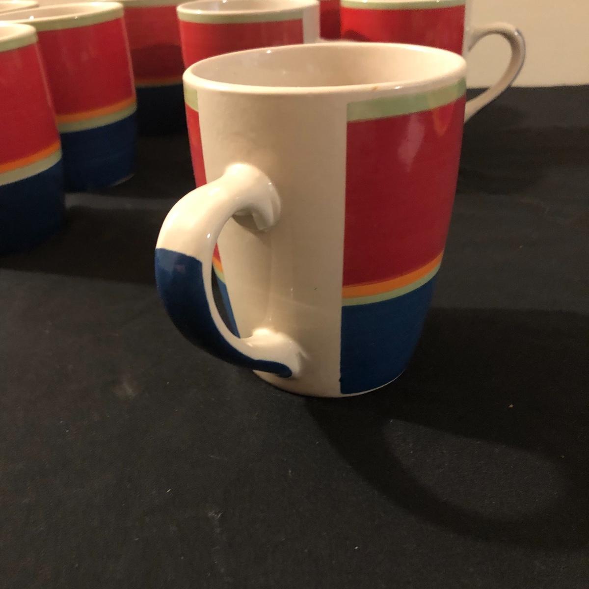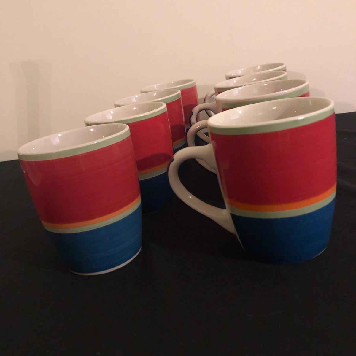 There are eight ceramic coffee cups and one ceramic platter. The platter measures 11.5” x 11.5”. There are no chips on the coffee cups or platter. Shipping Available.
