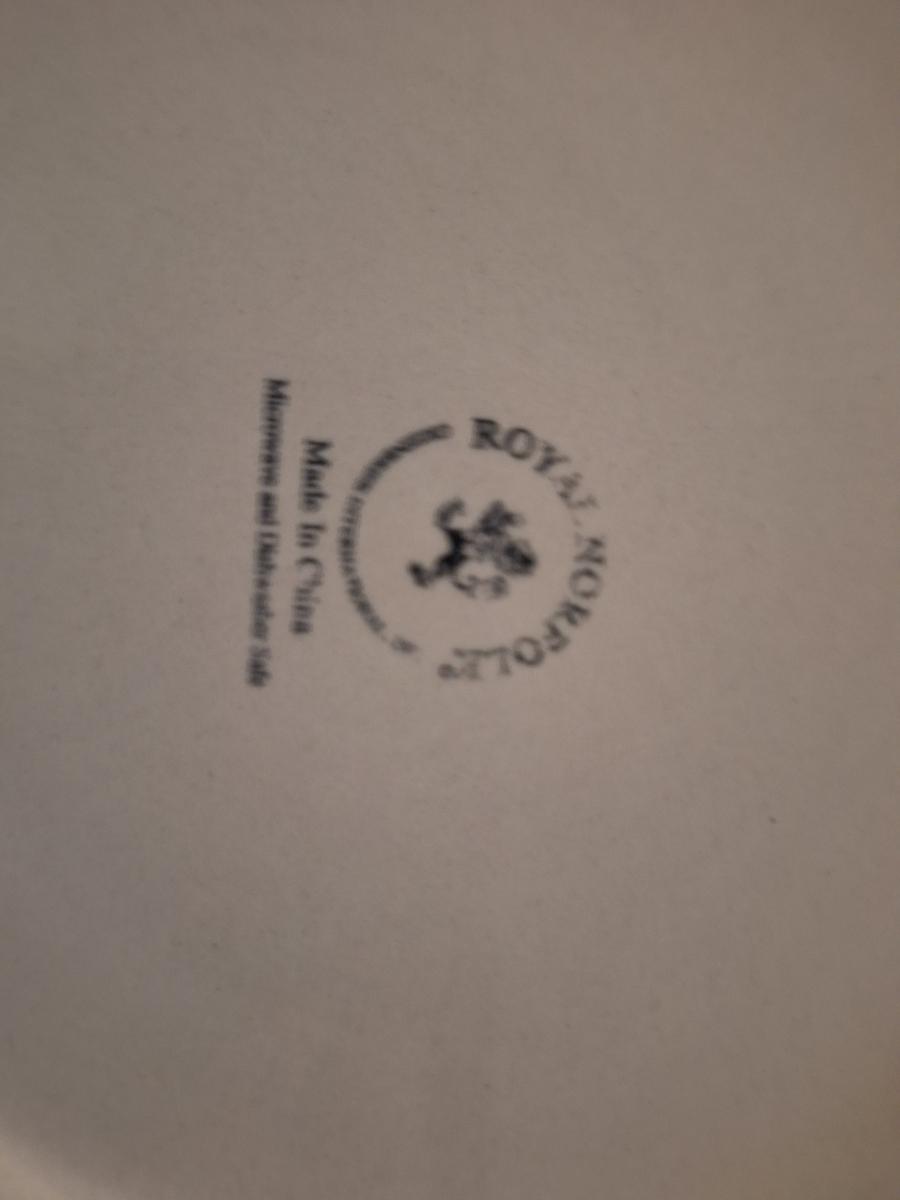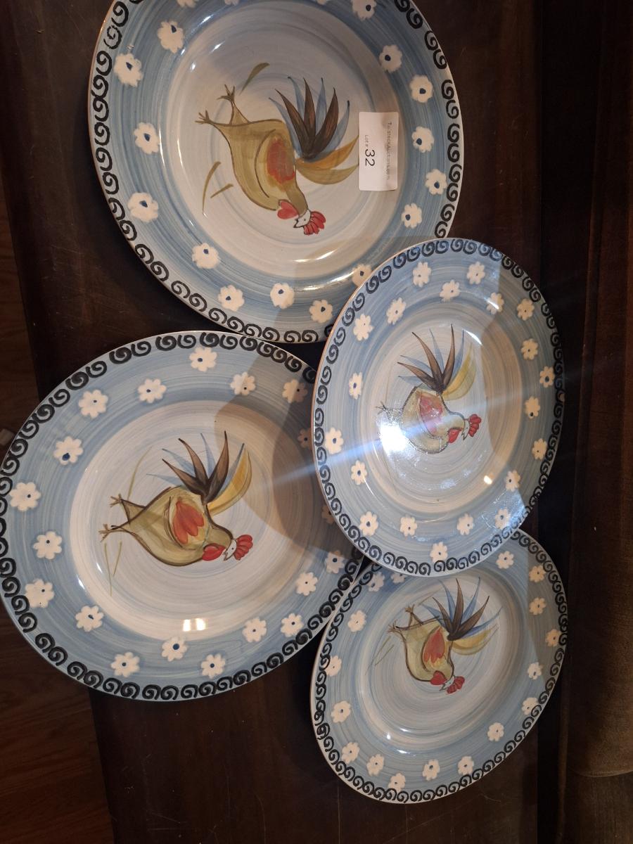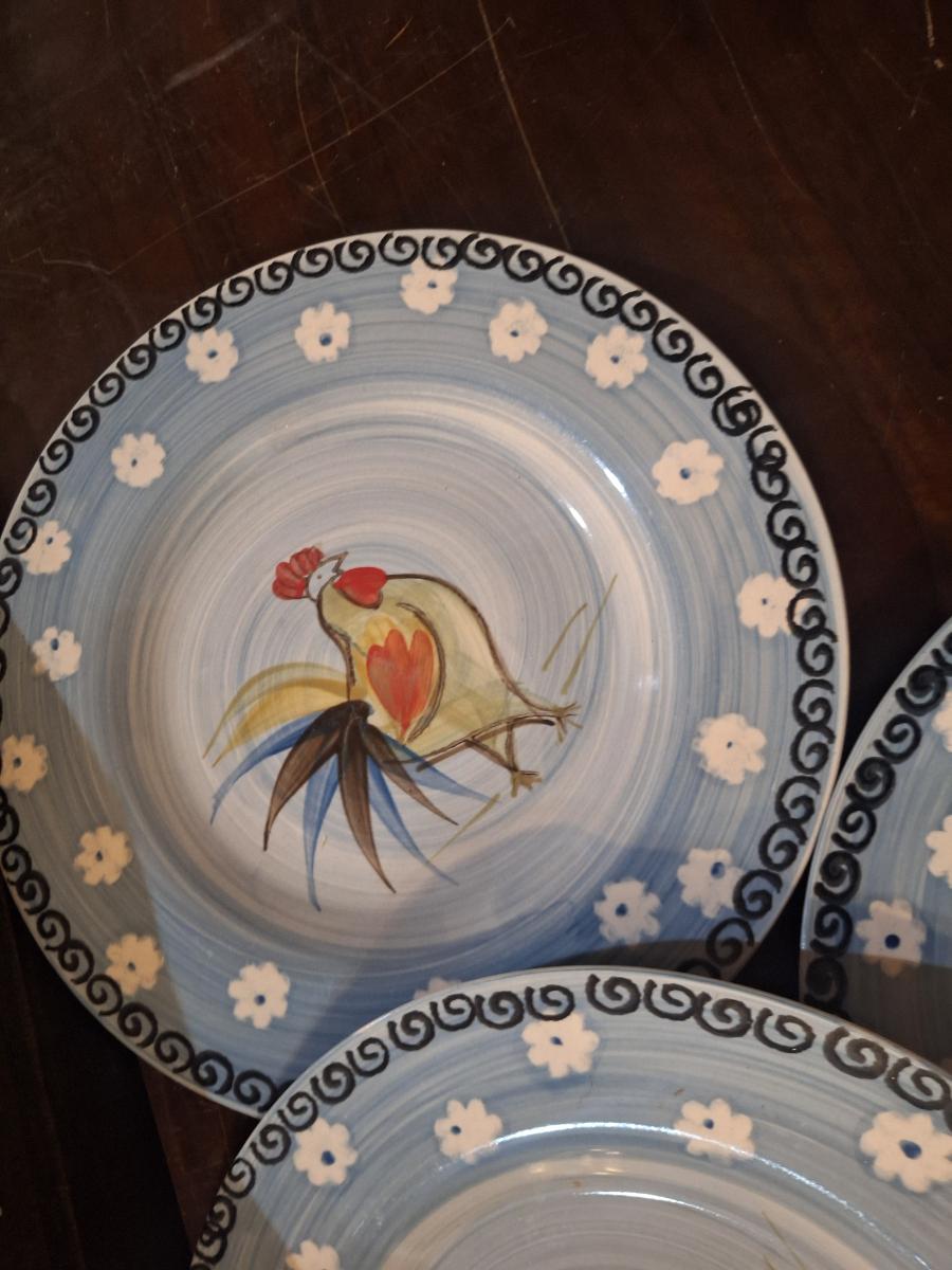 Royal Norfolk hand-painted ceramic rooster dinner plates featuring a blue band and white dot pattern. Set of 5