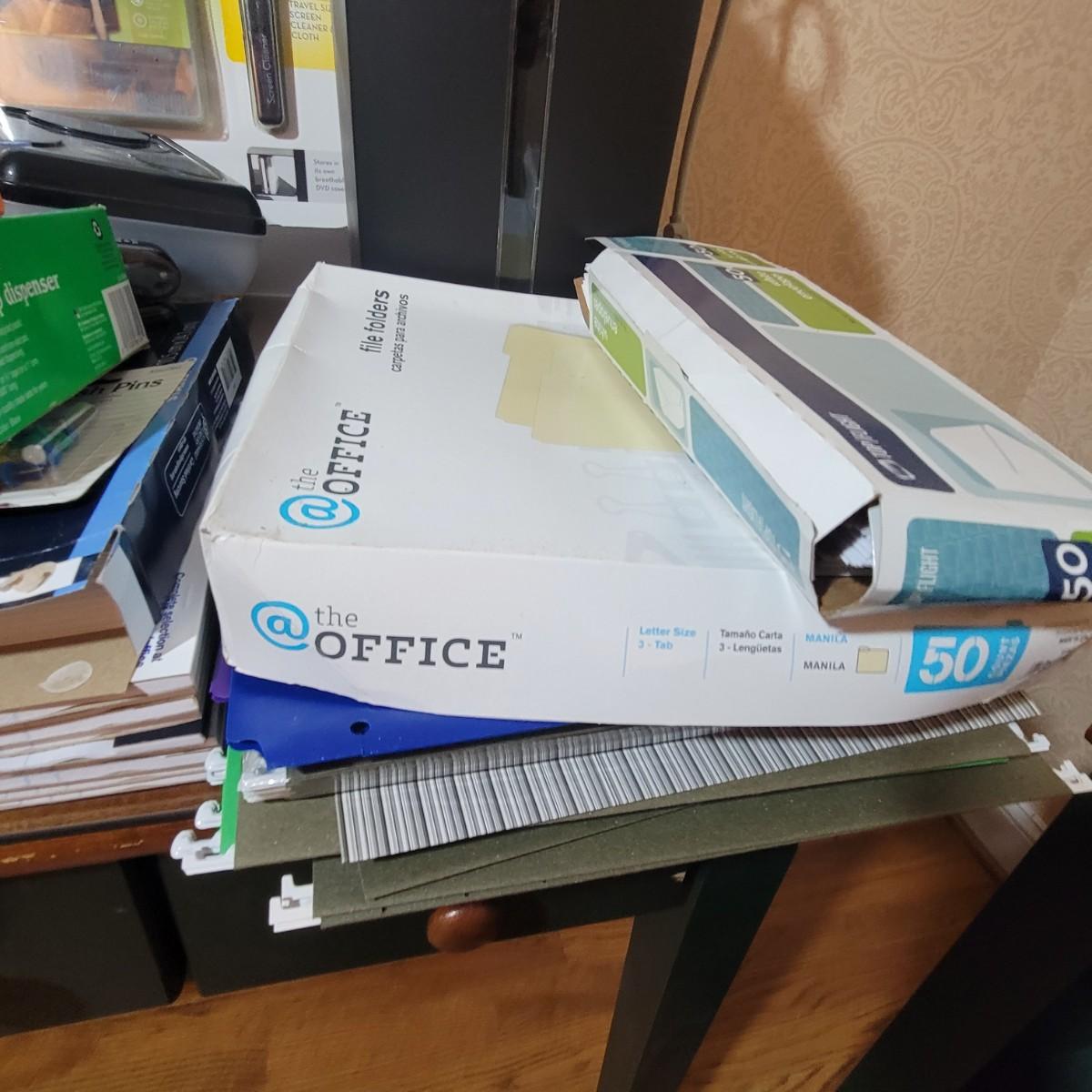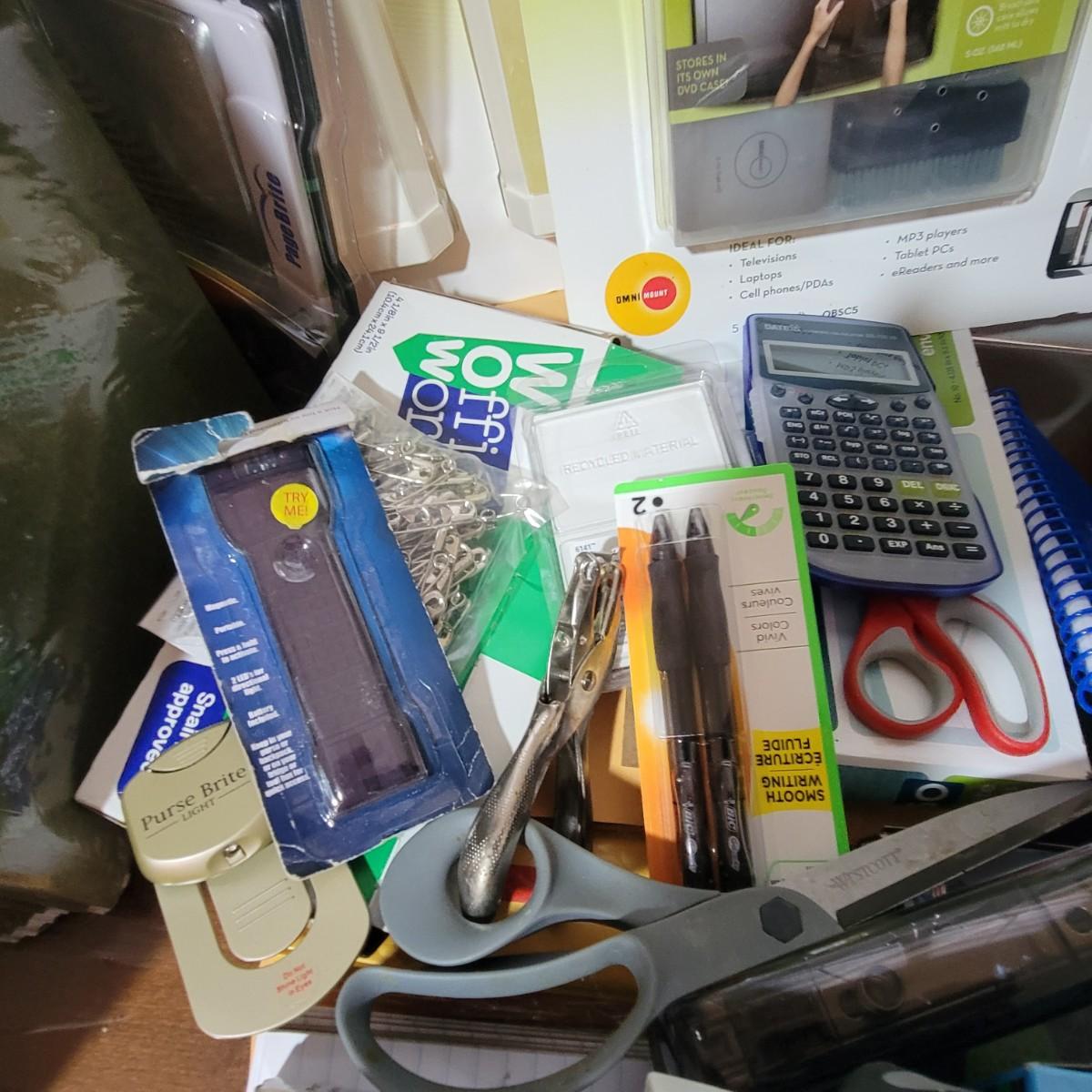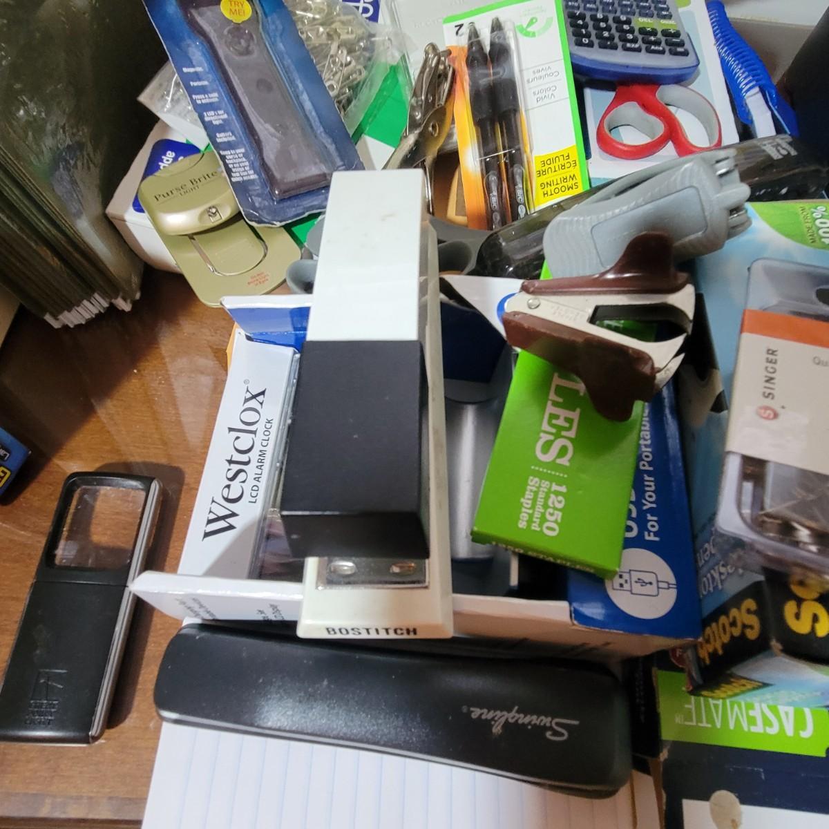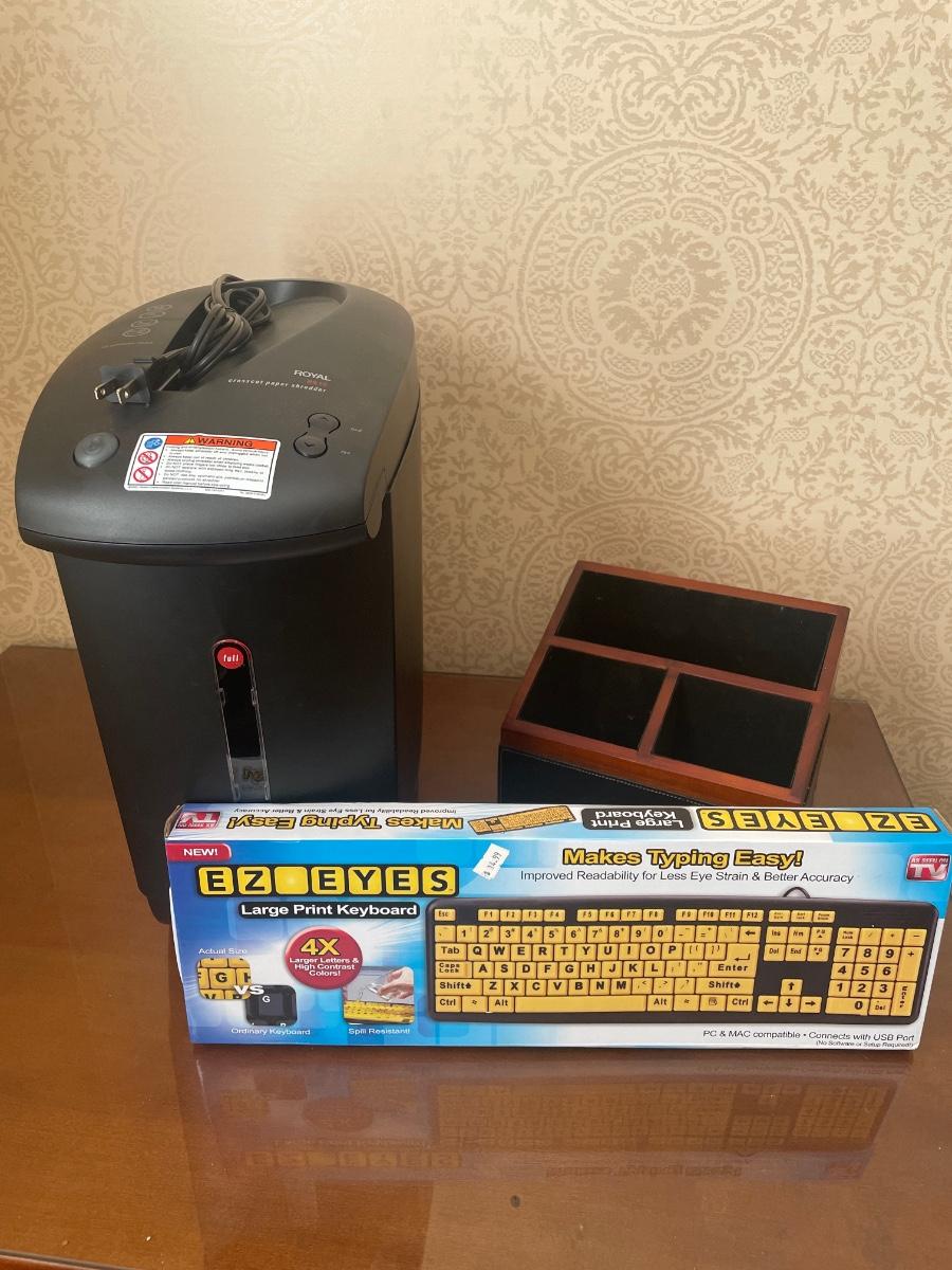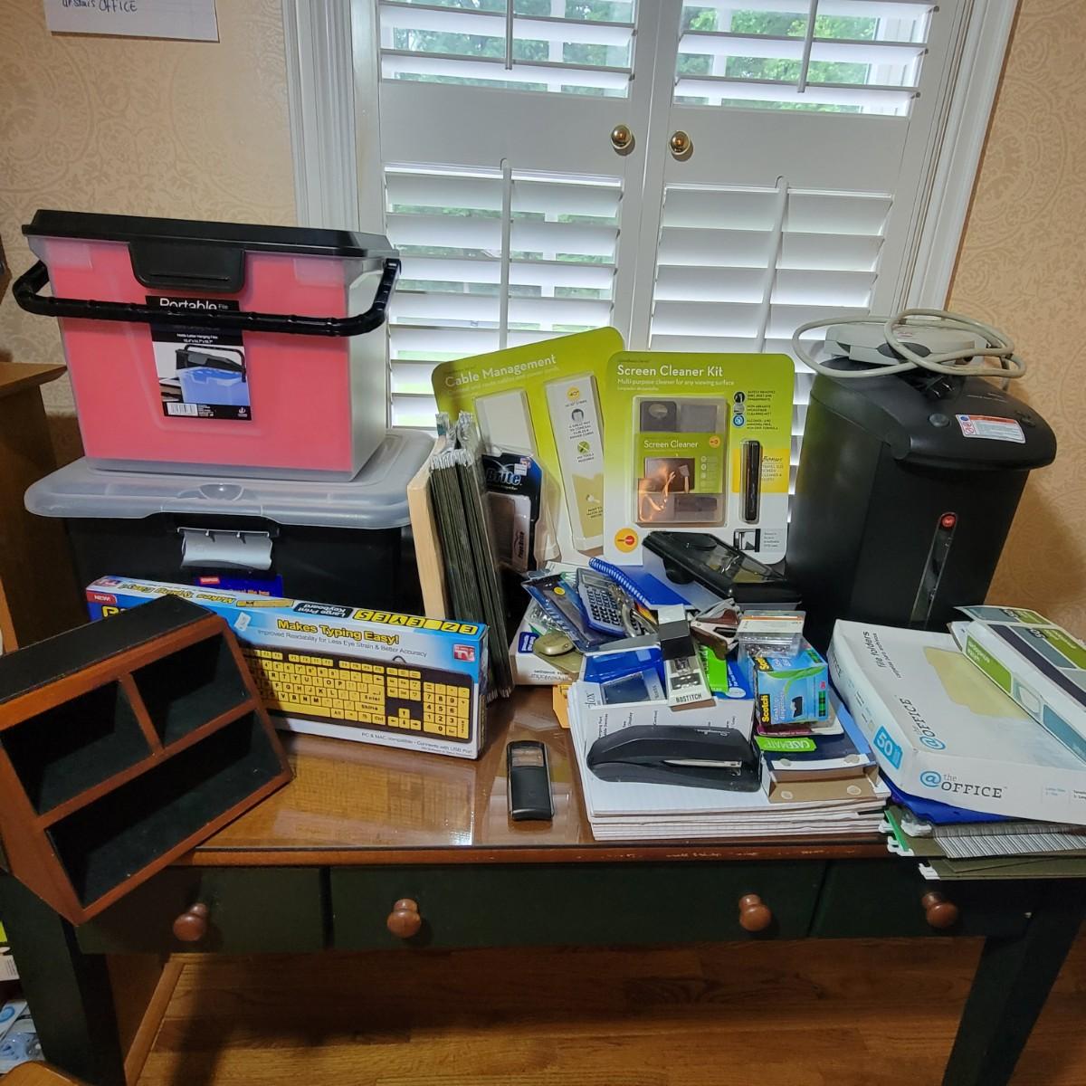 Unused paper shredder made by Royal. 2 portable file boxes, extra files, screen cleaning kit, APC surge protector, notebooks, staplers, calculators, too many items to list! Local pickup only
