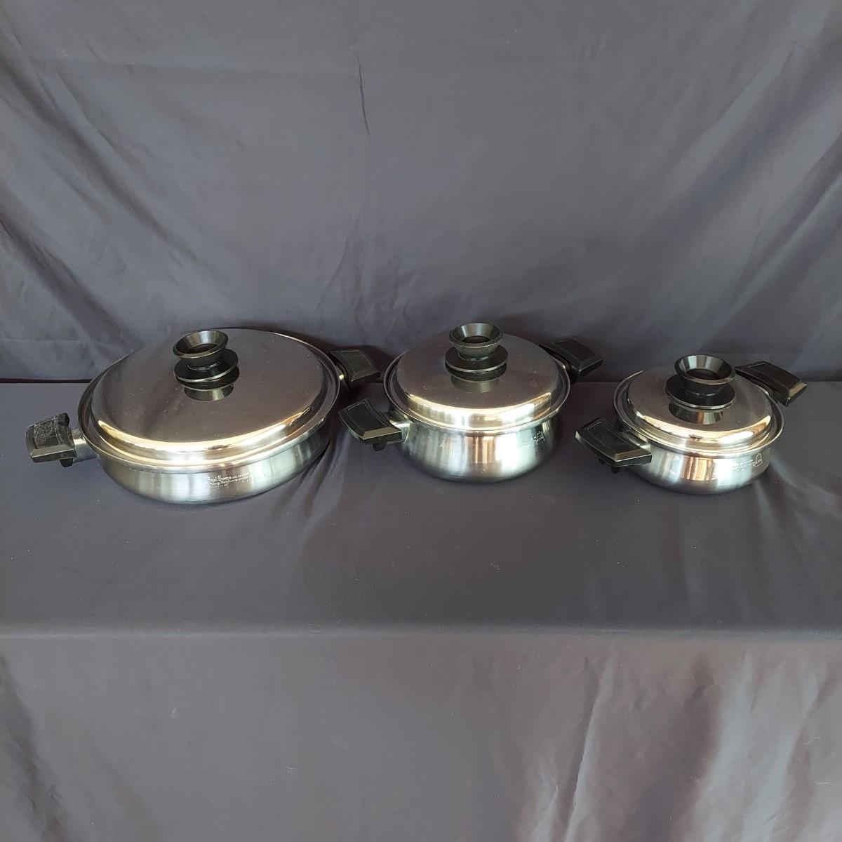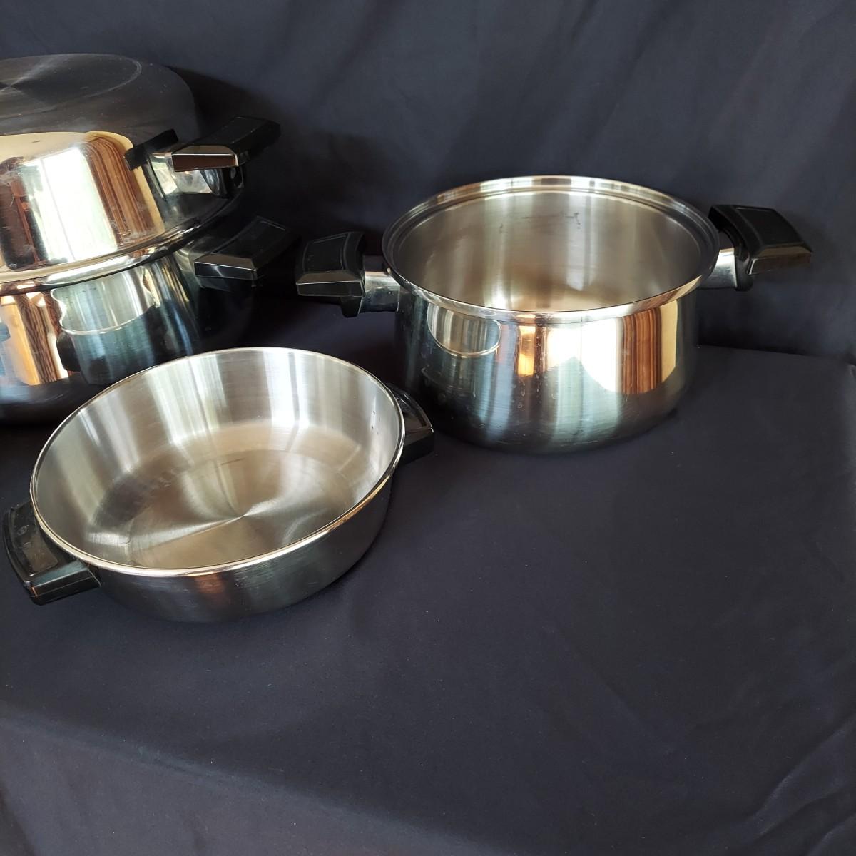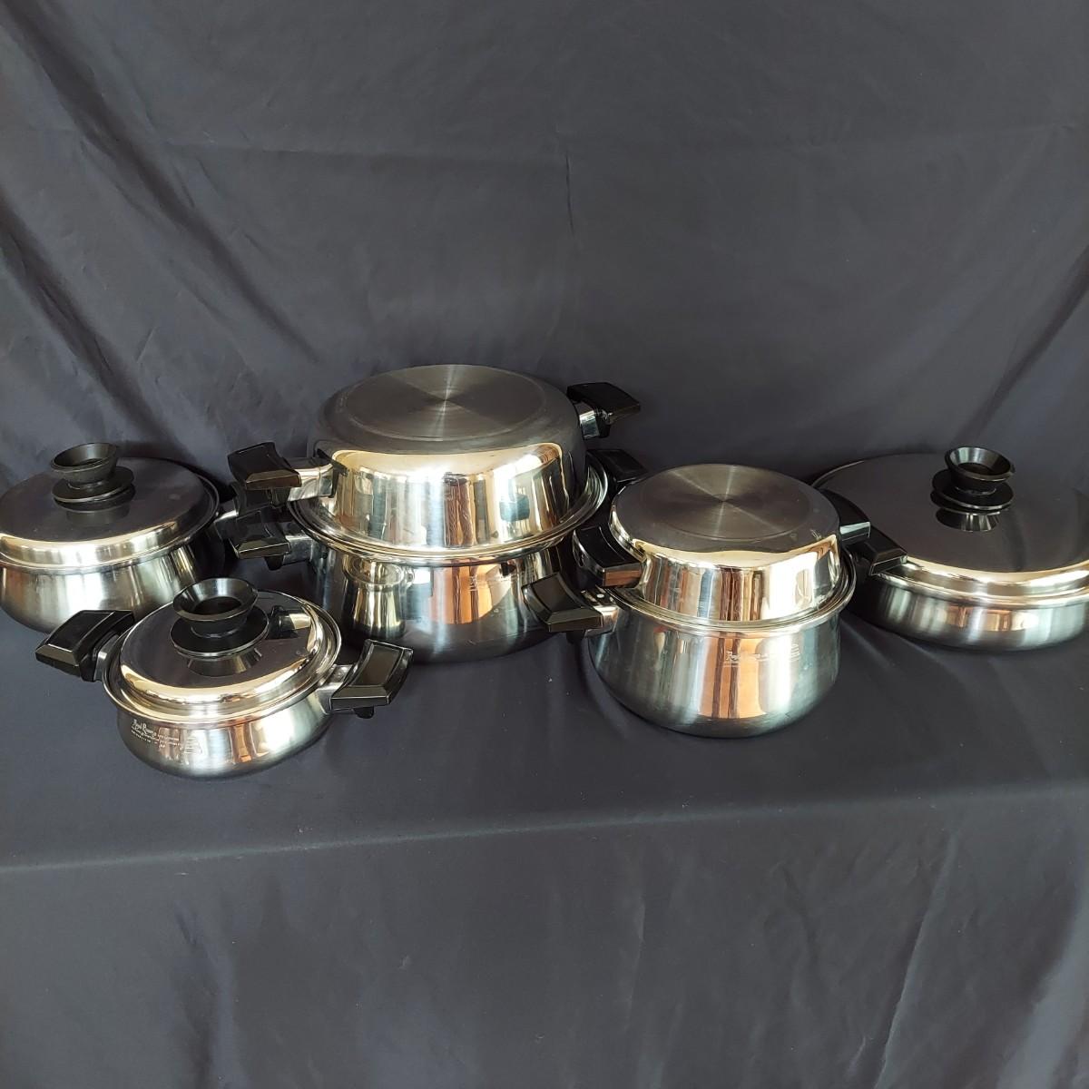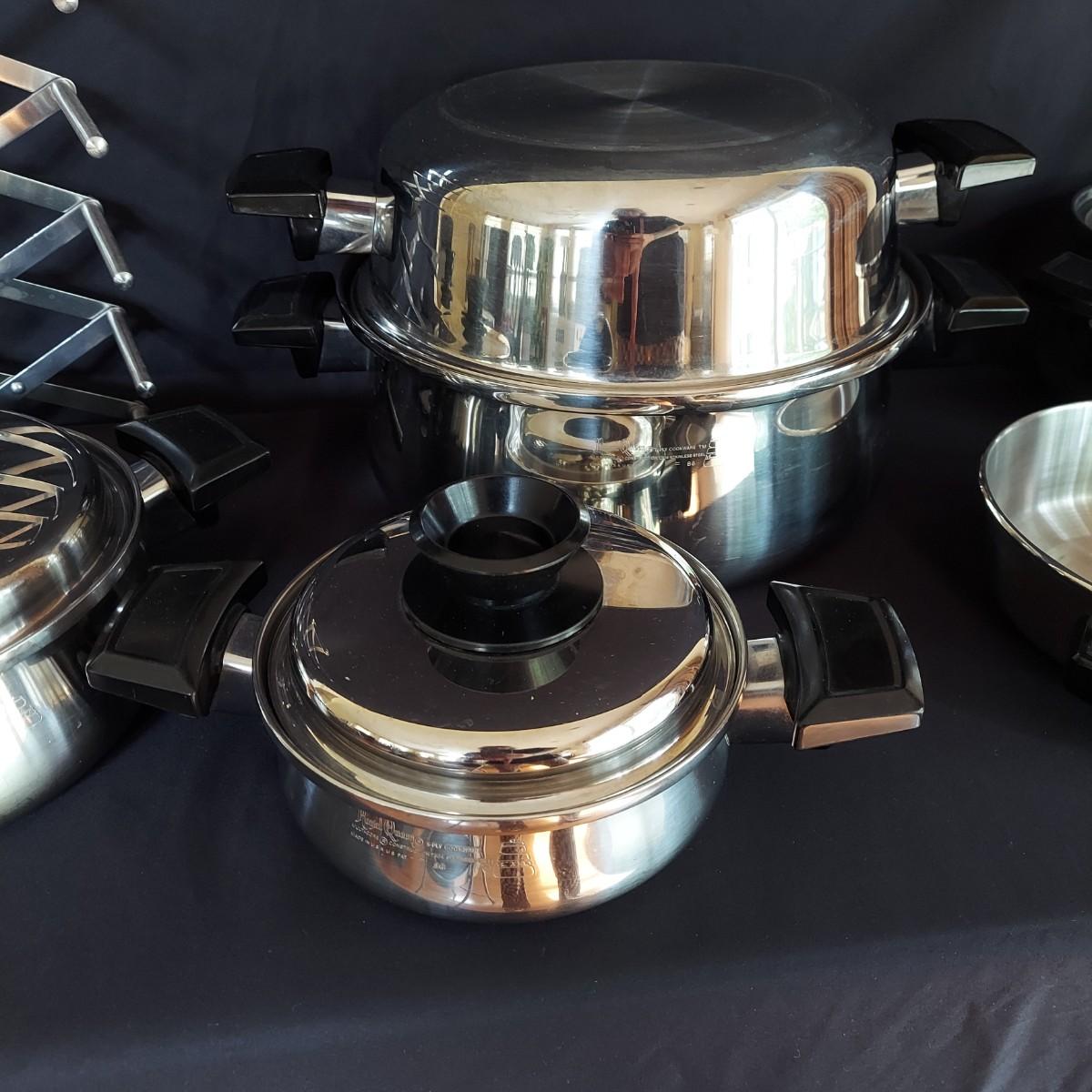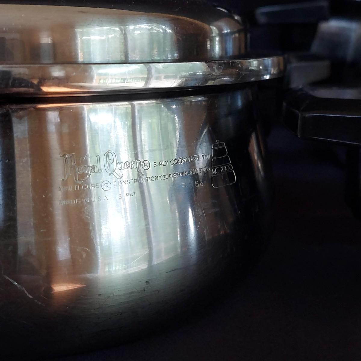 Several pieces of Royal Queen 5 ply Multi Core Stainless Steel Cookware. Made in the USA. The smallest pot is a 6". The largest pot is 10". Three pots have standard lids. Two pots have domed lids in a Dutch oven style. There are two long handles that can be switched on these pots. A pan/lid organizer is included as well. Local Pickup Only.