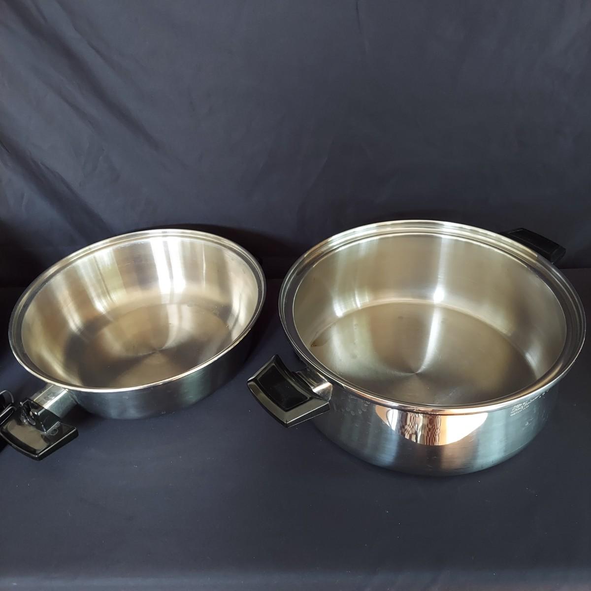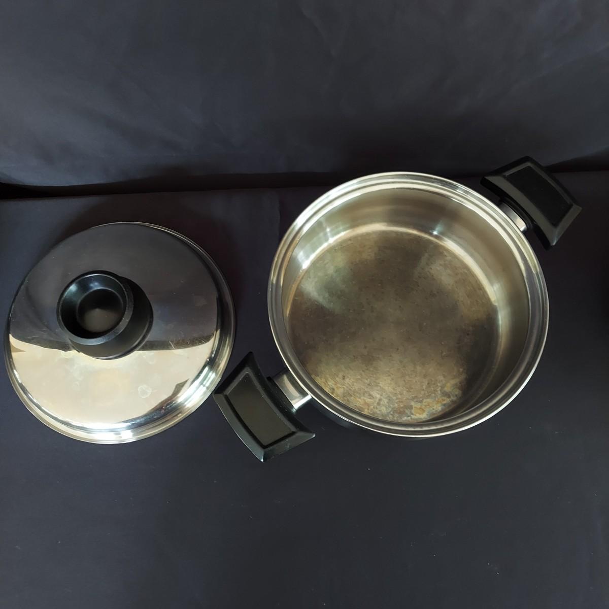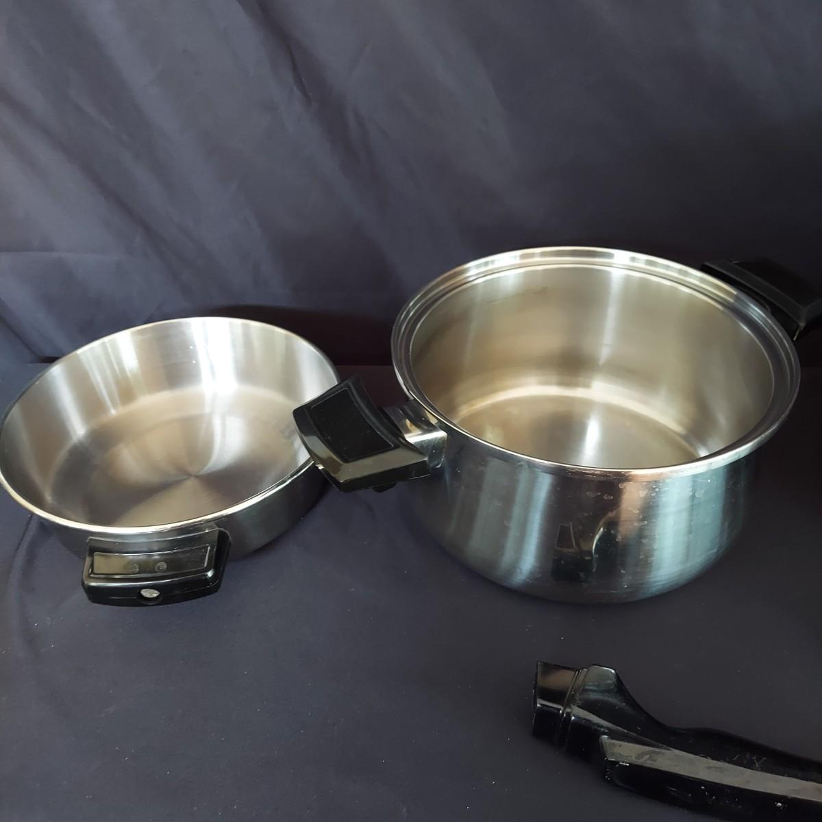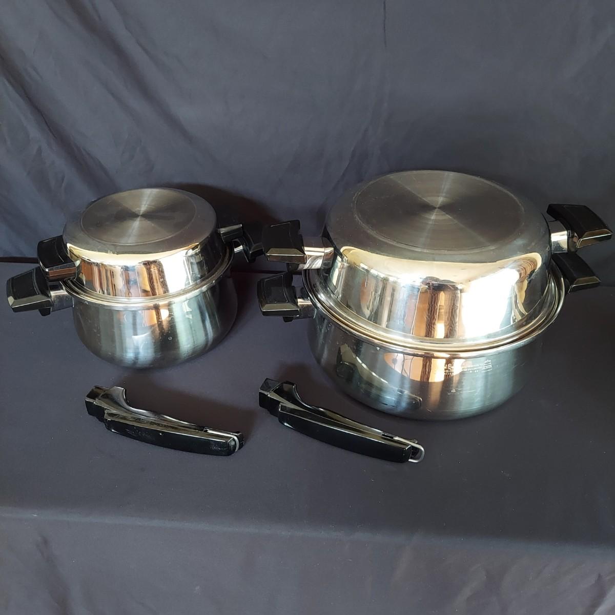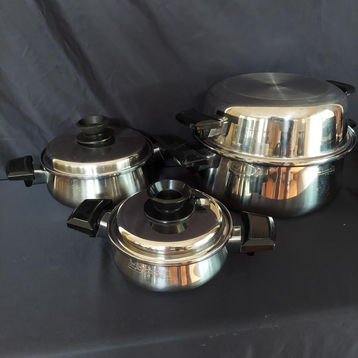 Several pieces of Royal Queen 5 ply Multi Core Stainless Steel Cookware. Made in the USA. The smallest pot is a 6". The largest pot is 10". Three pots have standard lids. Two pots have domed lids in a Dutch oven style. There are two long handles that can be switched on these pots. A pan/lid organizer is included as well. Local Pickup Only.