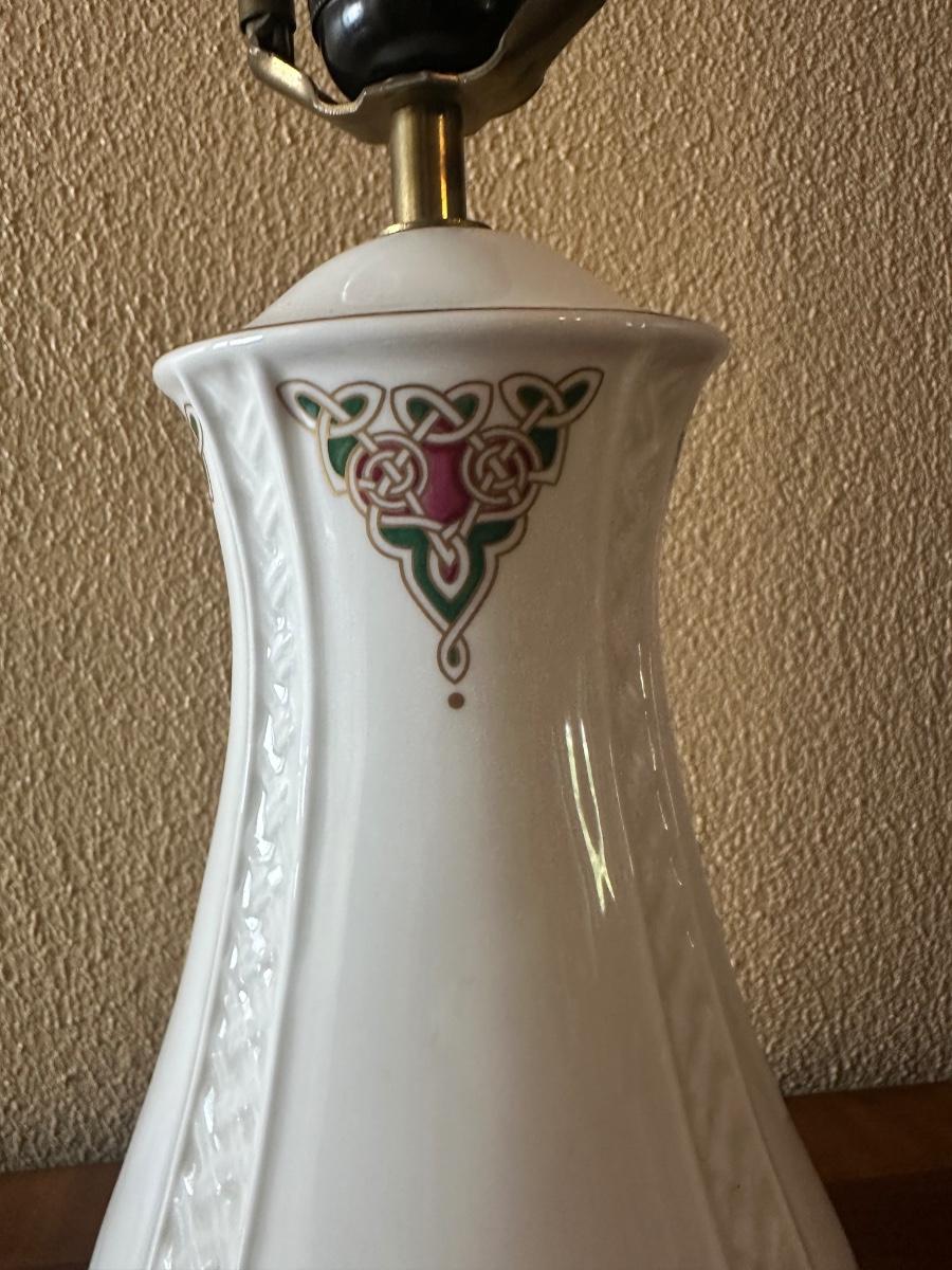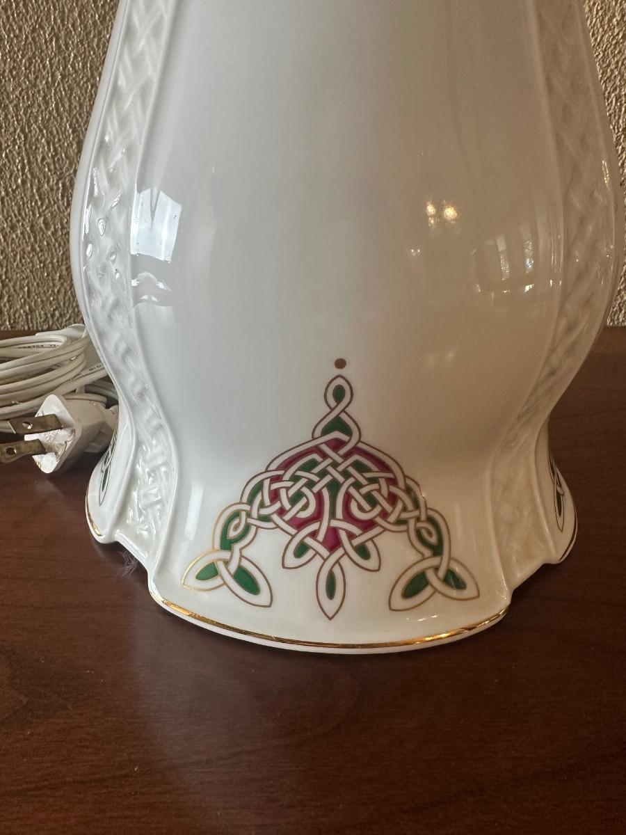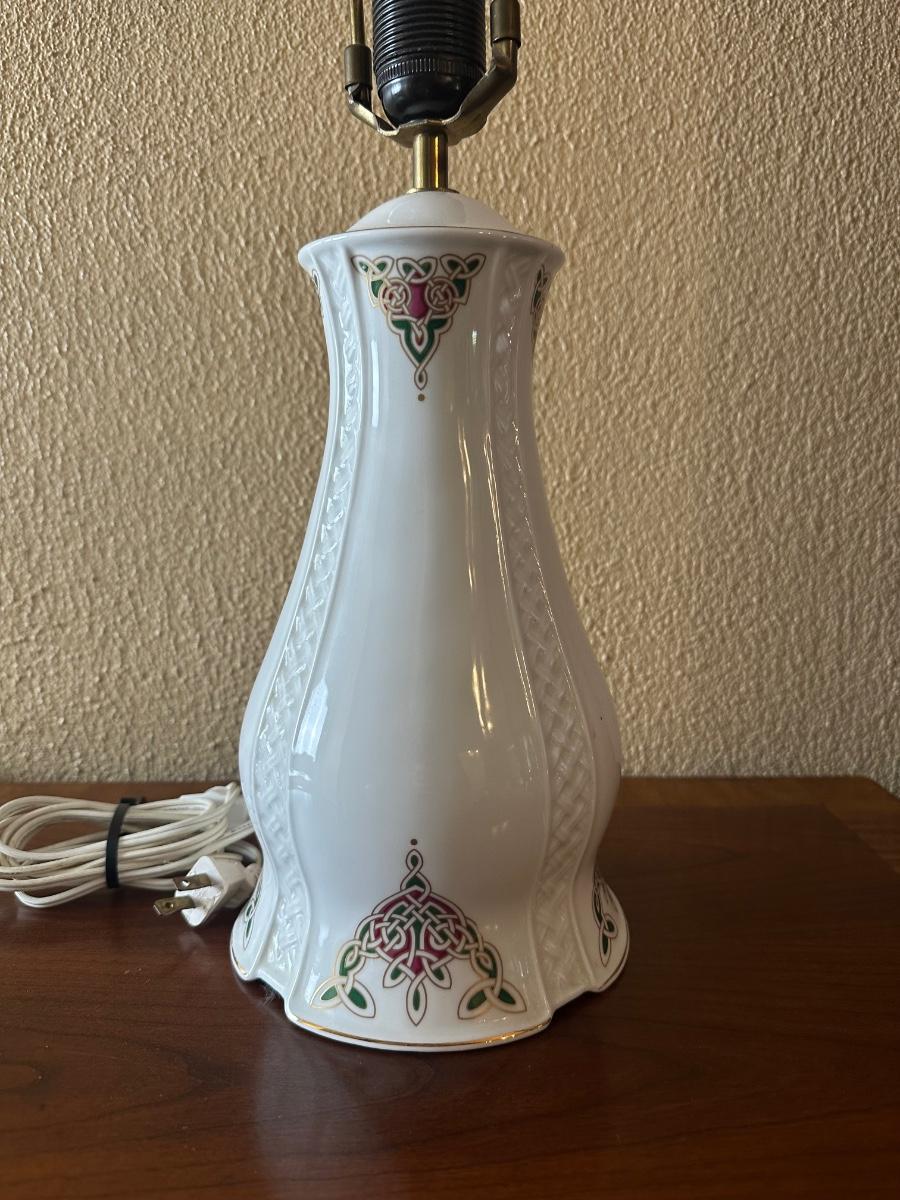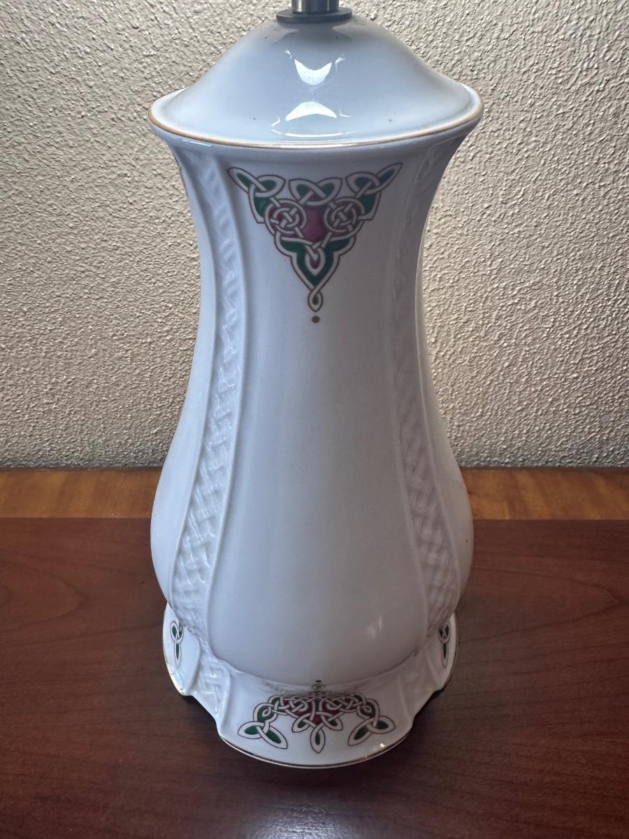 Decorative table lamp base by Royal Tara, made in Ireland of fine bone china and decorated with Celtic knot motifs and gold accents. Marked “Royal Tara – Fine Bone China – Ireland.” Fitted with standard light socket and cord. Shade and finial not included.