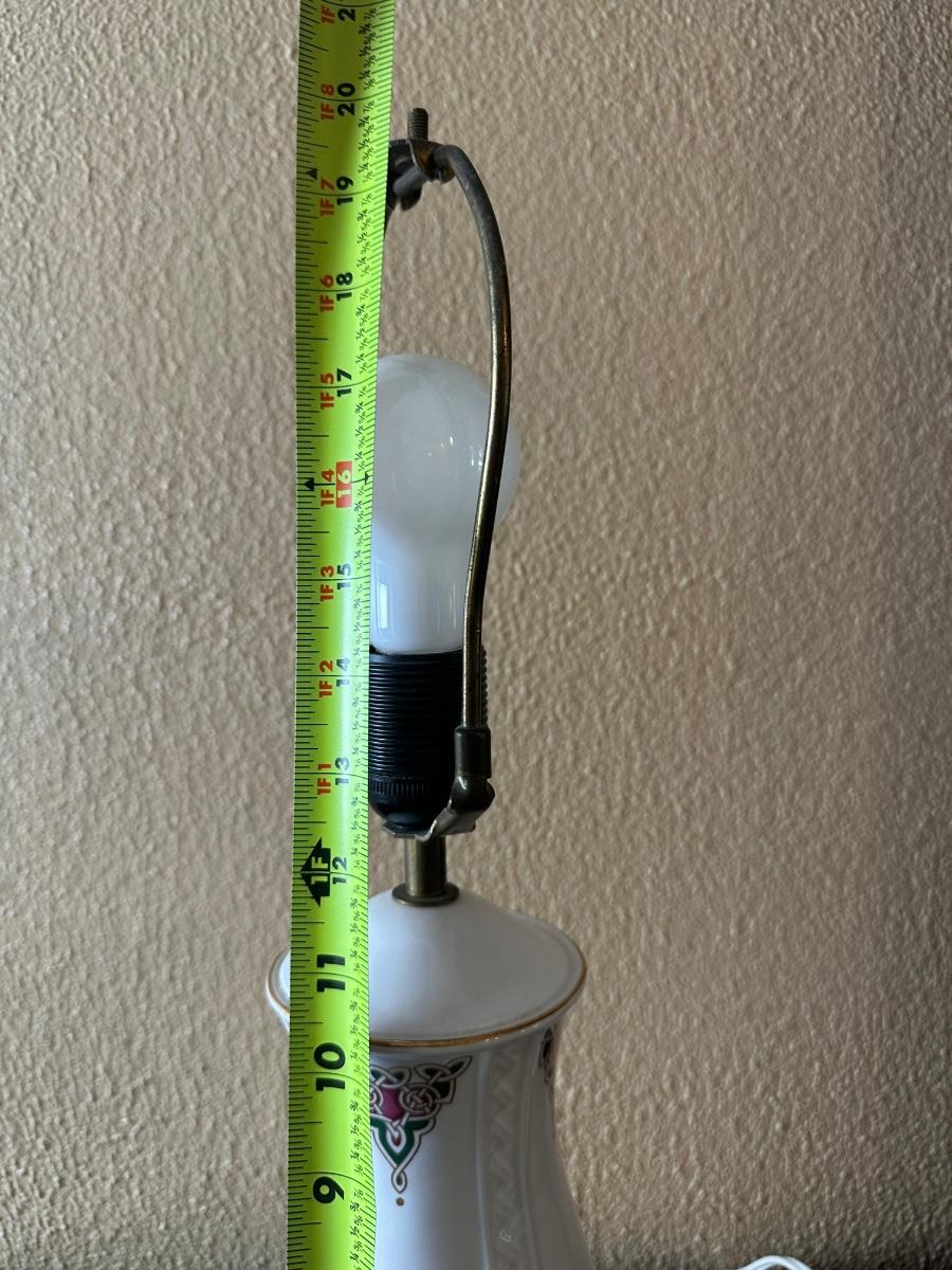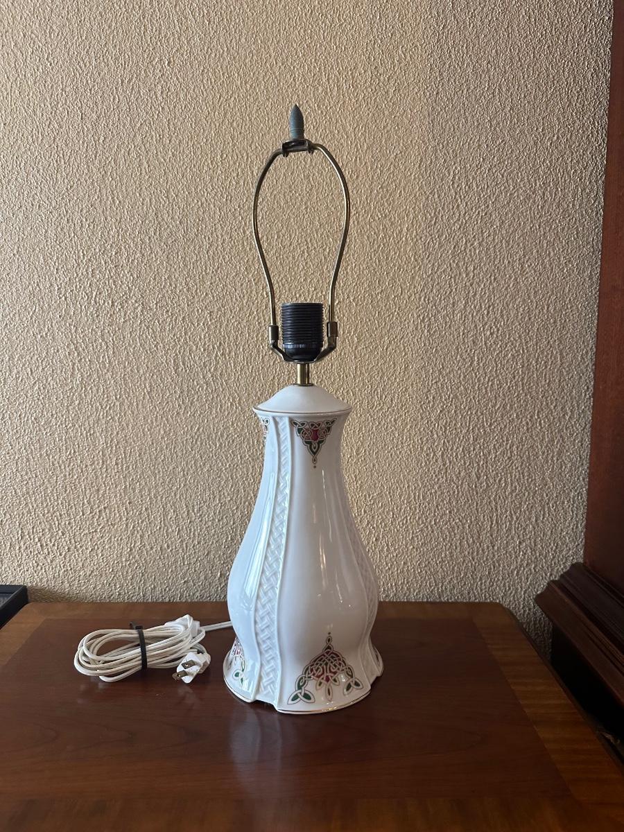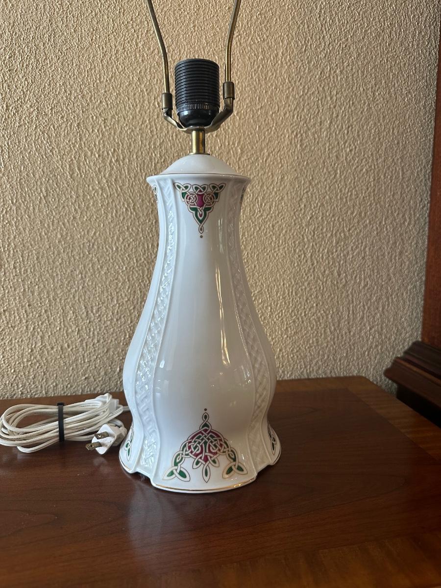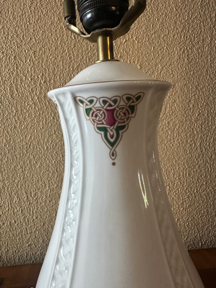 Decorative table lamp base by Royal Tara, made in Ireland of fine bone china and decorated with Celtic knot motifs and gold accents. Marked “Royal Tara – Fine Bone China – Ireland.” Fitted with standard light socket and cord. Shade and finial not included.