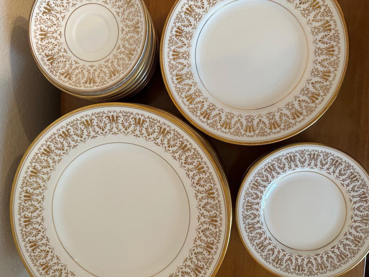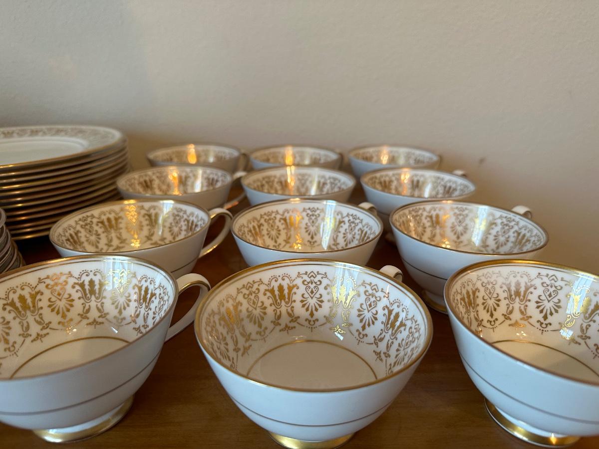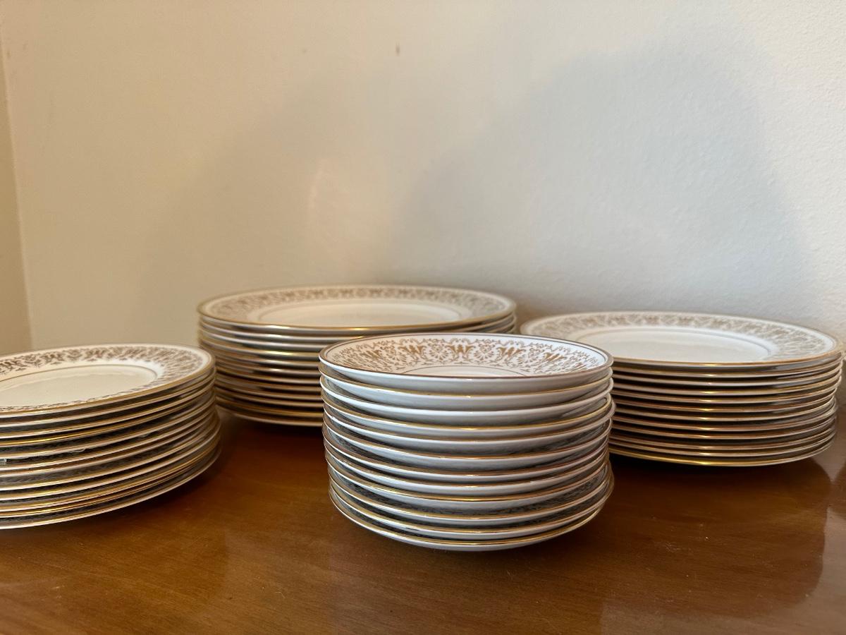 12 dinner plates, 12 salad plates, 12 small plates, 12 saucers, 12 cups