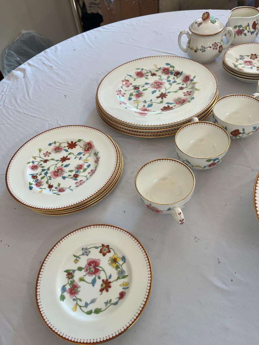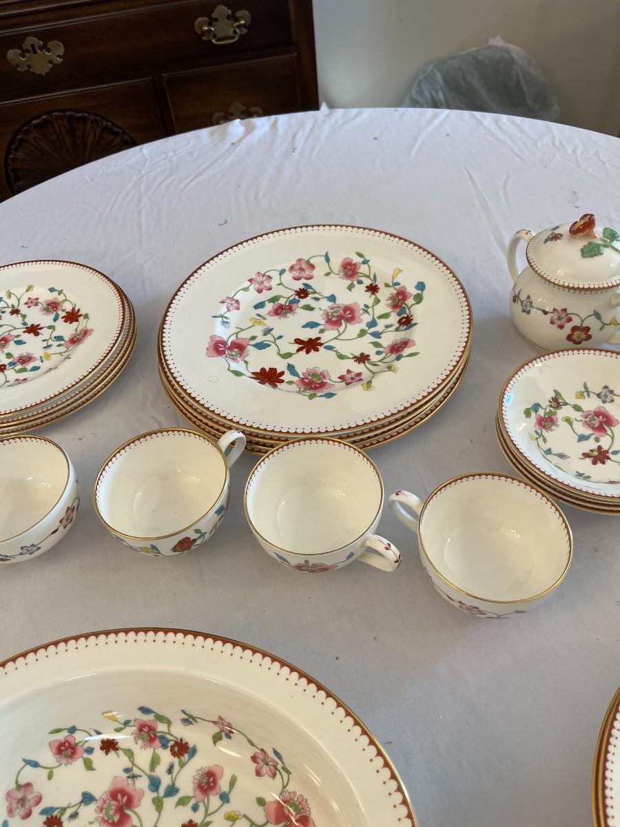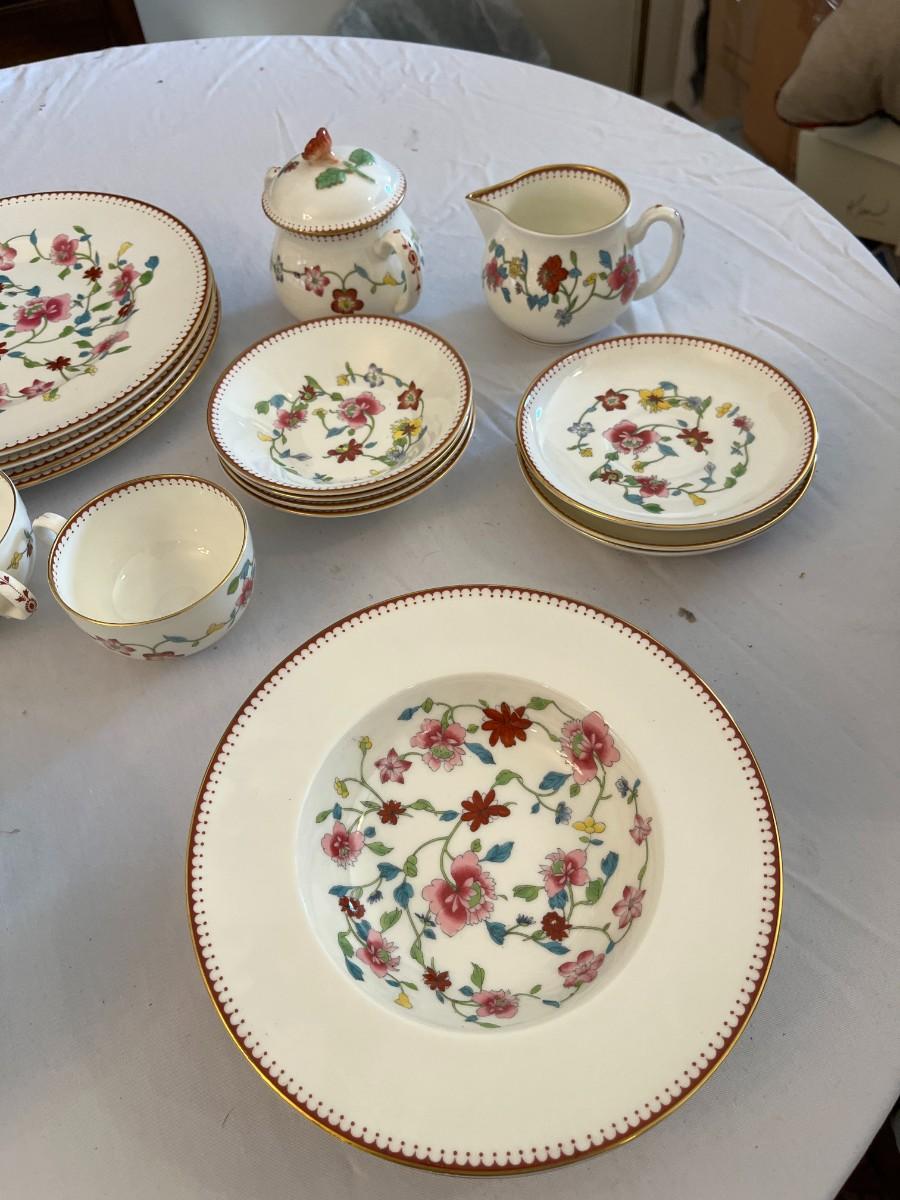 Royal Worcester Astley Dinnerware Bone China Made In England Includes: 4 Dinner Plates, 4 Salad Plates, 4 Desert Bowls, 4 Coffee Cups, 3 Saucers, 2 Small Plates, 3 Soup Bowls, 1 Serving Bowl, Cream Pitcher, and Sugar Bowl Total 27 Pieces