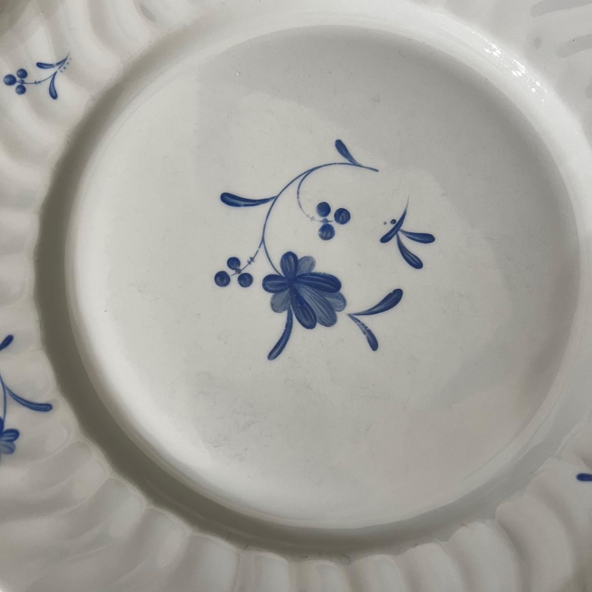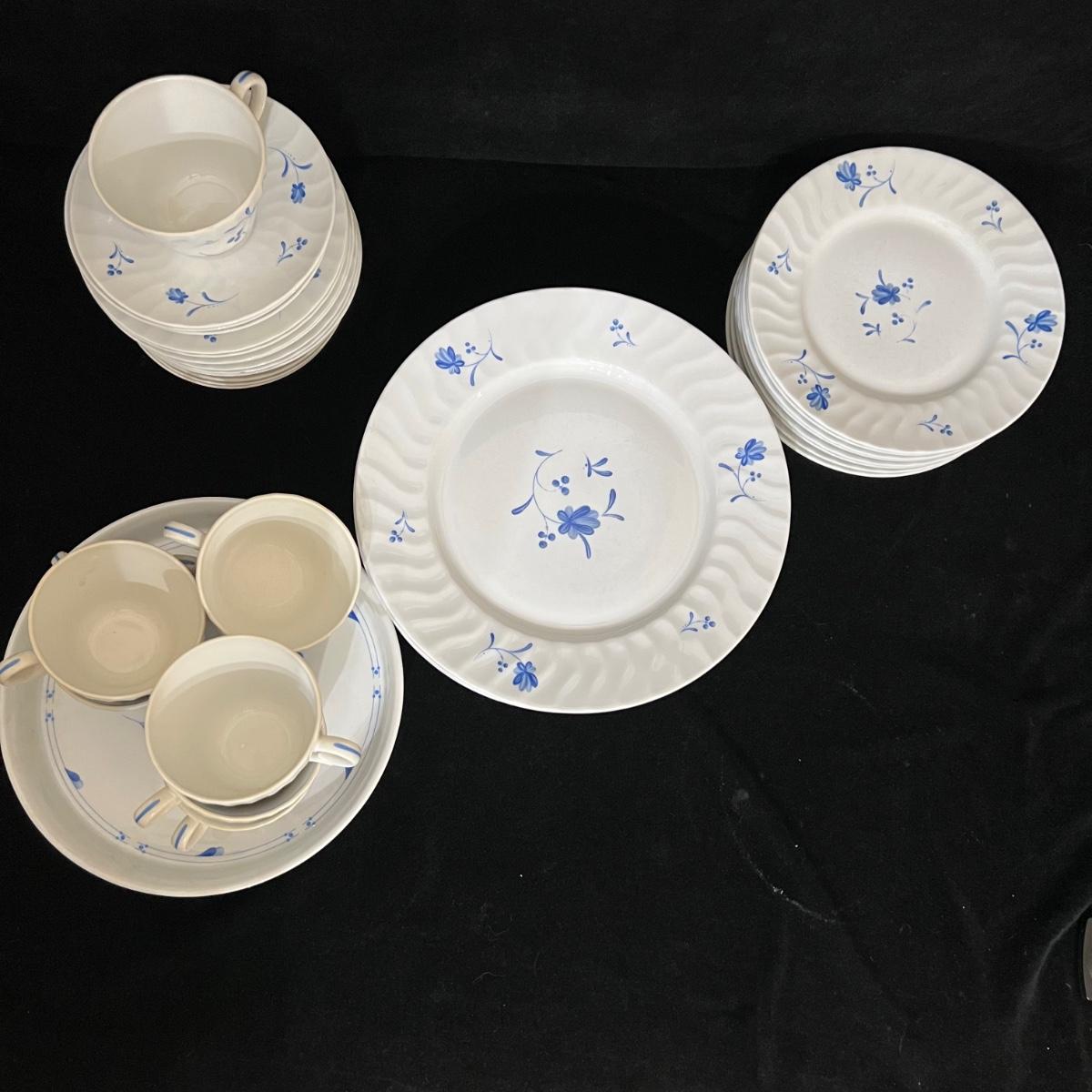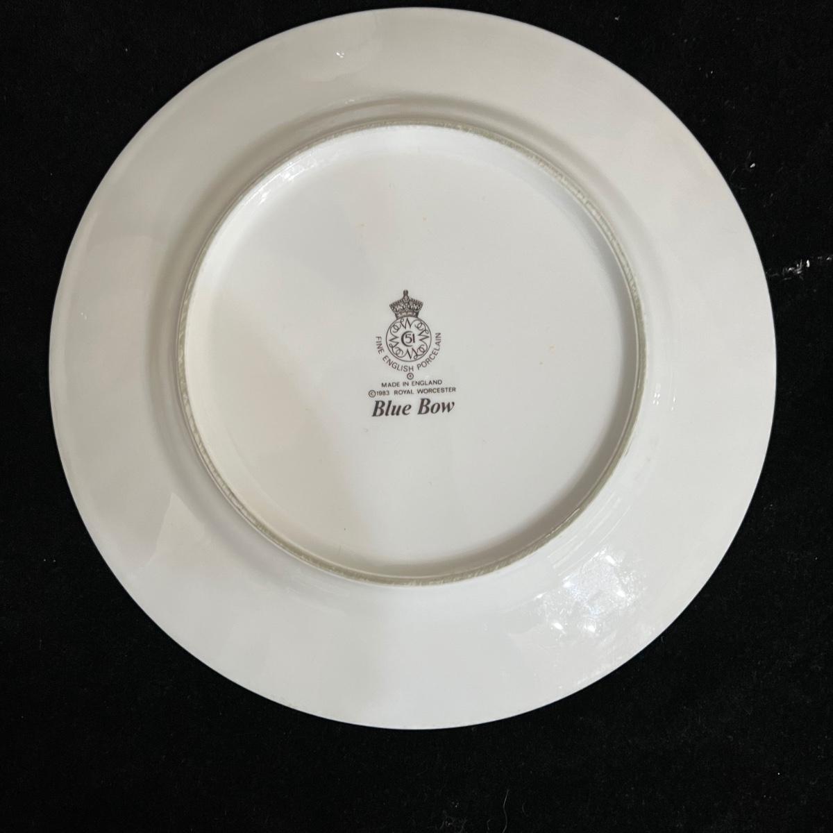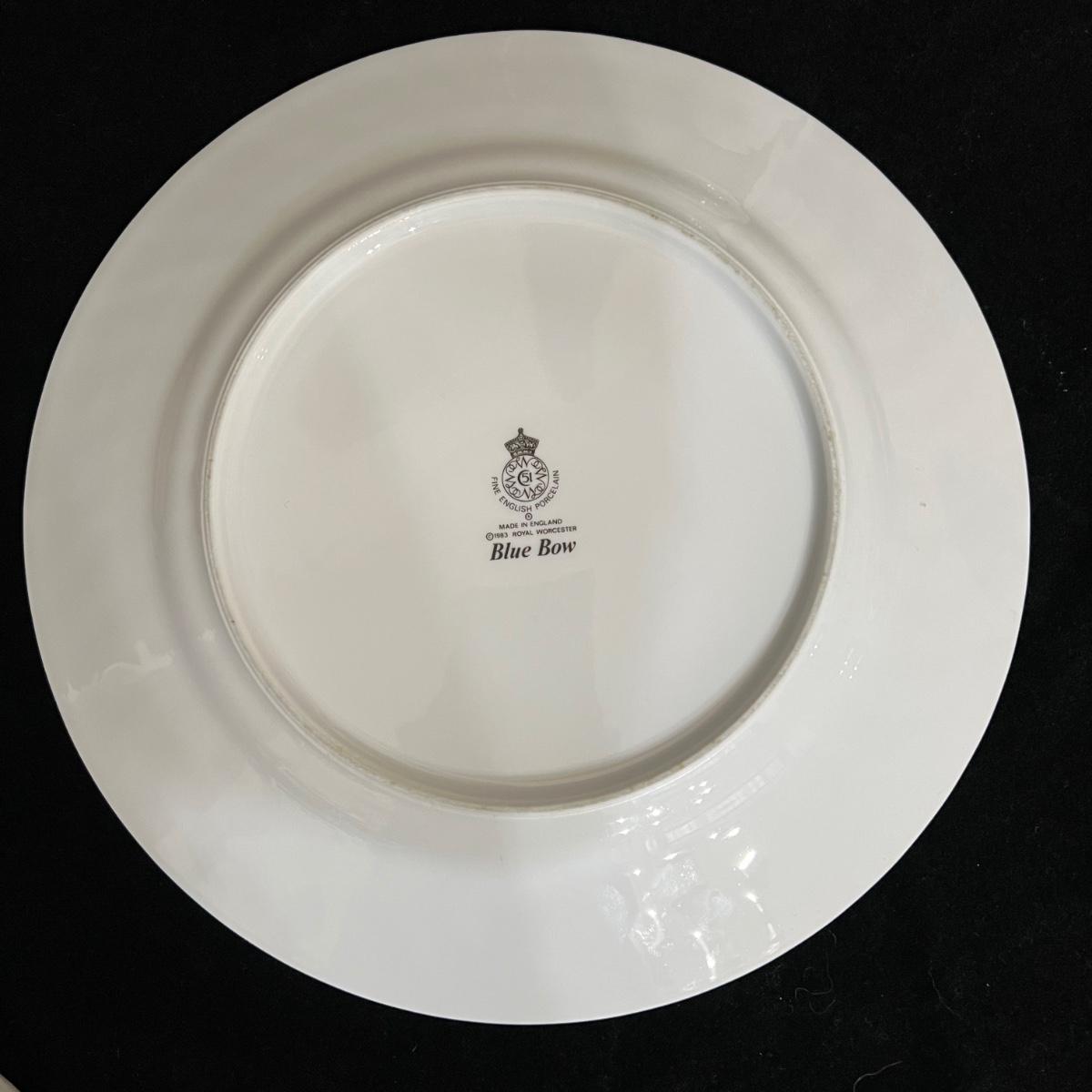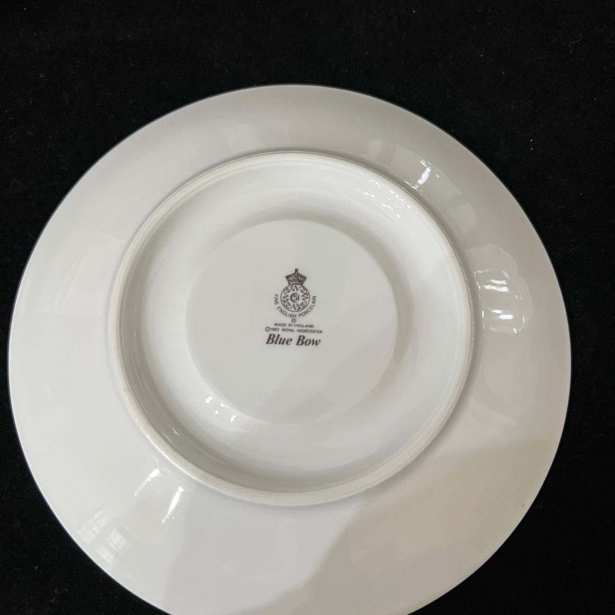 Royal Worcester blue boat china set includes eight coffee cups, eight saucers, seven 6.5” bread & butter plates, eight 8.25” salad plates, six 10.5” dinner plates and one 9.5” quiche/tart baking dish. Plates are dirty not stained, when washed all yellowing came clean. The only known chips are shown in one bread & butter plate. Shipping available.