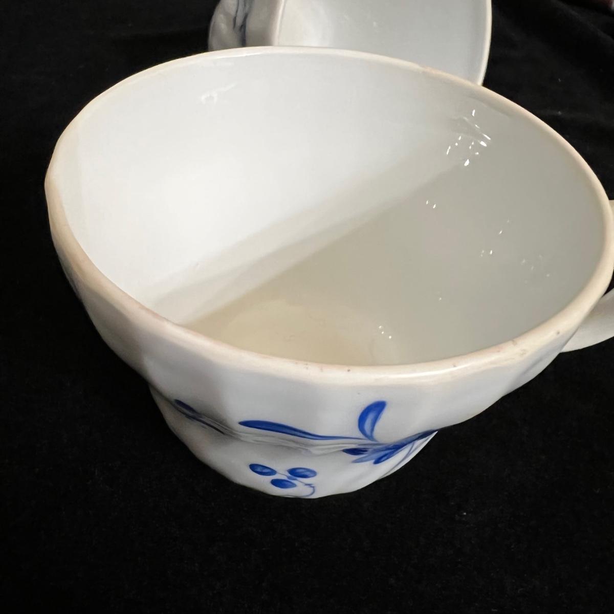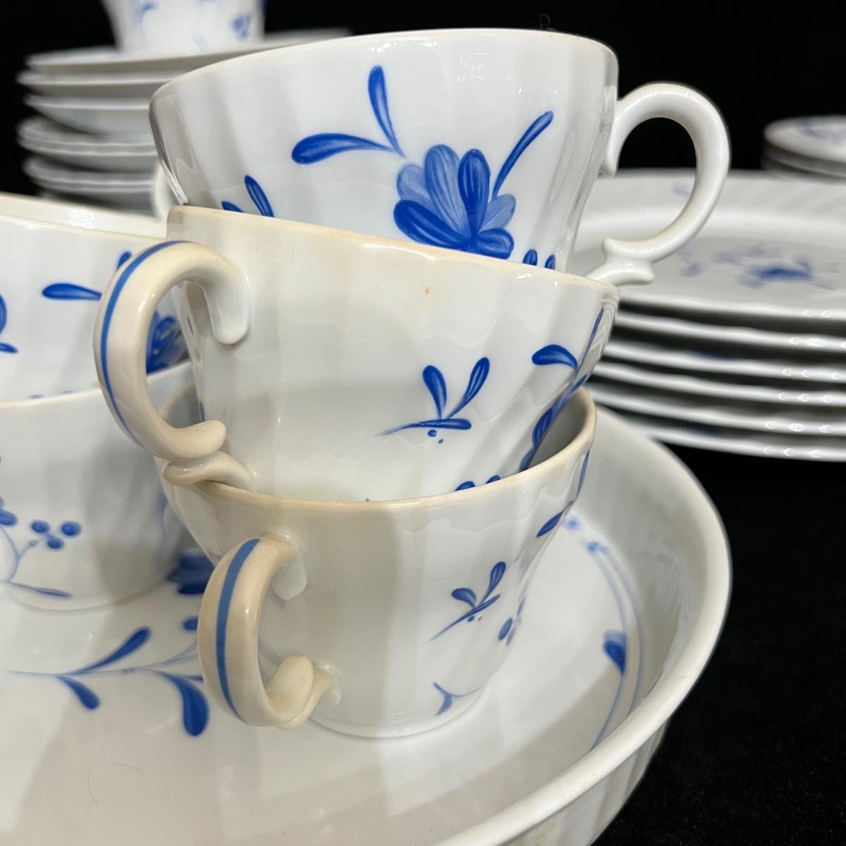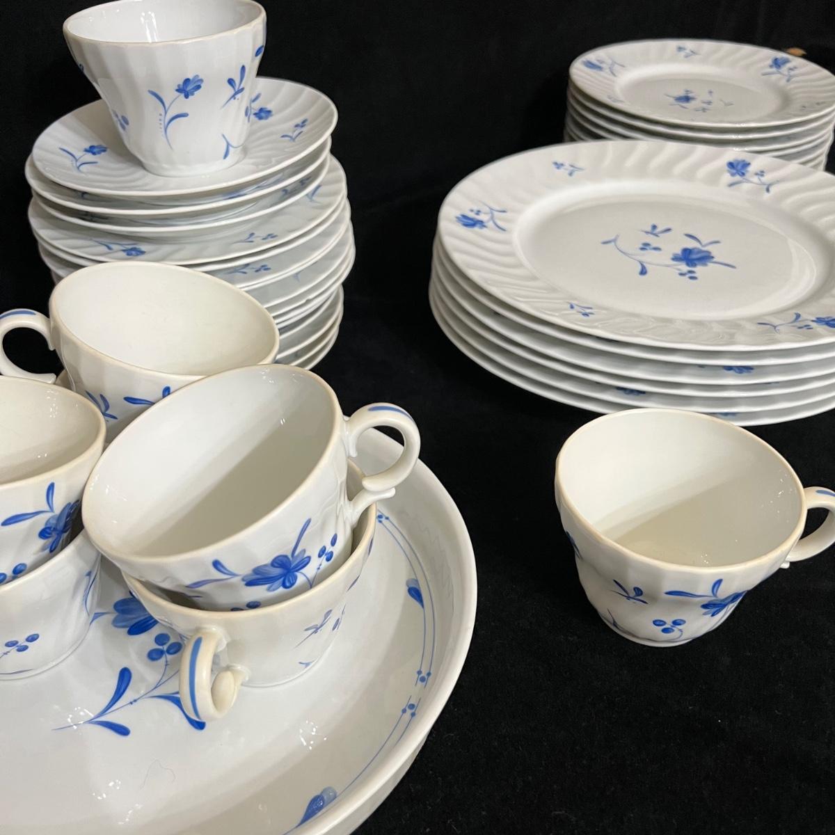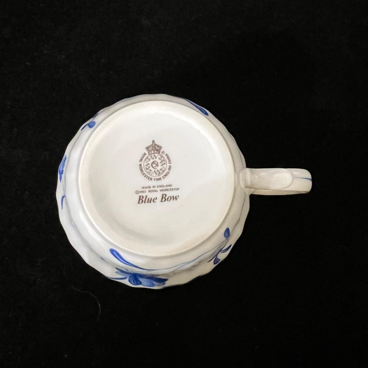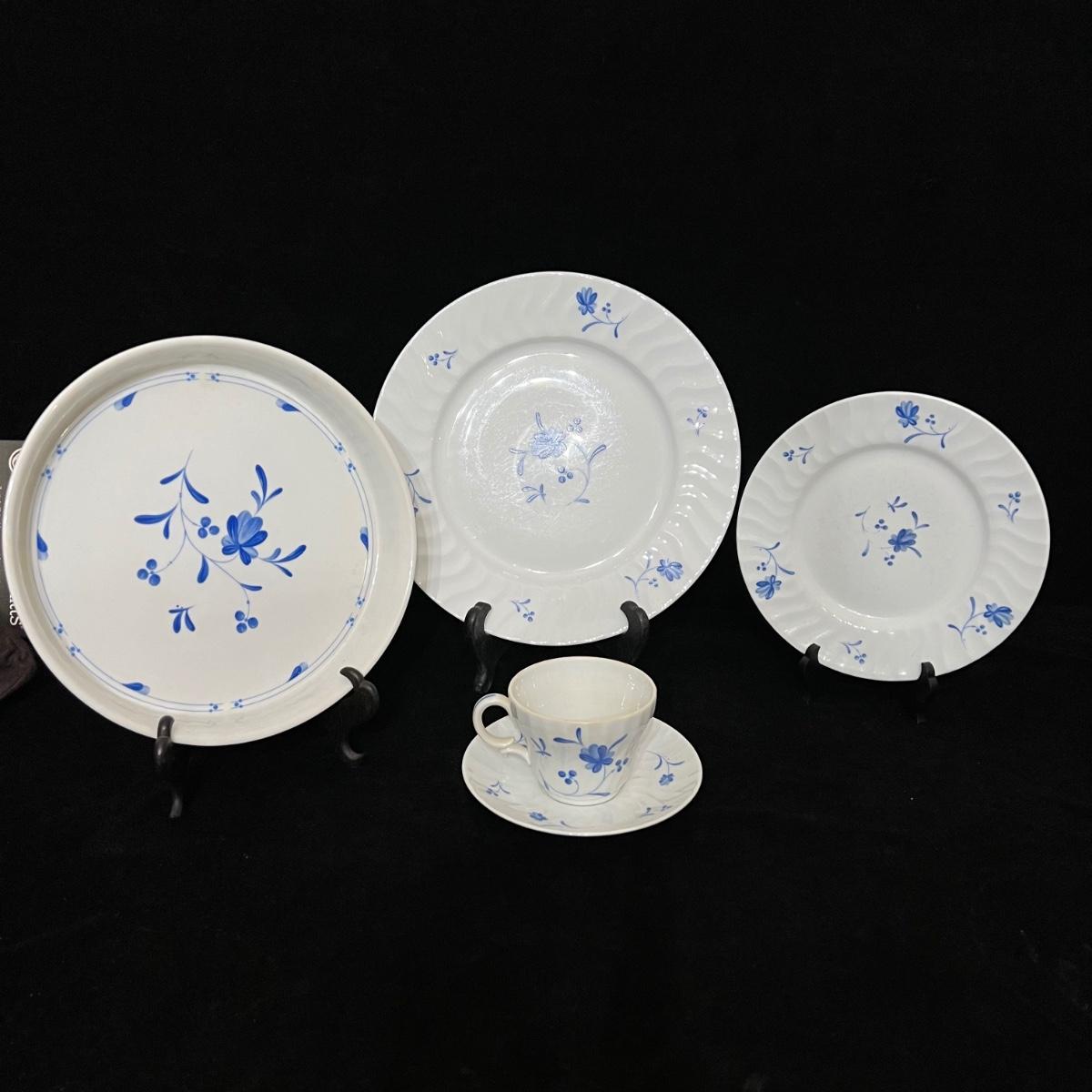 Royal Worcester blue boat china set includes eight coffee cups, eight saucers, seven 6.5” bread & butter plates, eight 8.25” salad plates, six 10.5” dinner plates and one 9.5” quiche/tart baking dish. Plates are dirty not stained, when washed all yellowing came clean. The only known chips are shown in one bread & butter plate. Shipping available.