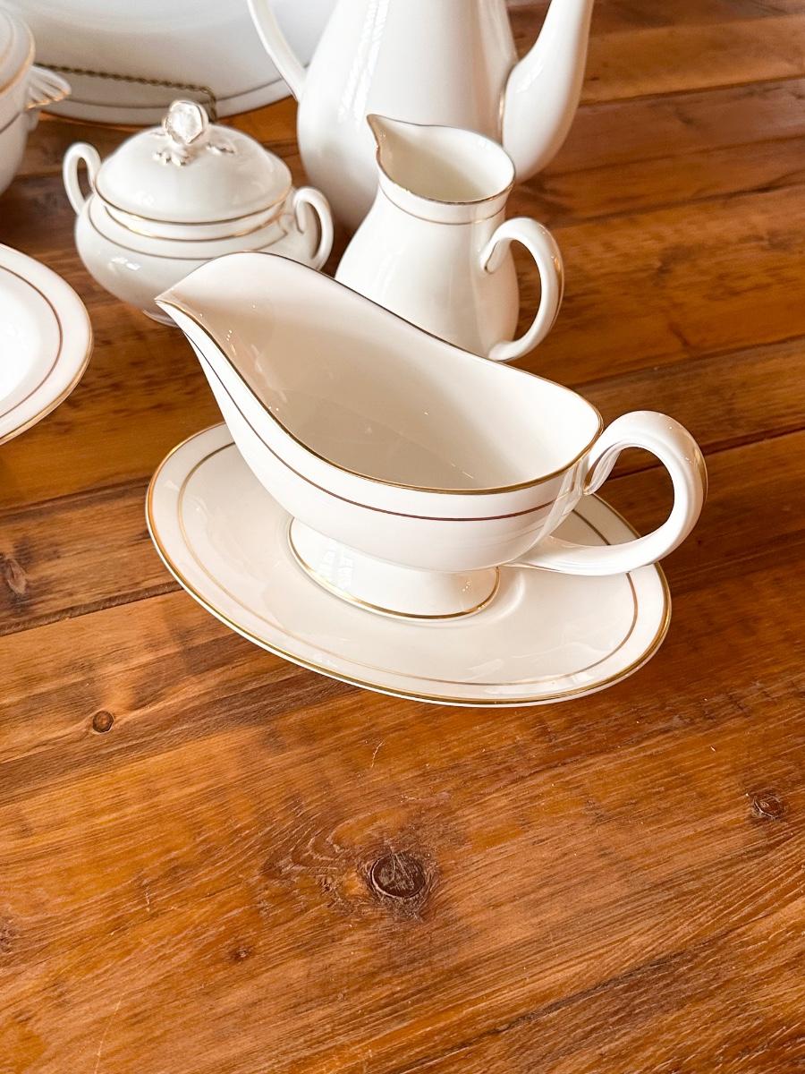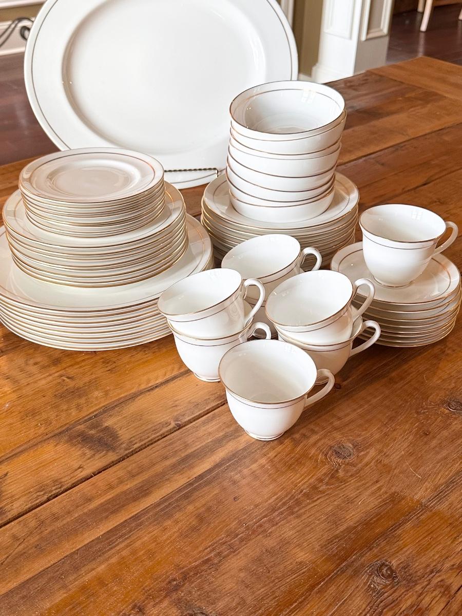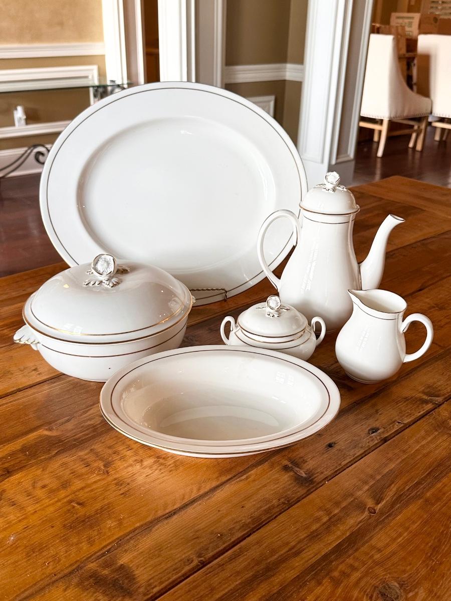 63 pieces includes: 8 each = Dinner plate, salad plate, bread/dessert plate, soup bowl, dessert bowl, cup & saucer ~ servings pieces include: 17” platter, vegetable dish, 2 piece gravy boat, coffee/tea pot, creamer, sugar and 8” Lidded dish
