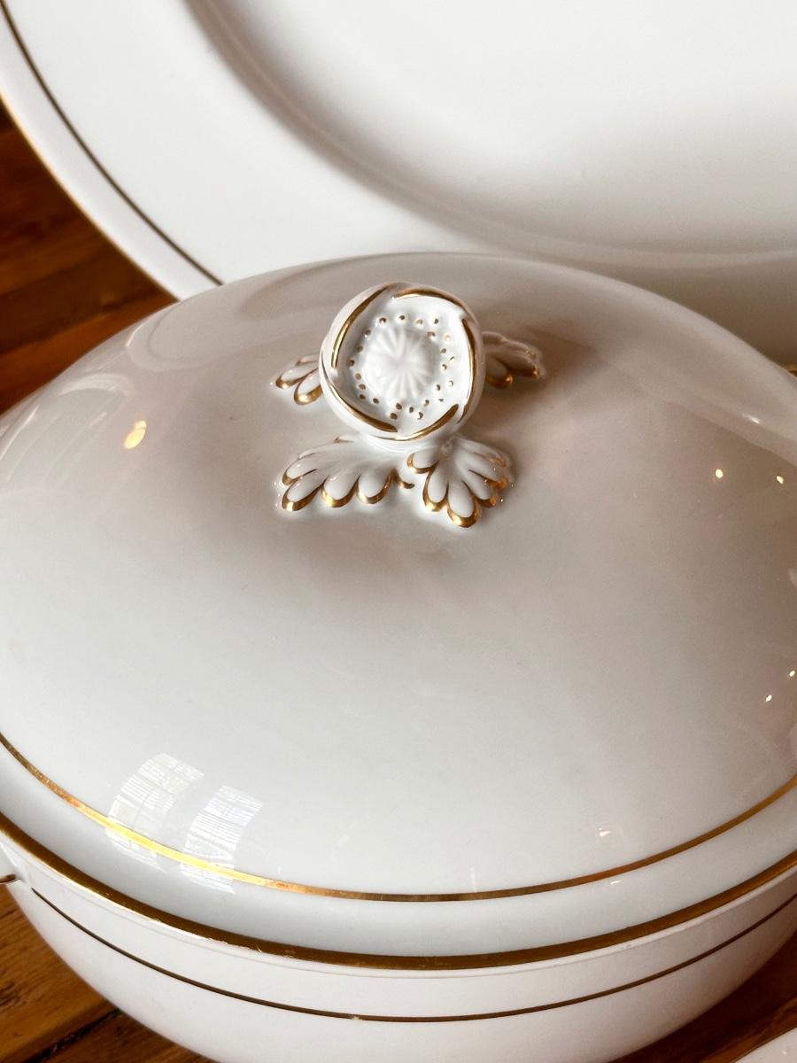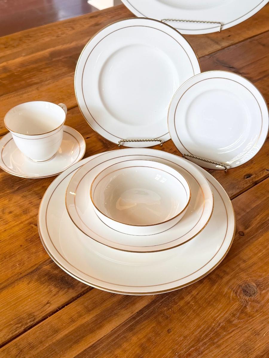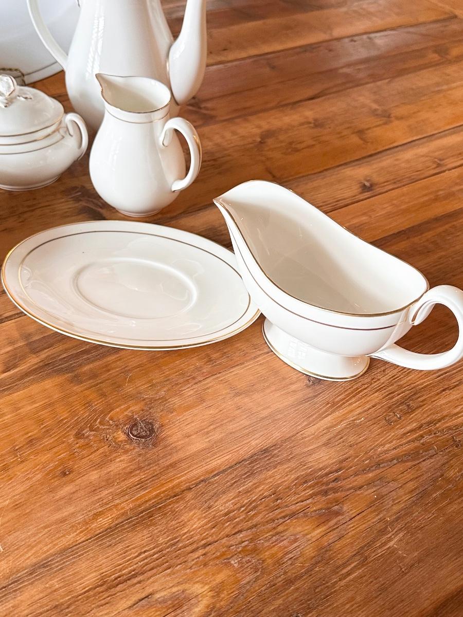 63 pieces includes: 8 each = Dinner plate, salad plate, bread/dessert plate, soup bowl, dessert bowl, cup & saucer ~ servings pieces include: 17” platter, vegetable dish, 2 piece gravy boat, coffee/tea pot, creamer, sugar and 8” Lidded dish