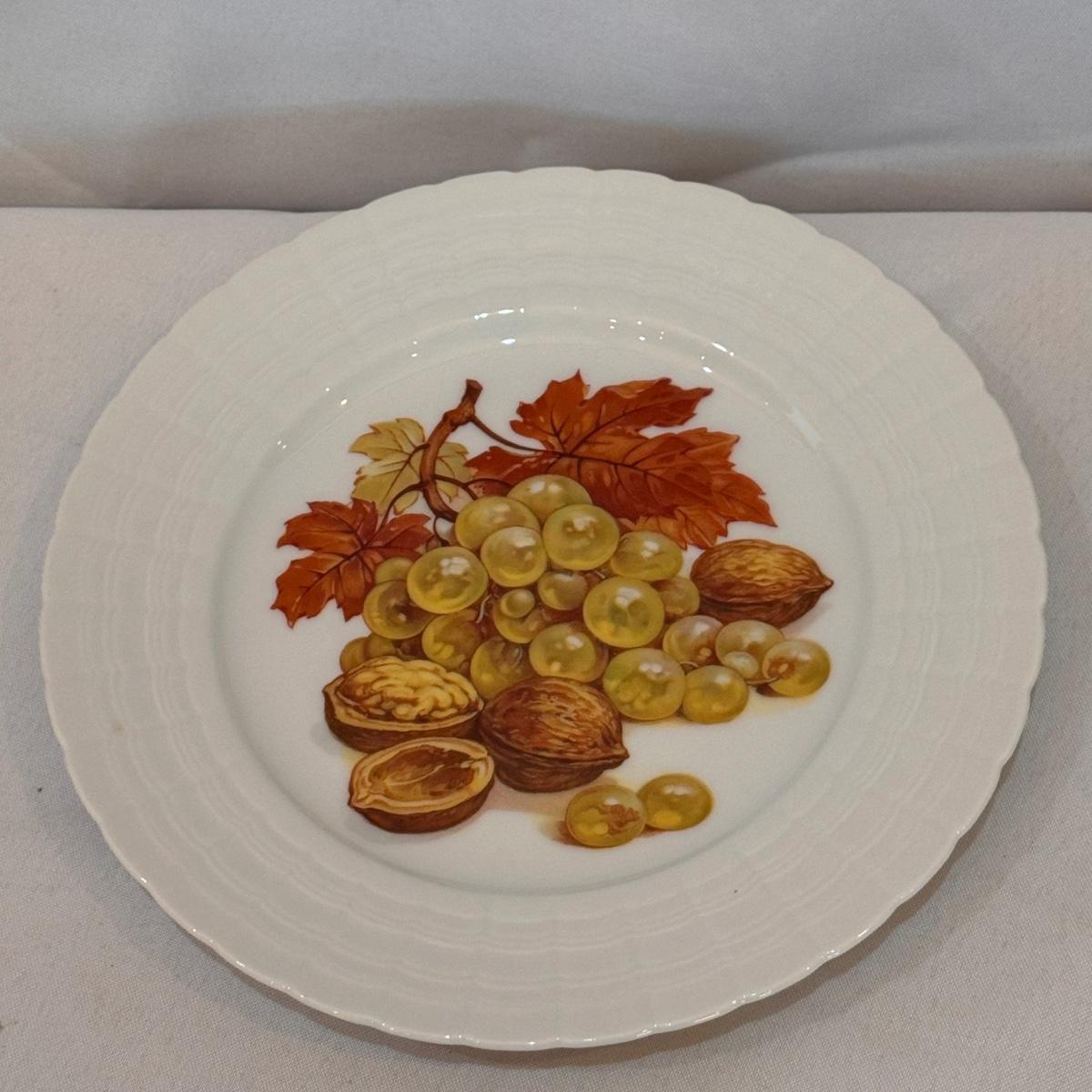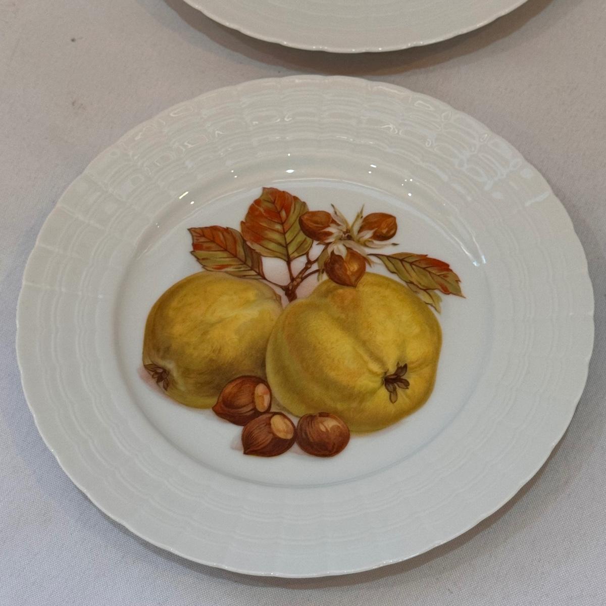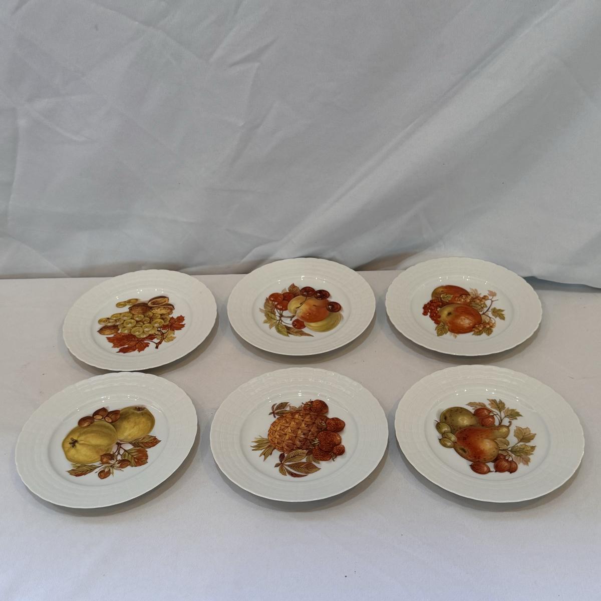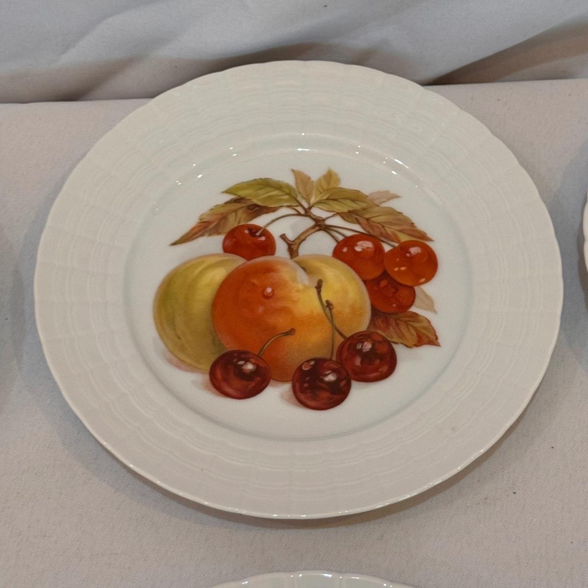 This lot includes two Royal Worcester china bowls with lids in various sizes from the Evesham collection, two porcelain artichoke plates by Pillivuyt, and six porcelain plates by Hutschenreuther. The artichoke plates individually measure 9” x 1”H. Shipping available.