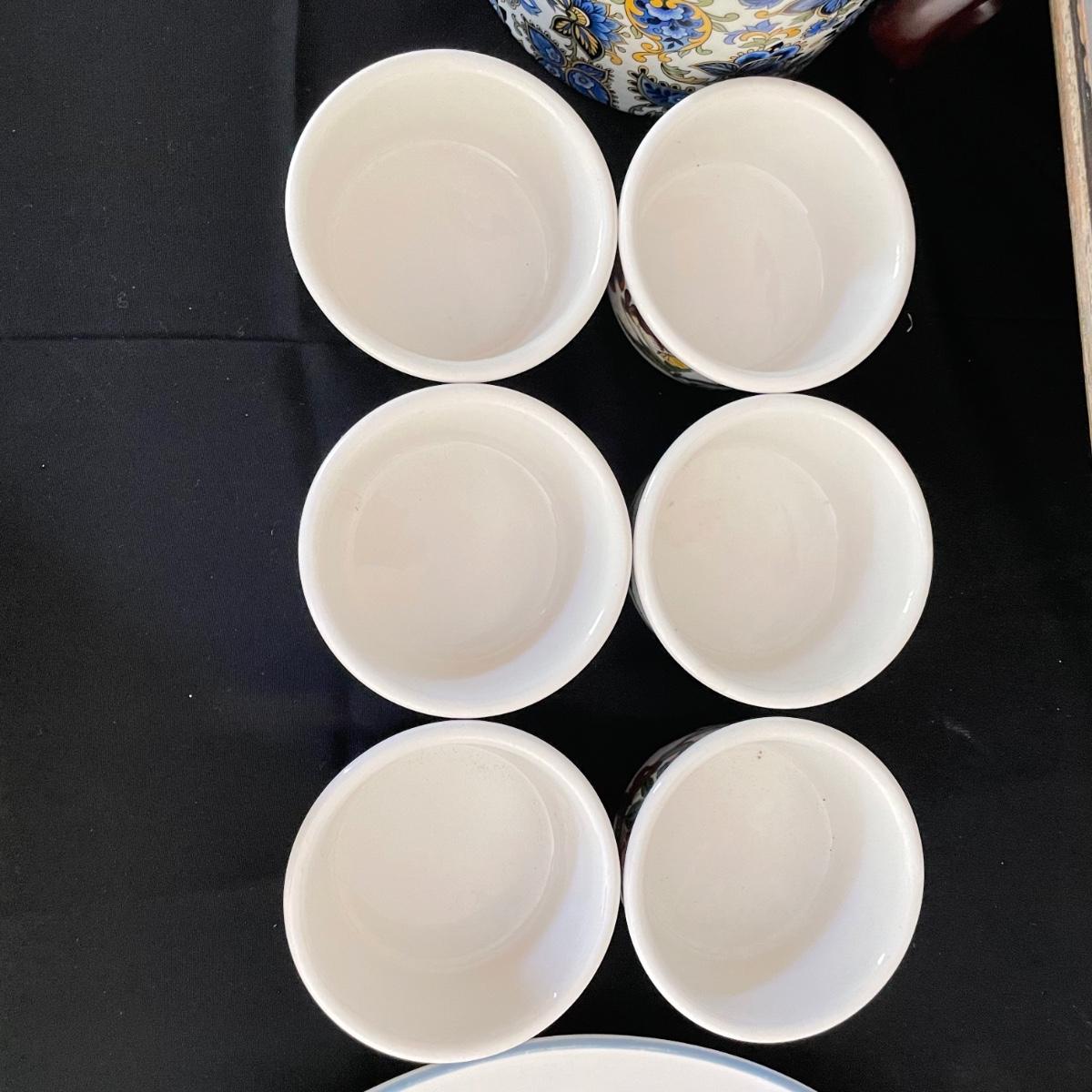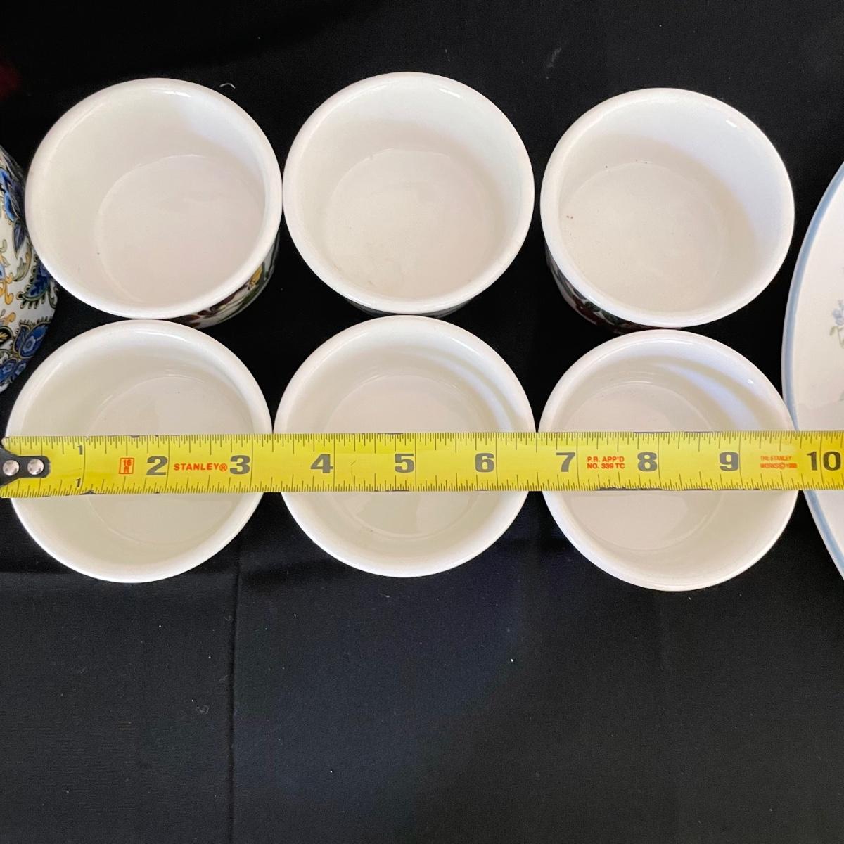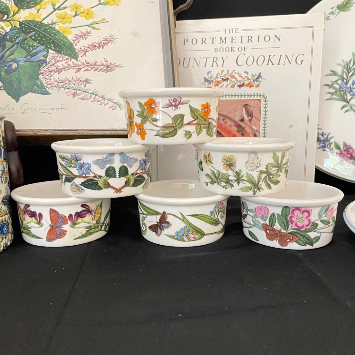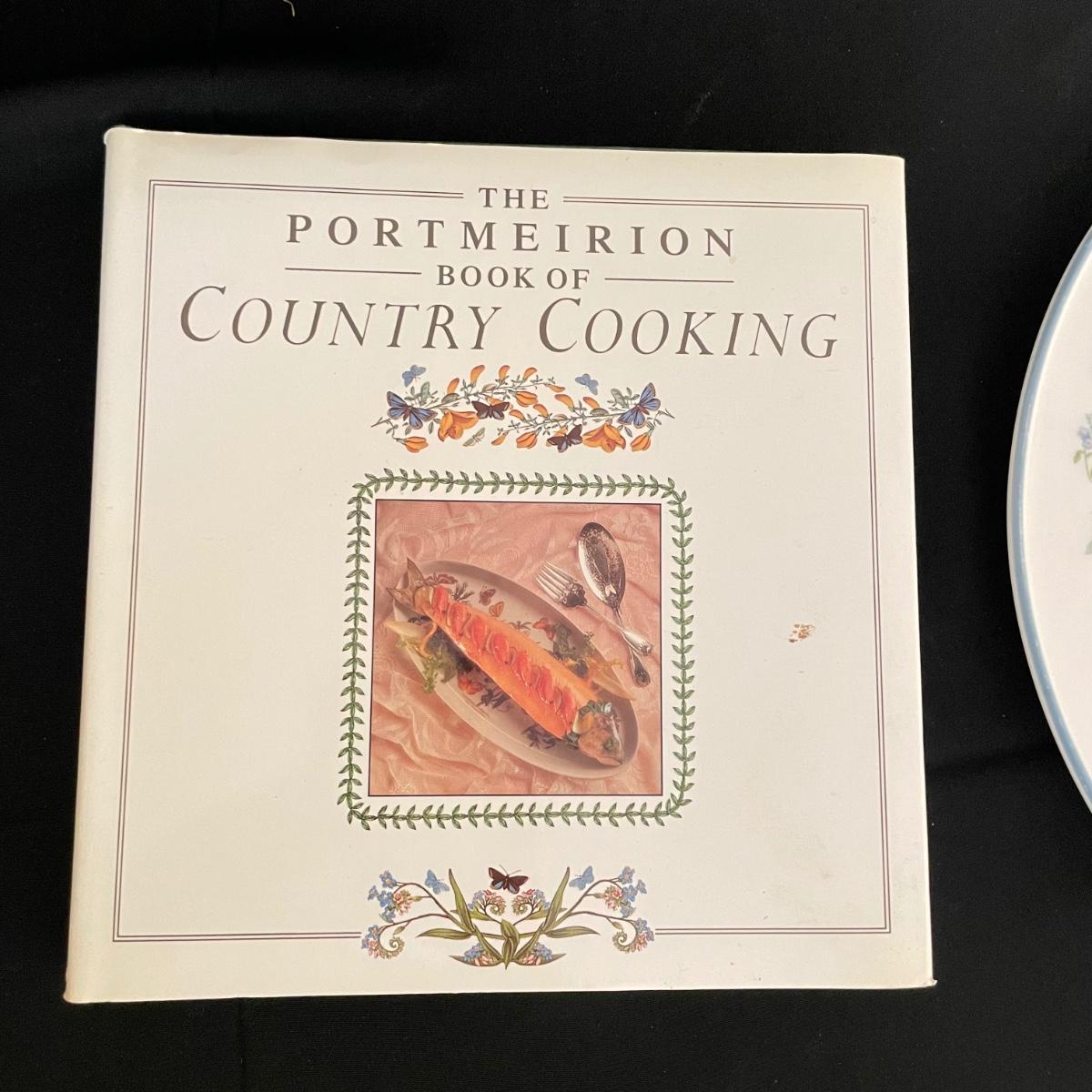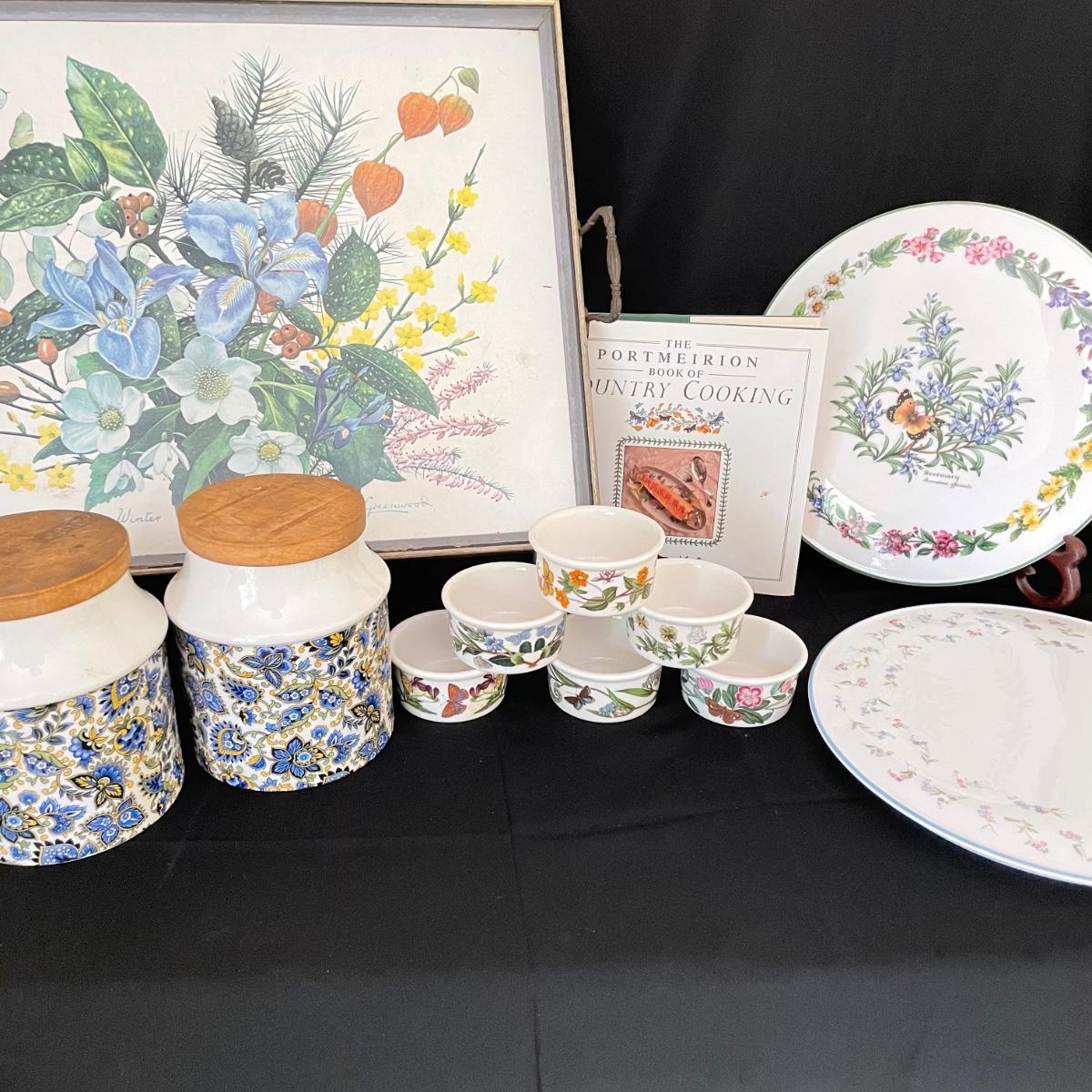 Two Royal Worcester China plates with six ramekins and a cookbook from Port Meirion. Lot also includes a floral tray titled “Winter”, two paisley inspired crocks and wooden stands. The tray measures 21” x 15”. See images. Local pick up only.