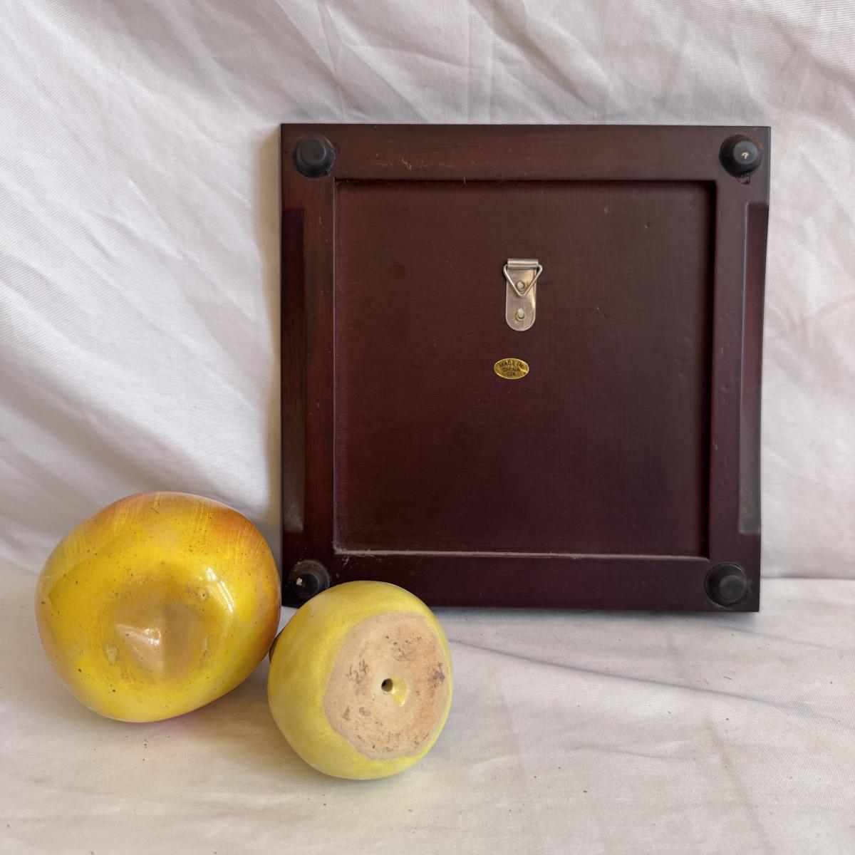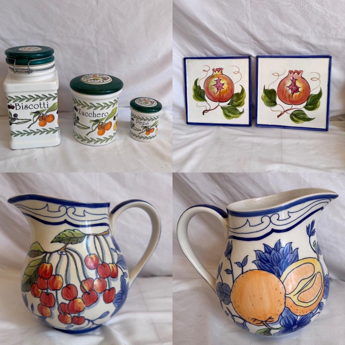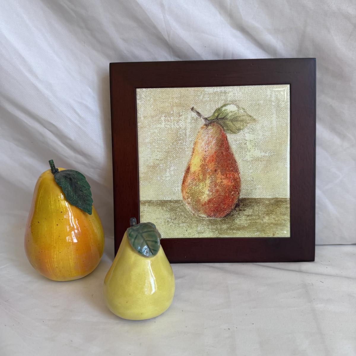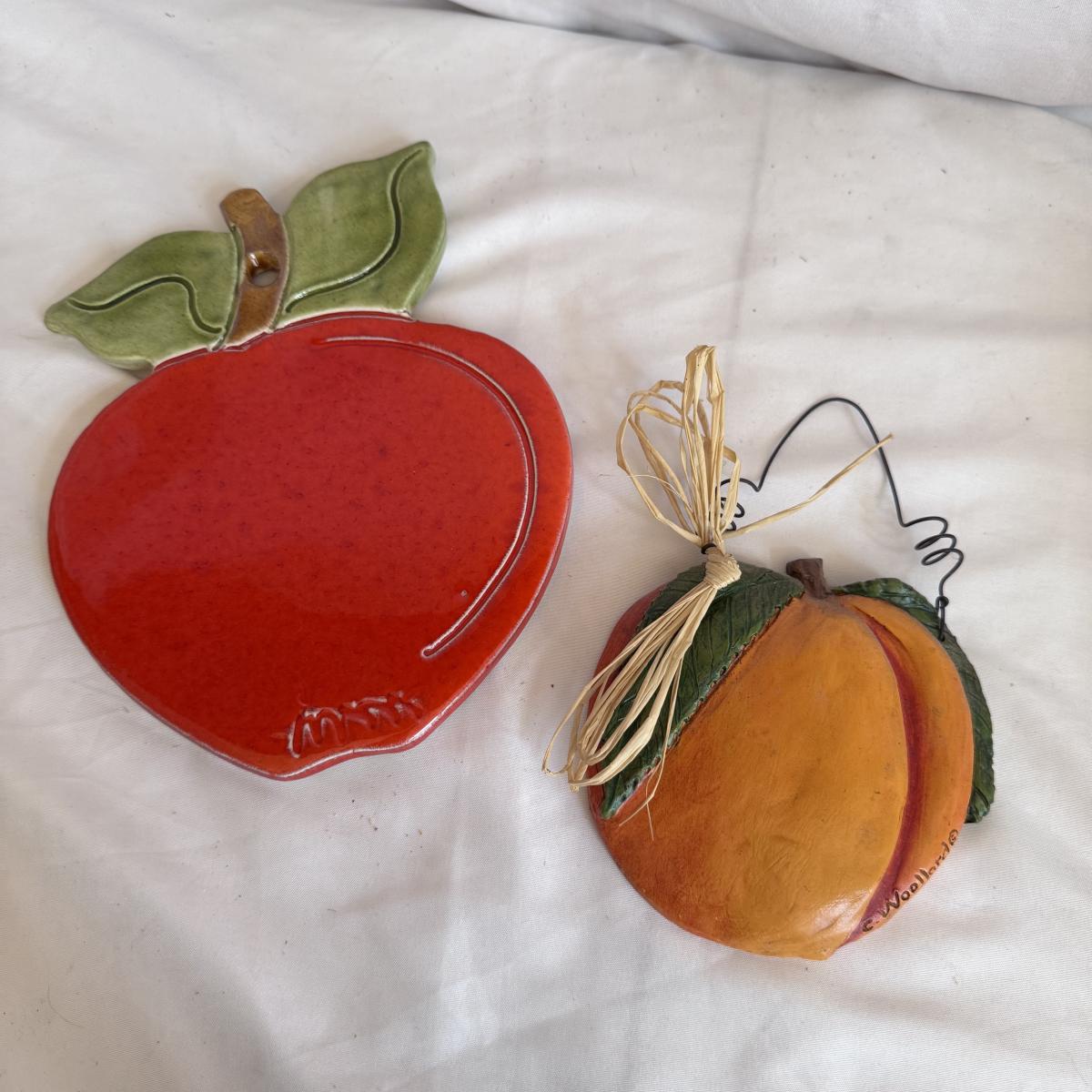 This lot of fruit-themes items includes two hand-painted ceramic mugs from Pacific Rim, one ceramic pitcher from Chateau, two porcelain dishes from Royal Worcester’s Evesham collection, and six coasters from Pimpernel. You’ll also find three ceramic kitchen storage canisters by Spigarelli, two decorative ceramic pears, one wooden framed pear on tile, two fruit tiles by Sur la Table, and a wall hanging apple and peach. The peach is signed by C. Woollard. The largest item is the porcelain bowl that measures 10.25” x 1.5”H. Shipping available.