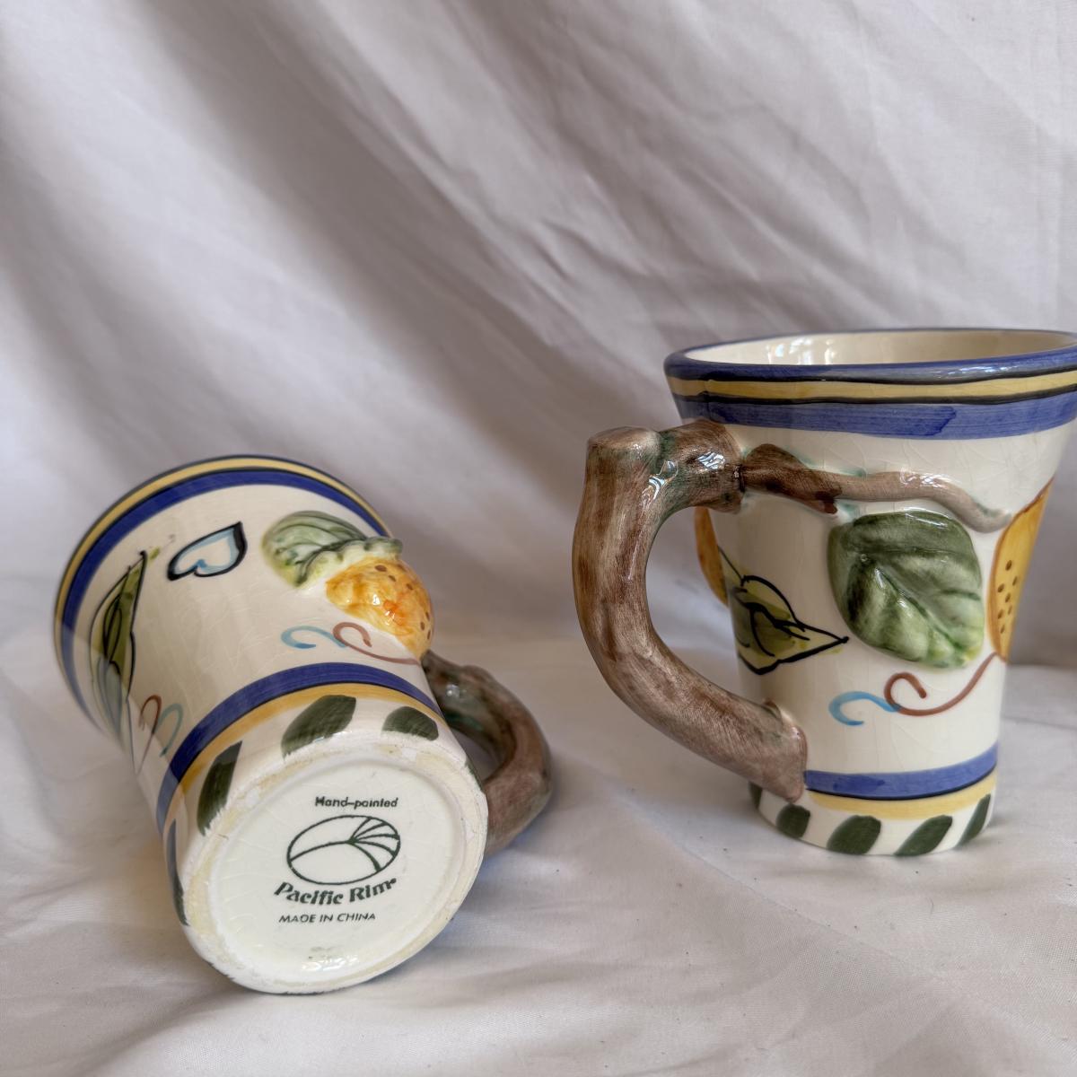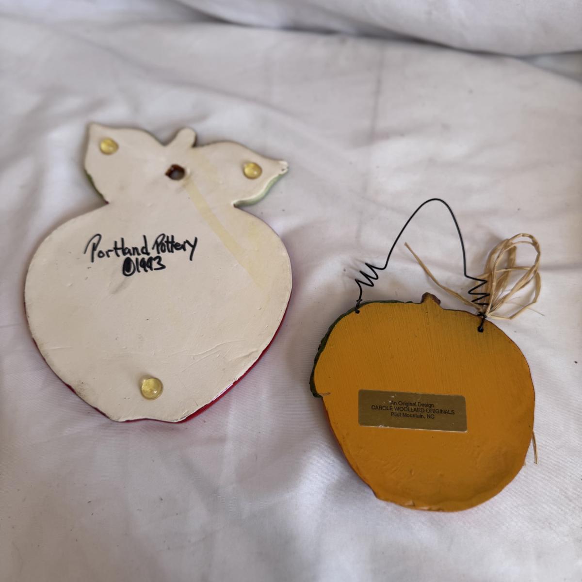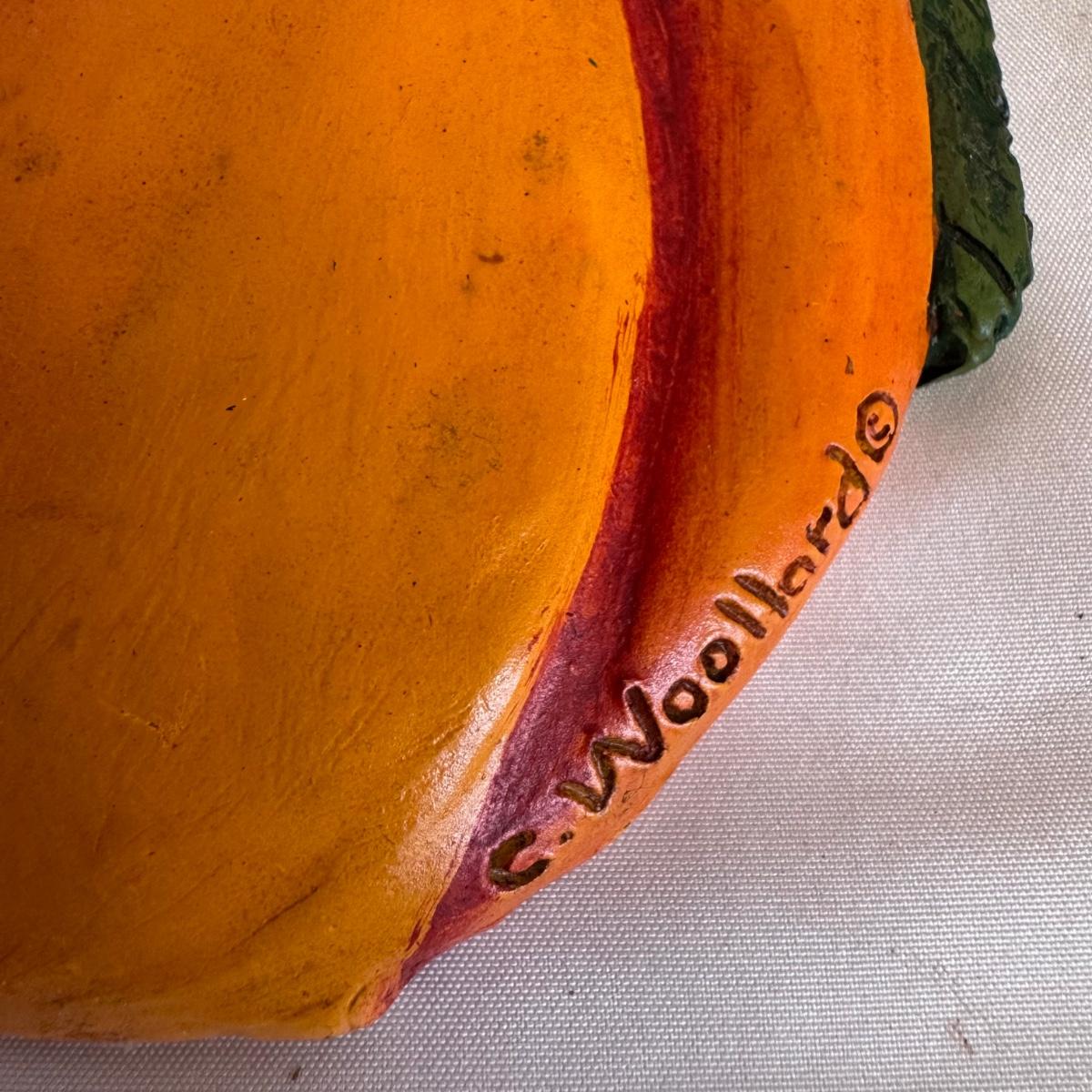 This lot of fruit-themes items includes two hand-painted ceramic mugs from Pacific Rim, one ceramic pitcher from Chateau, two porcelain dishes from Royal Worcester’s Evesham collection, and six coasters from Pimpernel. You’ll also find three ceramic kitchen storage canisters by Spigarelli, two decorative ceramic pears, one wooden framed pear on tile, two fruit tiles by Sur la Table, and a wall hanging apple and peach. The peach is signed by C. Woollard. The largest item is the porcelain bowl that measures 10.25” x 1.5”H. Shipping available.