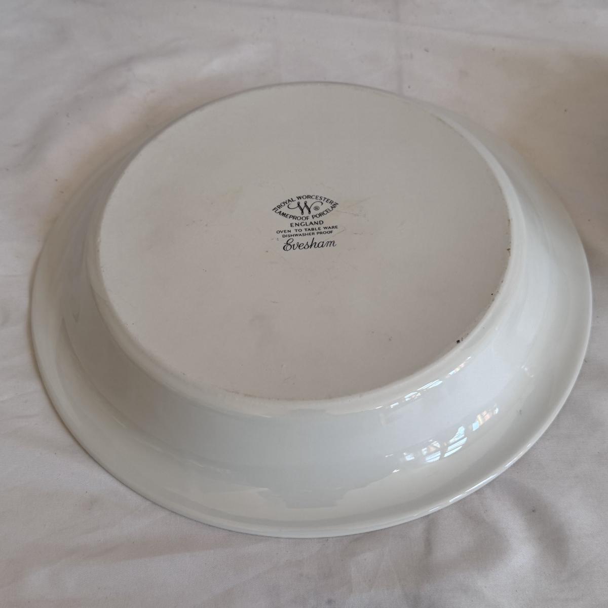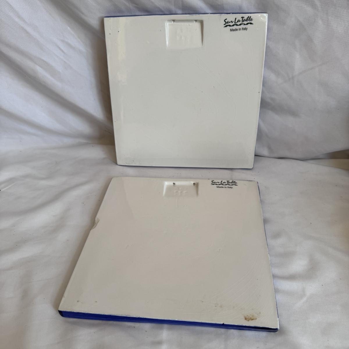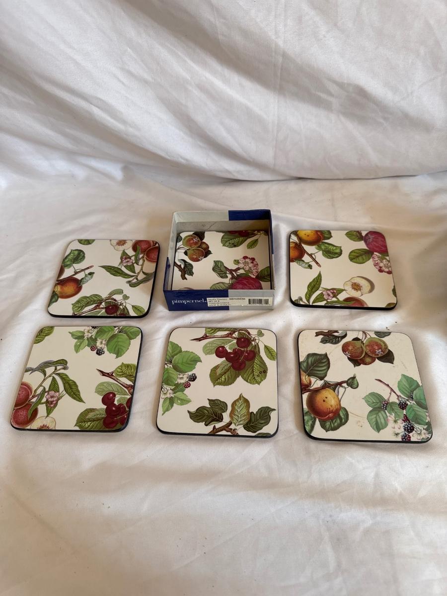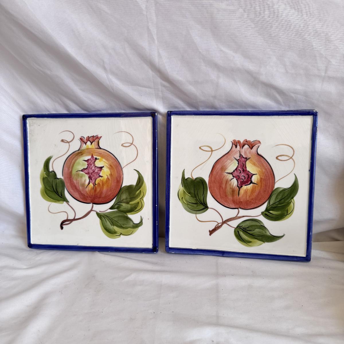 This lot of fruit-themes items includes two hand-painted ceramic mugs from Pacific Rim, one ceramic pitcher from Chateau, two porcelain dishes from Royal Worcester’s Evesham collection, and six coasters from Pimpernel. You’ll also find three ceramic kitchen storage canisters by Spigarelli, two decorative ceramic pears, one wooden framed pear on tile, two fruit tiles by Sur la Table, and a wall hanging apple and peach. The peach is signed by C. Woollard. The largest item is the porcelain bowl that measures 10.25” x 1.5”H. Shipping available.