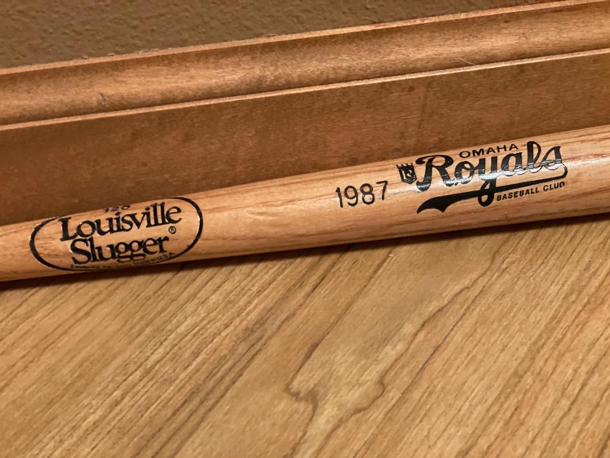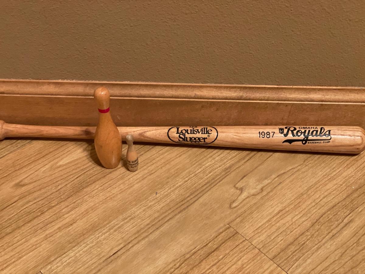 2 bowling pins & mini Louisville Slugger Royals Bat