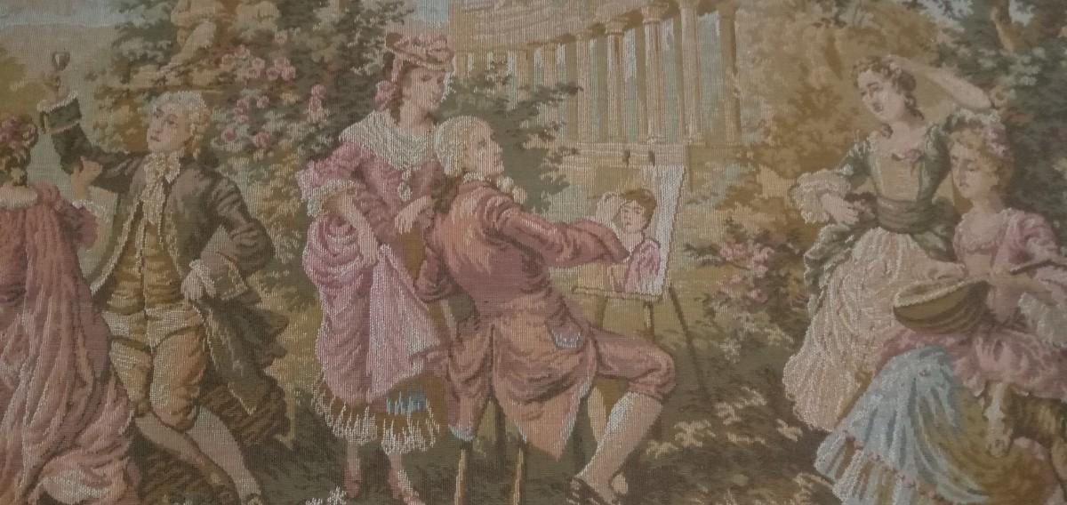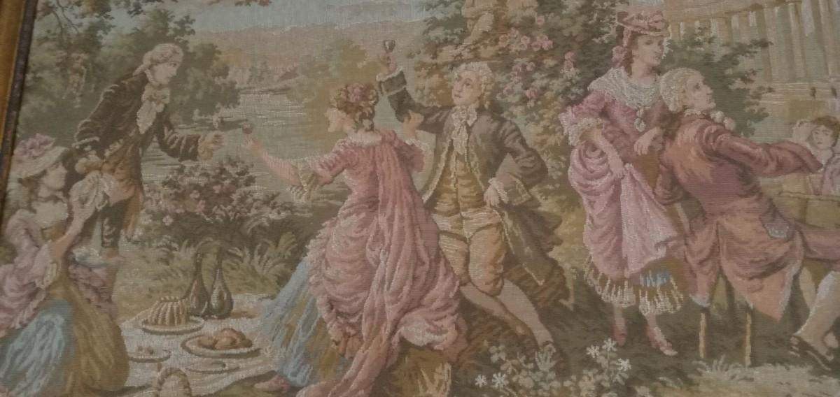 This fine tapestry, "Royalty in the Park", depicts the lavish lives of upper class royals as they enjoy a summer picnic in a wooded opening in a park . The fine detailing, skillful use of color and engaging composition is classic Boucher.
