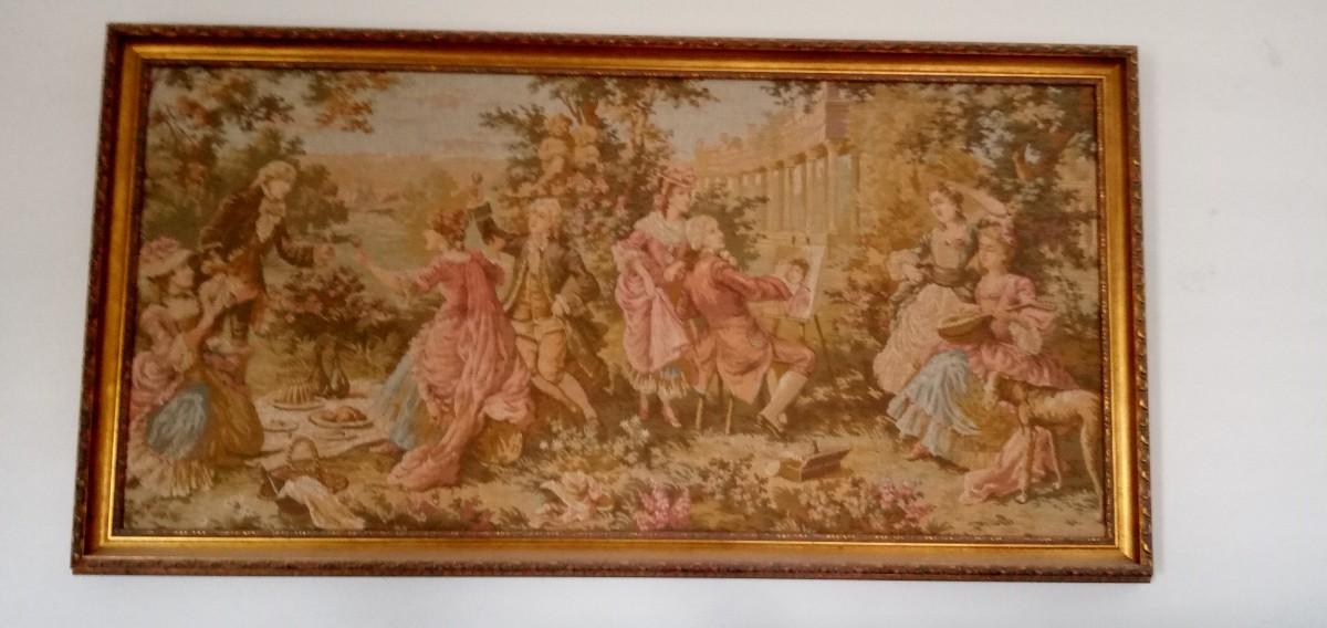 Arguably, Francois Boucher was one of the greatest artisit in the rococo style prevalent under the monary of Louis XV. Inspired by the 18th century landscapes artisit, Jean-Antoine Watteau, Boucher's idyllic depictions of mythological and pastoral art are much prized by museums and collectors. Being King Louis' court painter, Boucher's tapestries often portrayed scenes of French royal life. Such is this case with this fine tapestry, which depicts the lavish lives of the upper class royals as they enjoy a summer picnic in a wooded opening in a park. The fine detailing, skillful use of color and engaging composition is classic Boucher. Royalty on the Park is framed tastefully.