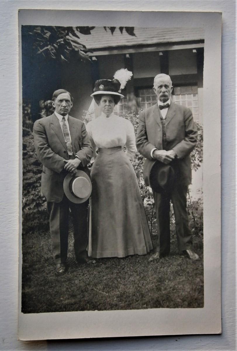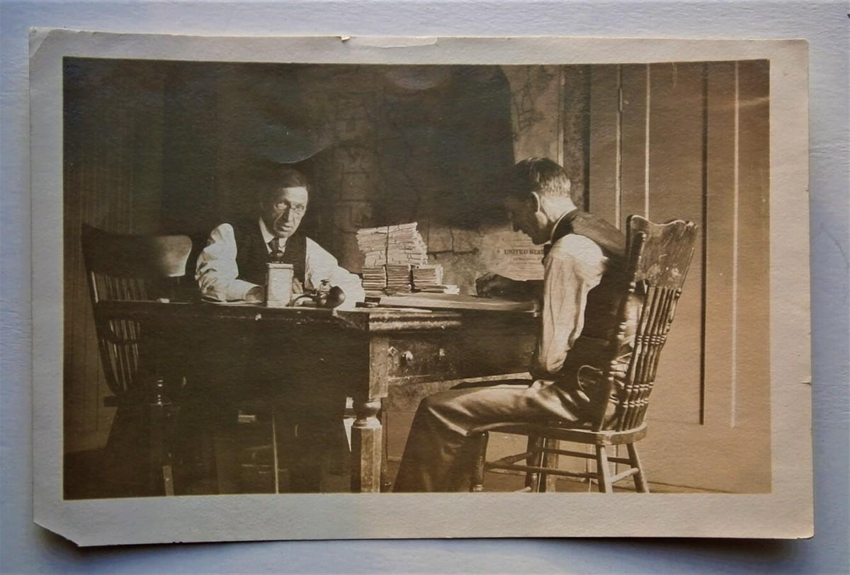 RPO of Men "Partners" Doing Clerical Work and Other of Same Men in Sunday Dress, the occupational RPO is printed on light paper and was never mailed, the woman in-between the men is probably the same who wrote the note, both images came from same album.
