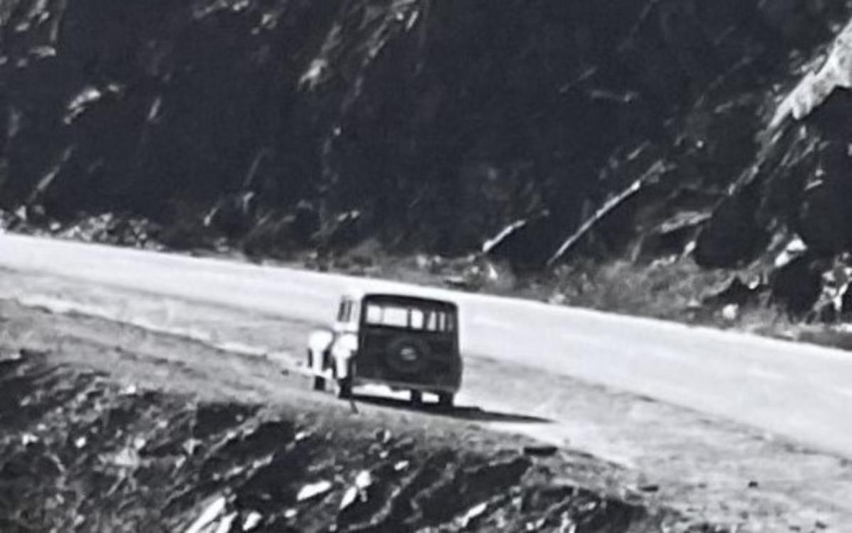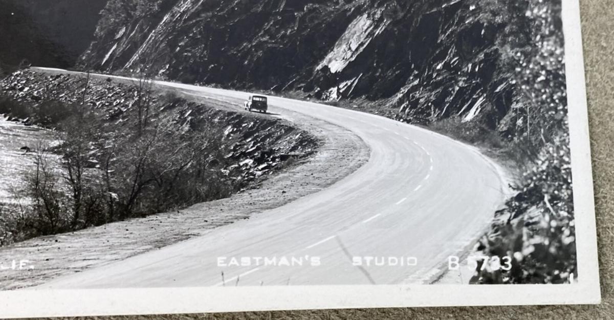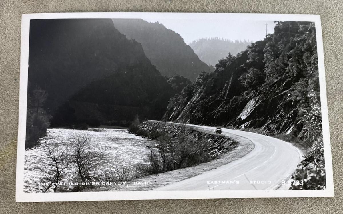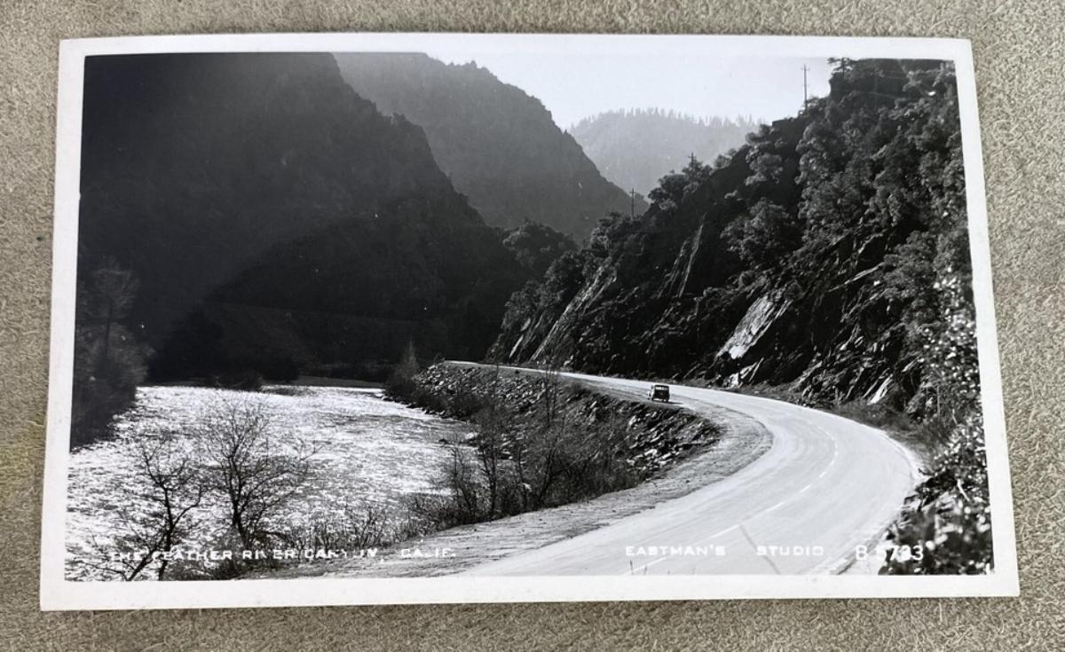 Very good condition on this vintage b/w rppc of THE FEATHER RIVER CANYON, CALIF....On EKC paper circa 1939-1950...Credited to Eastman's Studio...in Susanville...Unposted...Looks like the photographer's Woody station wagon on the side of the road...Note some reflections in my photos..
