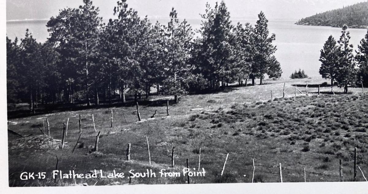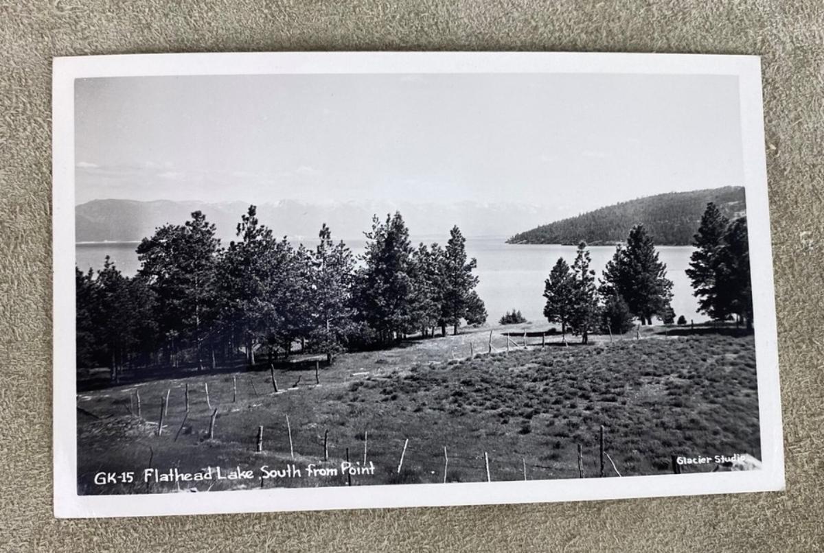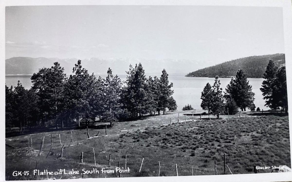 1940's view of Flathead Lake 'South from Point' credited to Glacier Studio...Flathead Lake in Northwest Montana is a natural lake along the mainline of the Flathead River...dammed in 1930 by Kerr Dam at its outlet on Polson Bay...still one of the cleanest lakes in the populated world for its size and type...unposted..This RPPC on EKC paper dates between 1939 and 1950.