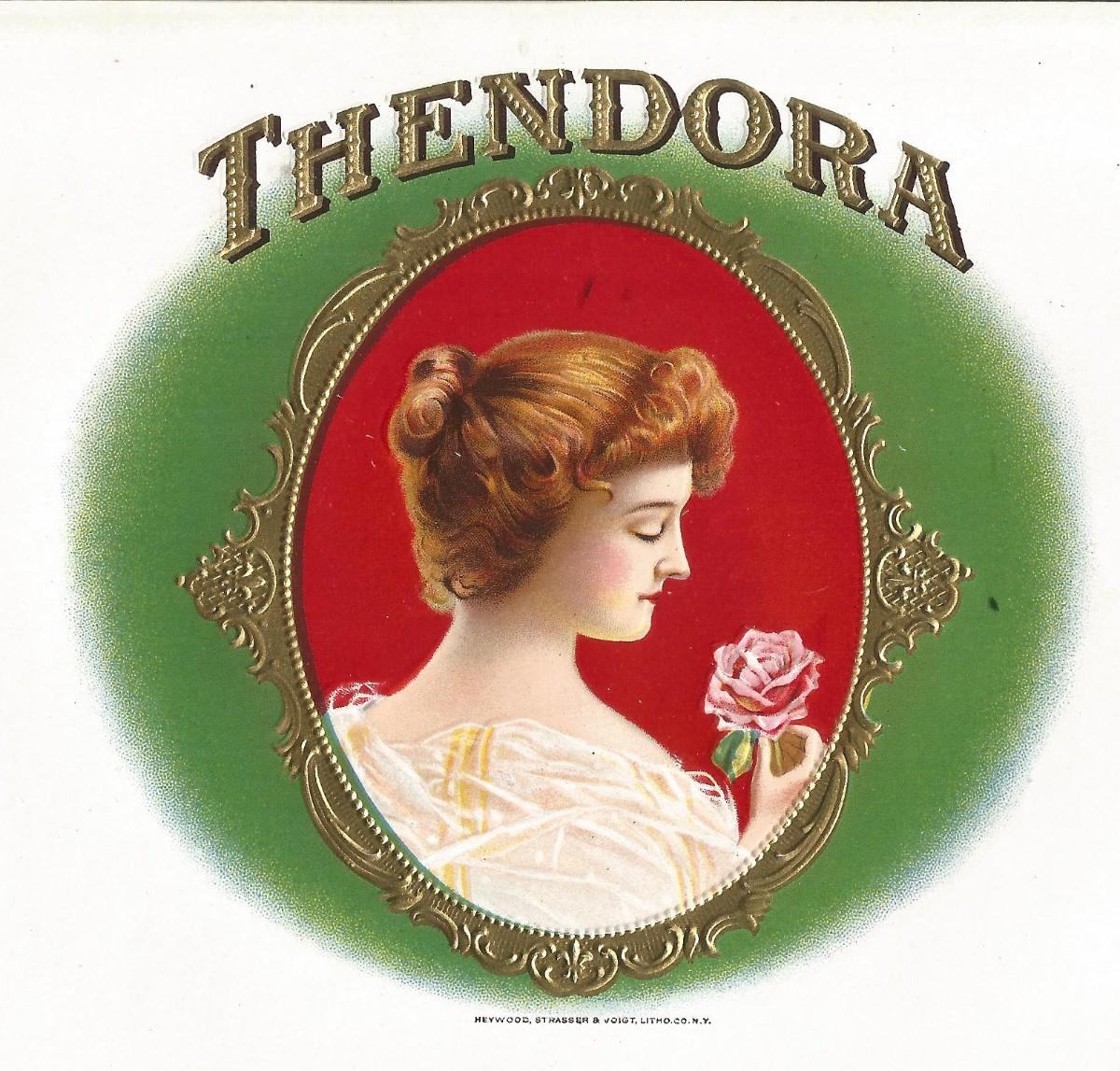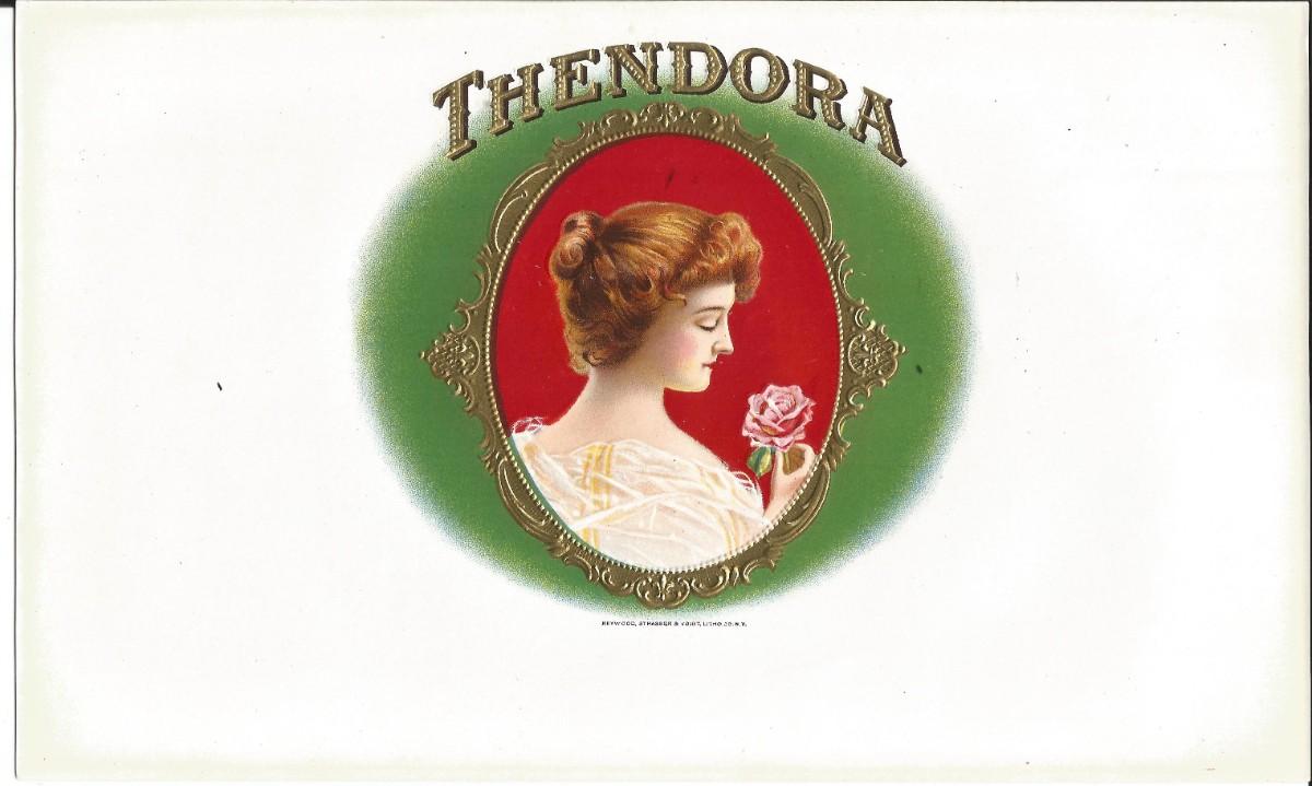 "THENDORA" Embossed Cigar Label from the early 1900’s or earlier, printed by Heywood, Strasser & Voigt Litho. Co. NY, 10 x 6 in., in very nice condition.