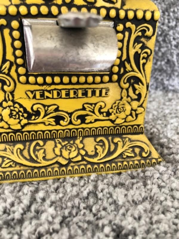 Cute yellow metal gumball machine. Sits on counter or shelf. Made by Venderette, comes with original teaspoon. About 10.5" tall. Good vintage condition.