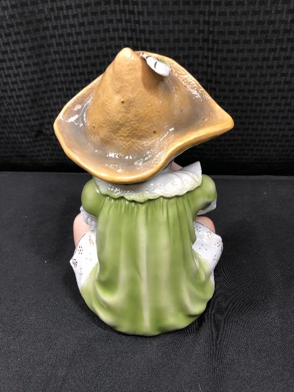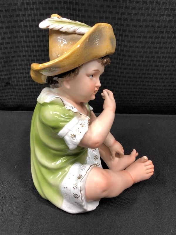 Vintage ceramic piano baby figurine. Child in green with a feathered hat, sitting. Under 12" size. #020-00211