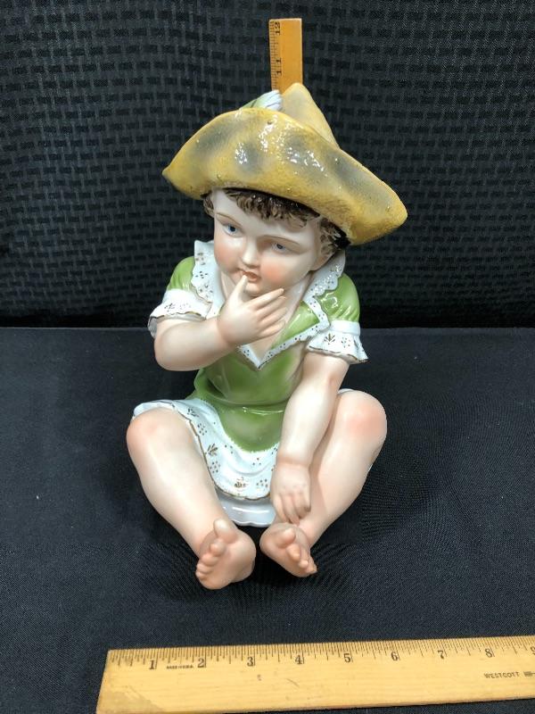 Vintage Ceramic Piano Baby Child in Feathered Hat Figurine Statue