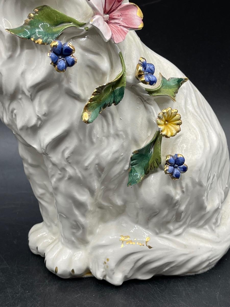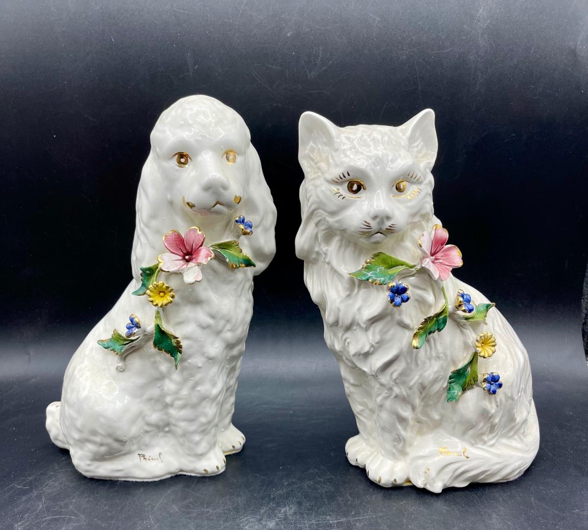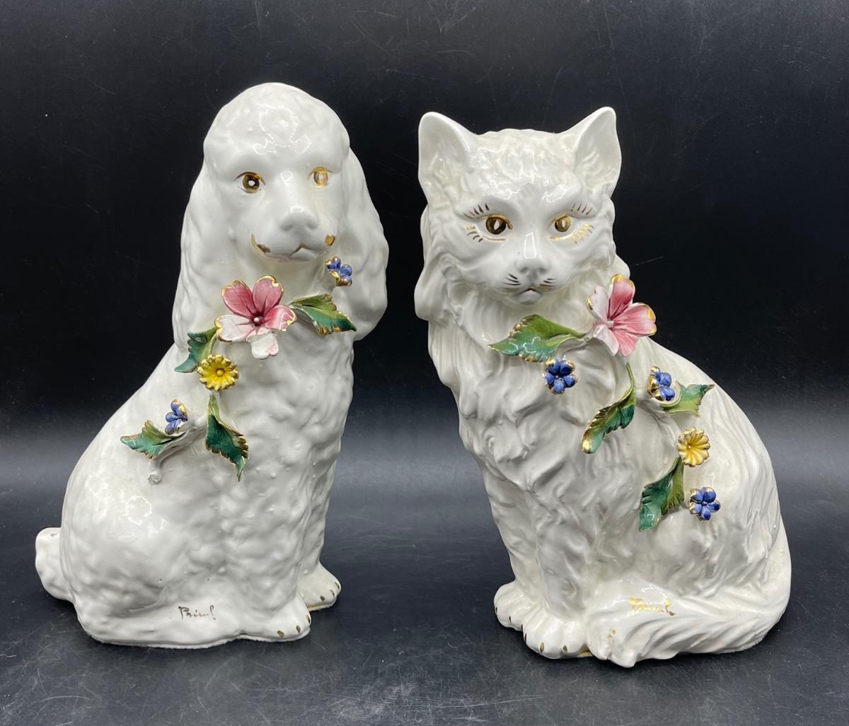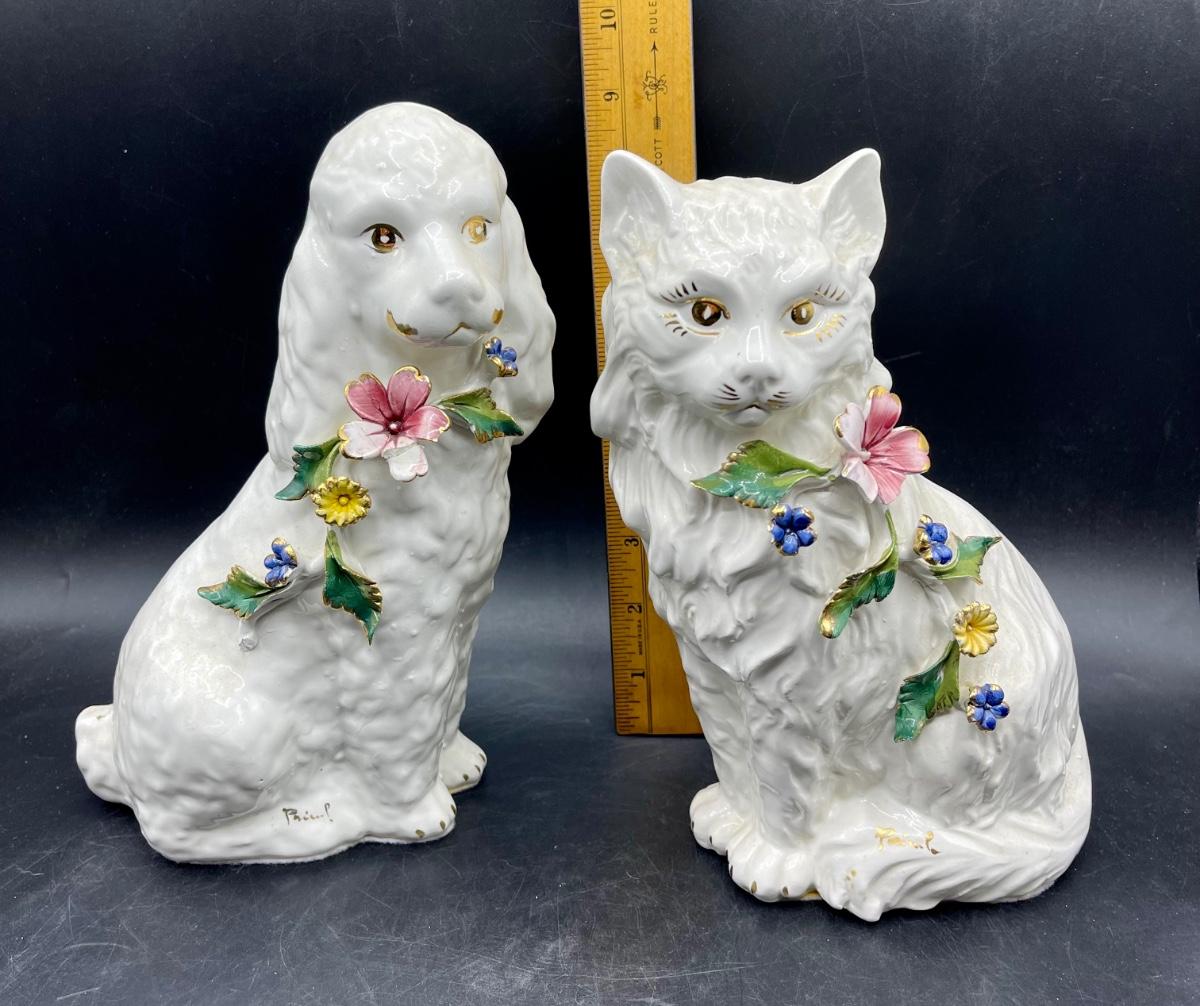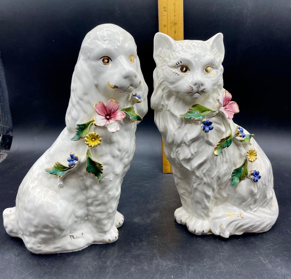 Vintage ceramic porcelain white Cat & Dog Figurines statues with painted flowers signed