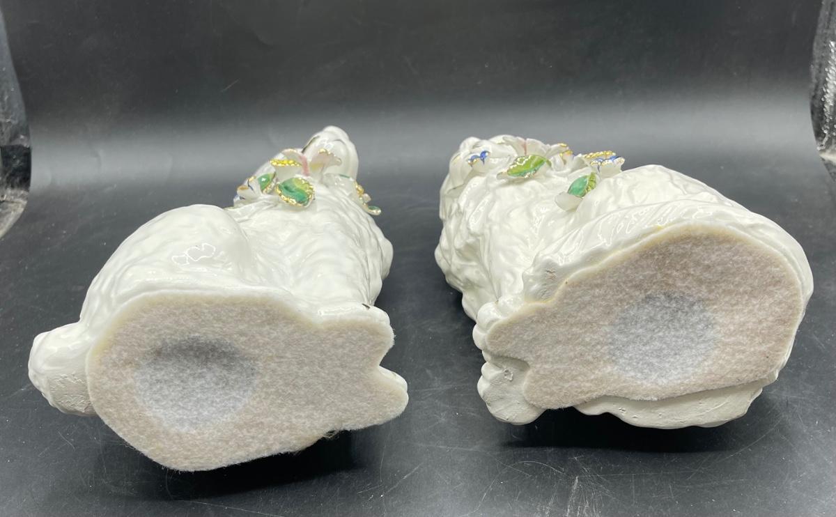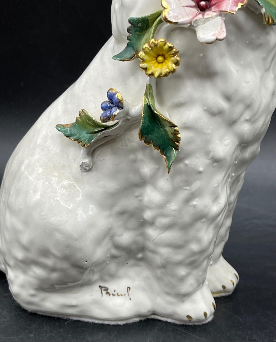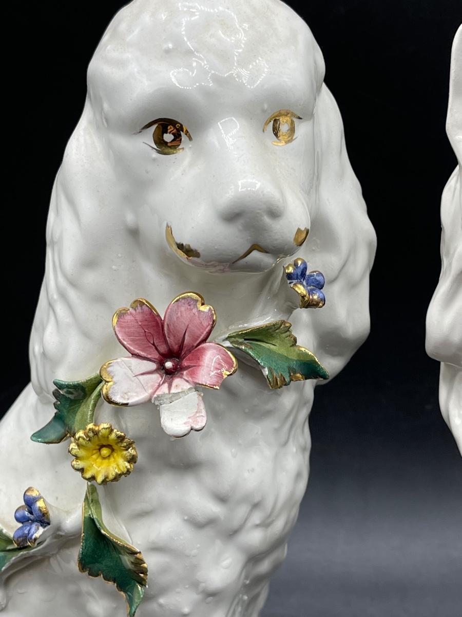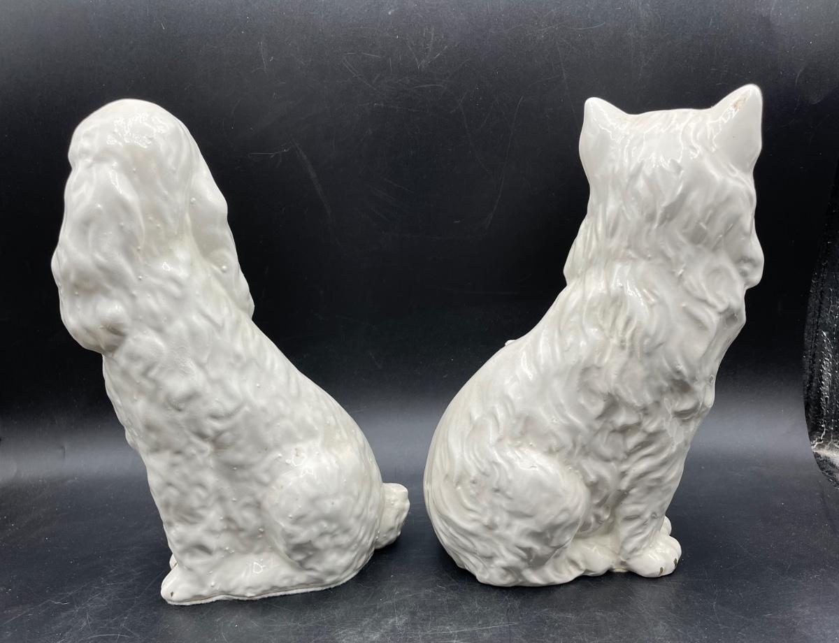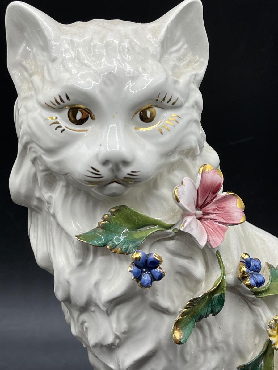 Vintage ceramic porcelain white Cat & Dog Figurines statues with painted flowers signed