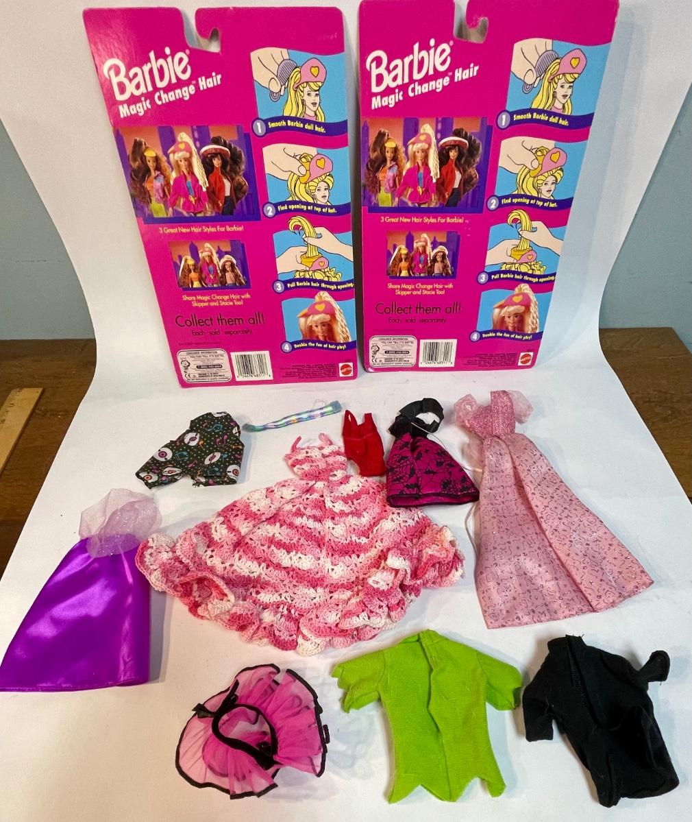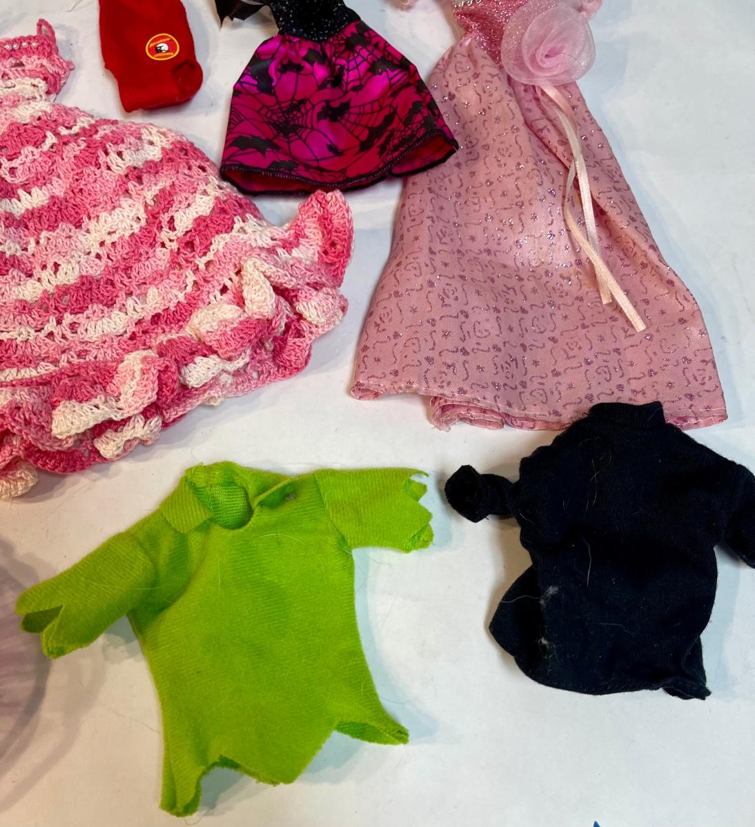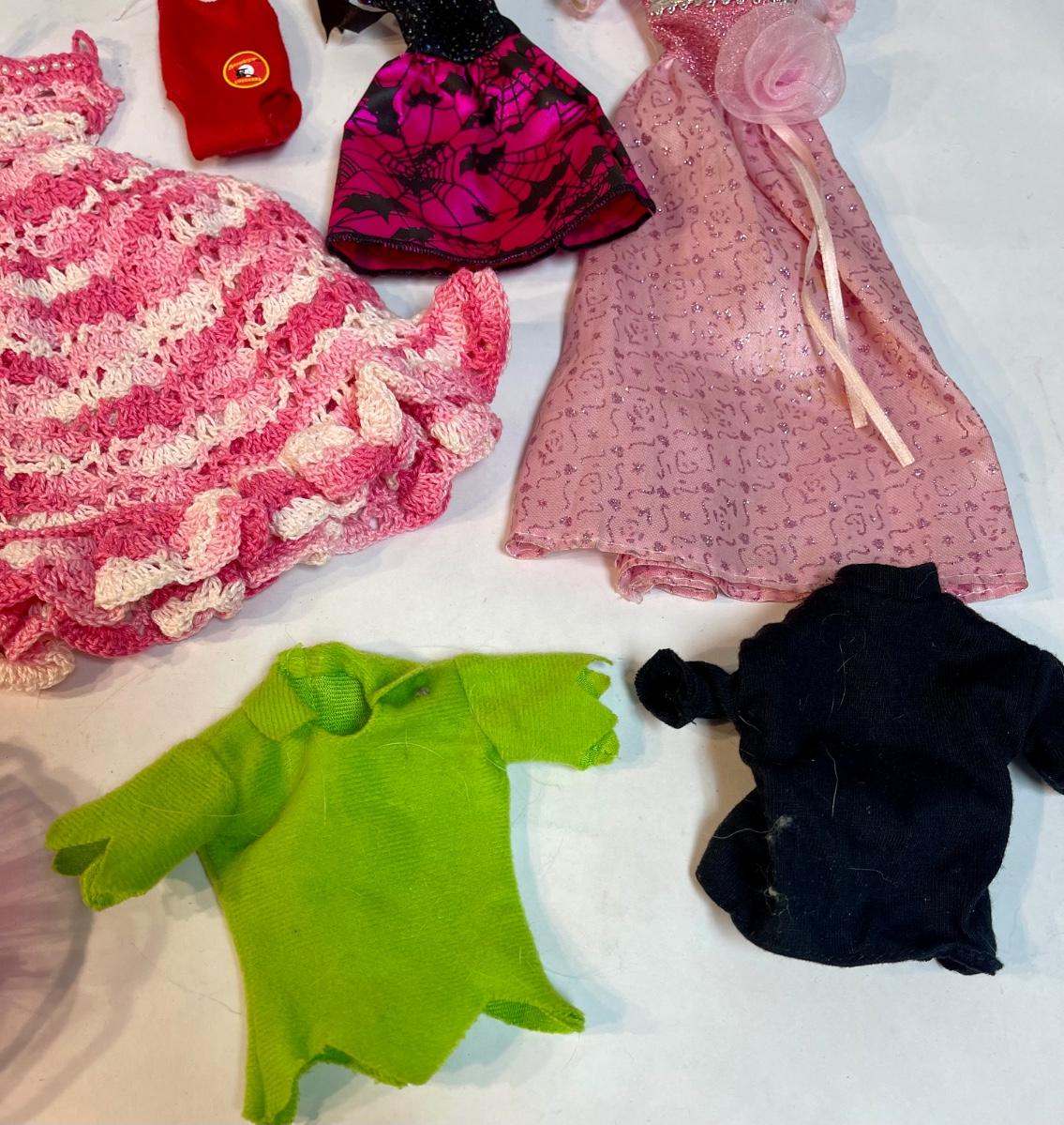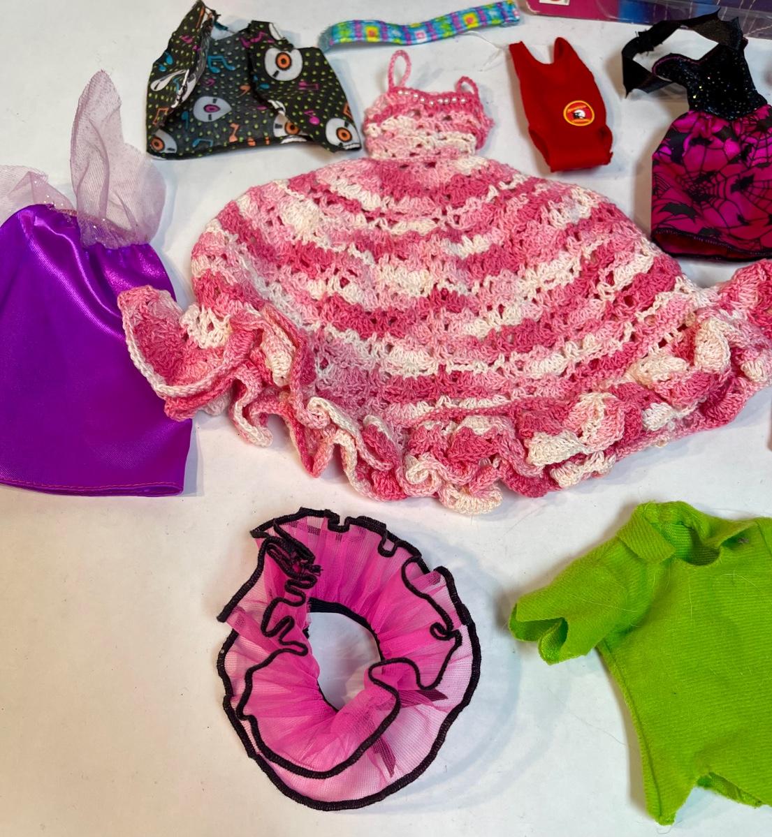 Clothing includes a homemade knit dress and 2 new in package wigs. See photos for more details and condition.