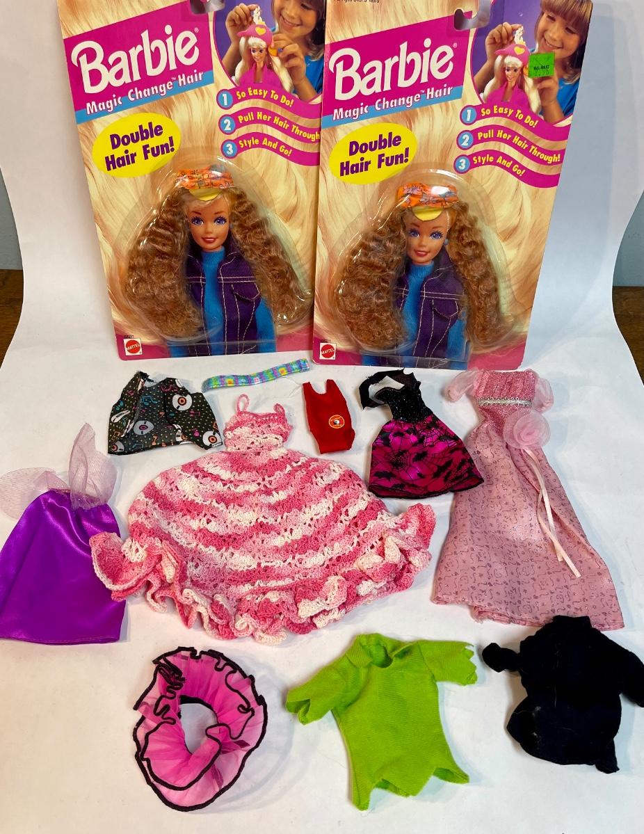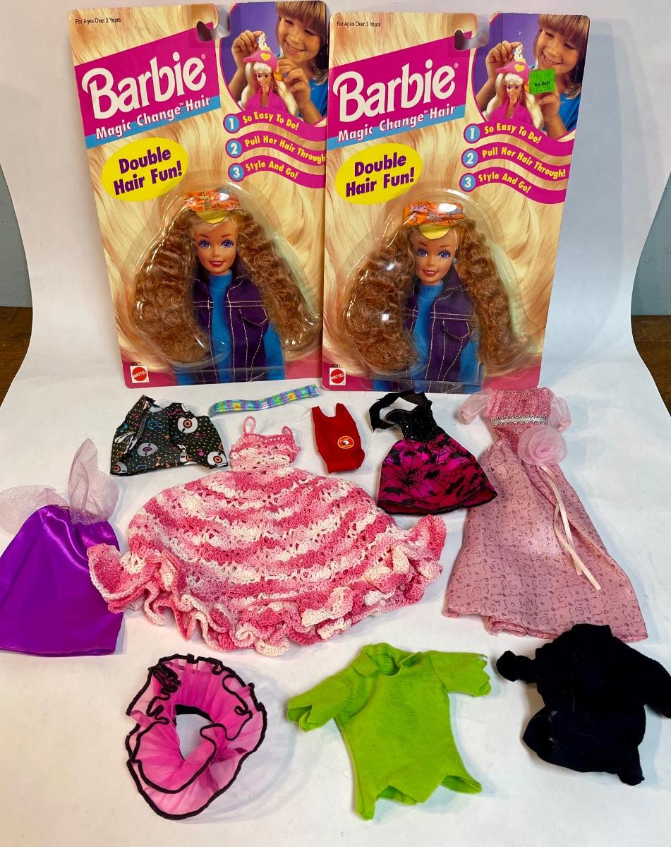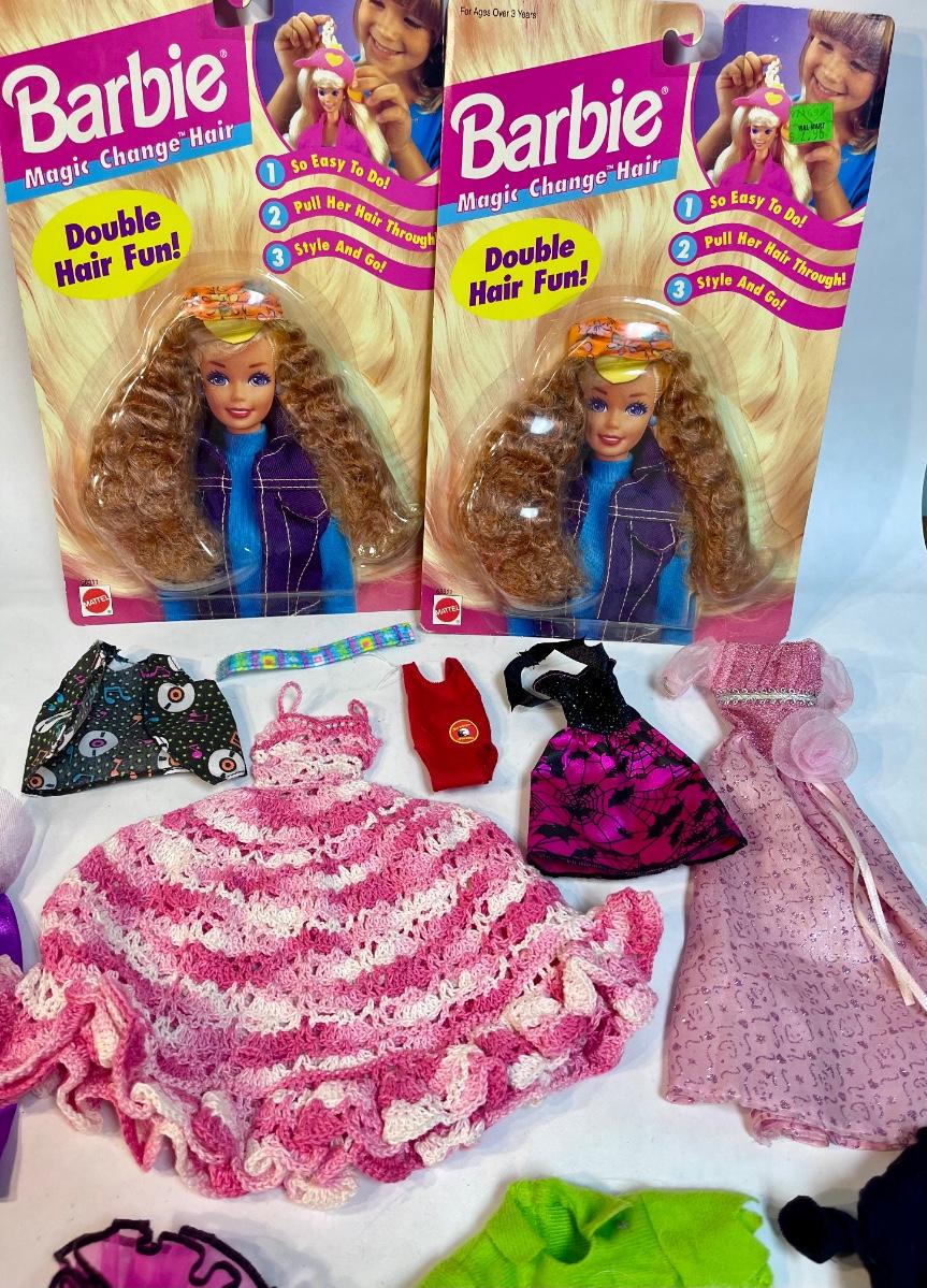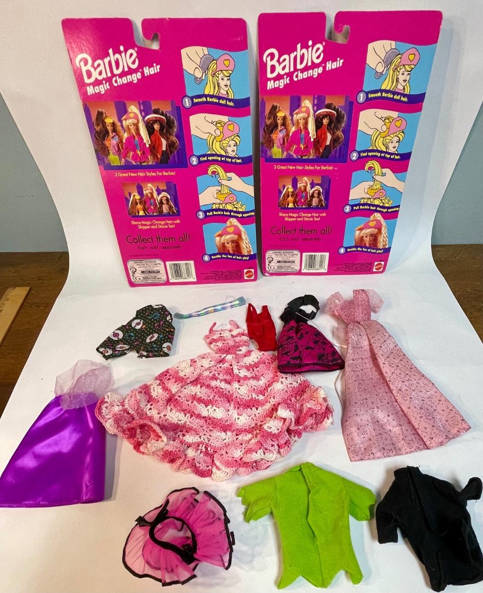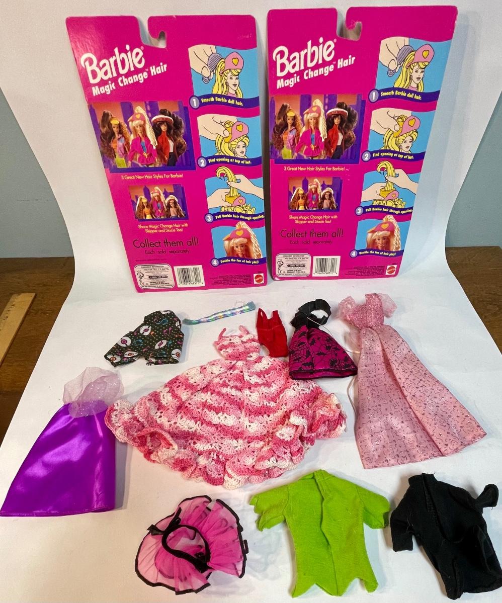 Clothing includes a homemade knit dress and 2 new in package wigs. See photos for more details and condition.