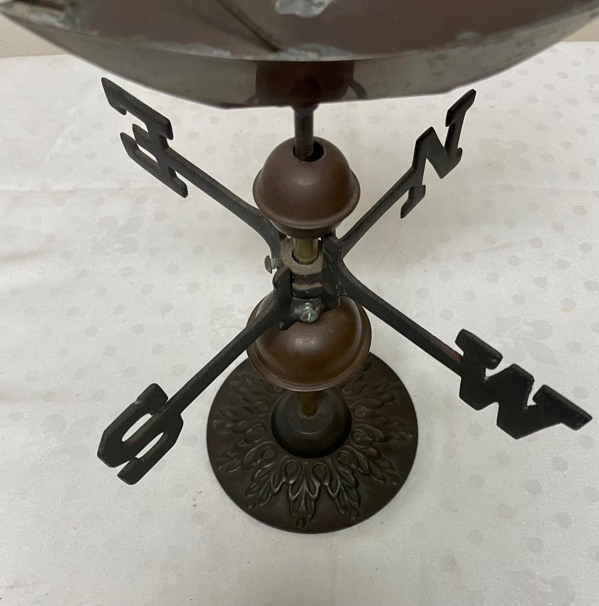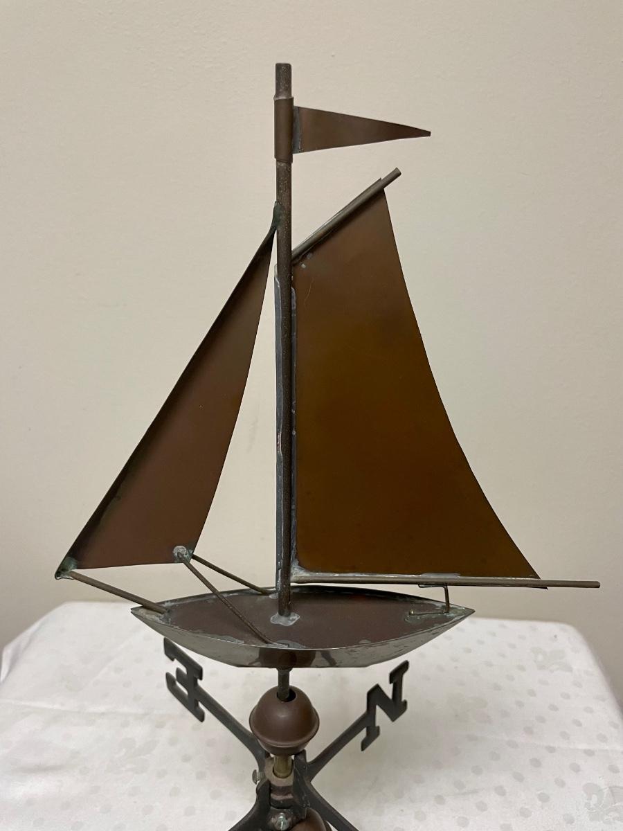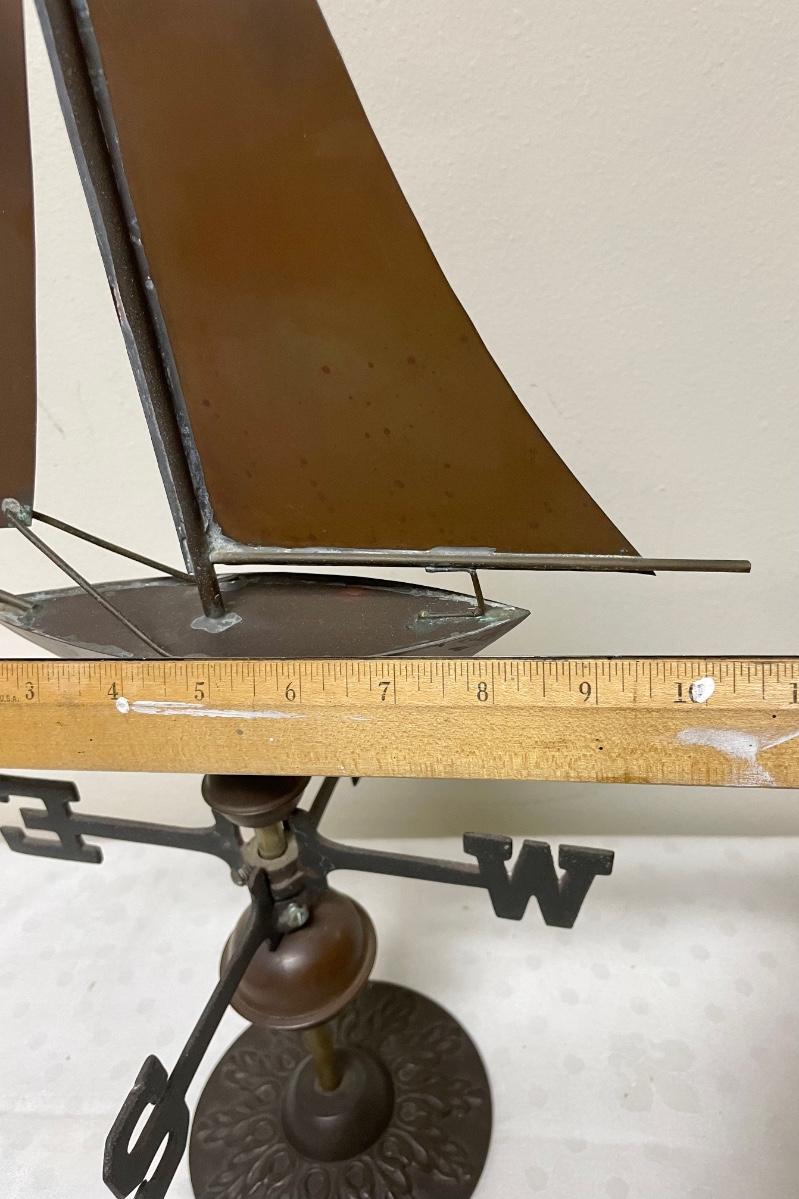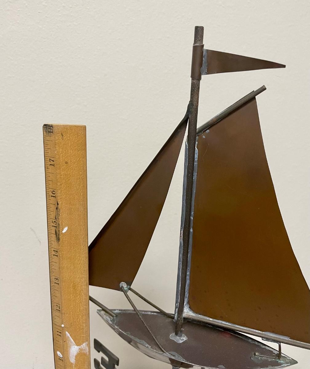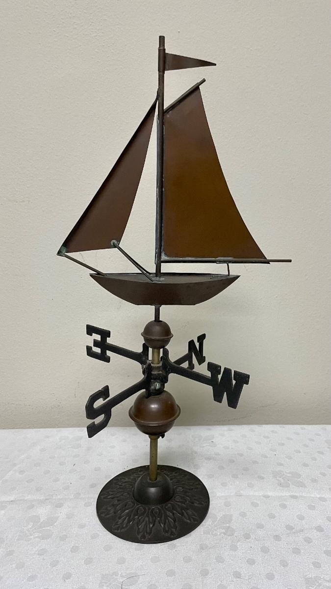 Brass Sailboat Weathervane Display Model. Multiple parts, when assembled sits on sturdy base with N-E-S-W lettered spinning direction indicators and rotating sailboat at the top. Nearly 20" tall, Solid cast base with brazed brass sheet parts.