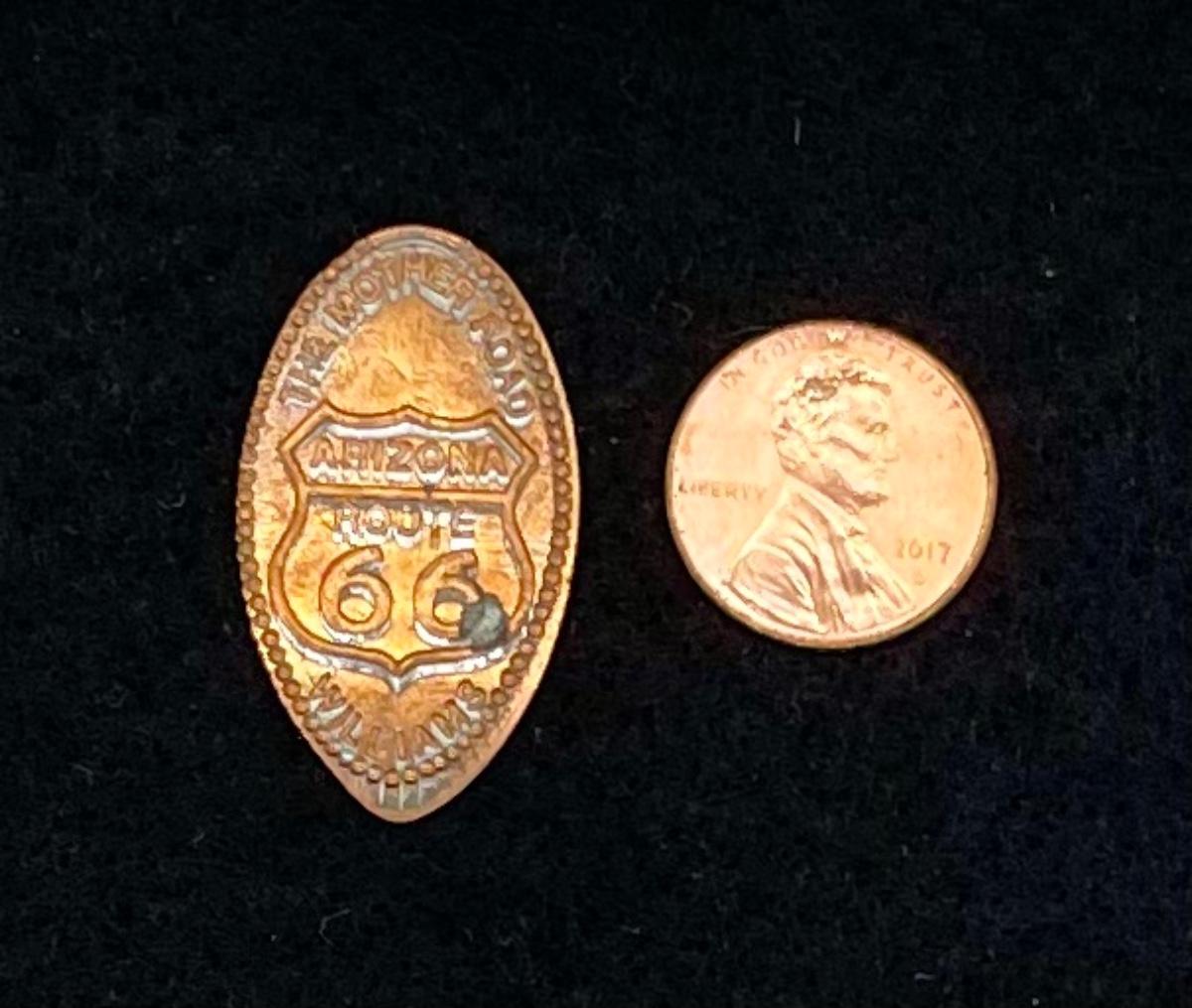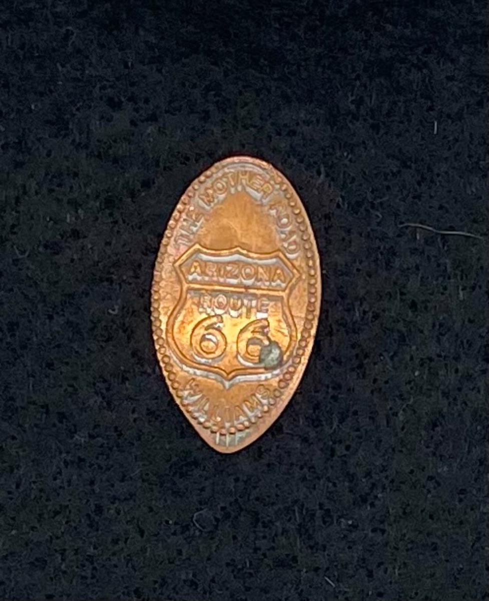 Has a raised Rout 66 road sign with ARIZONA at the top and the words "The Mother Road" above and "Williams" below. Slightly curved, some visible tarnish.