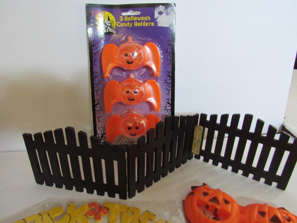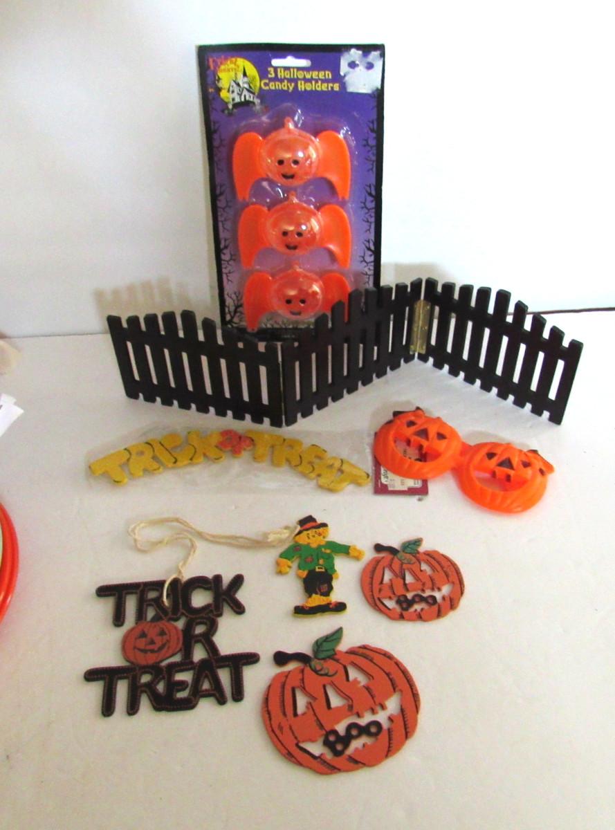 Misc Halloween Lot Wood Ornaments, Plastic Glasses, More
