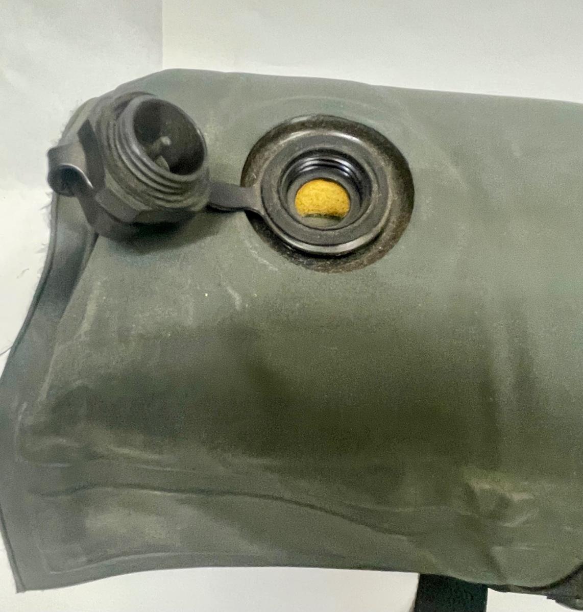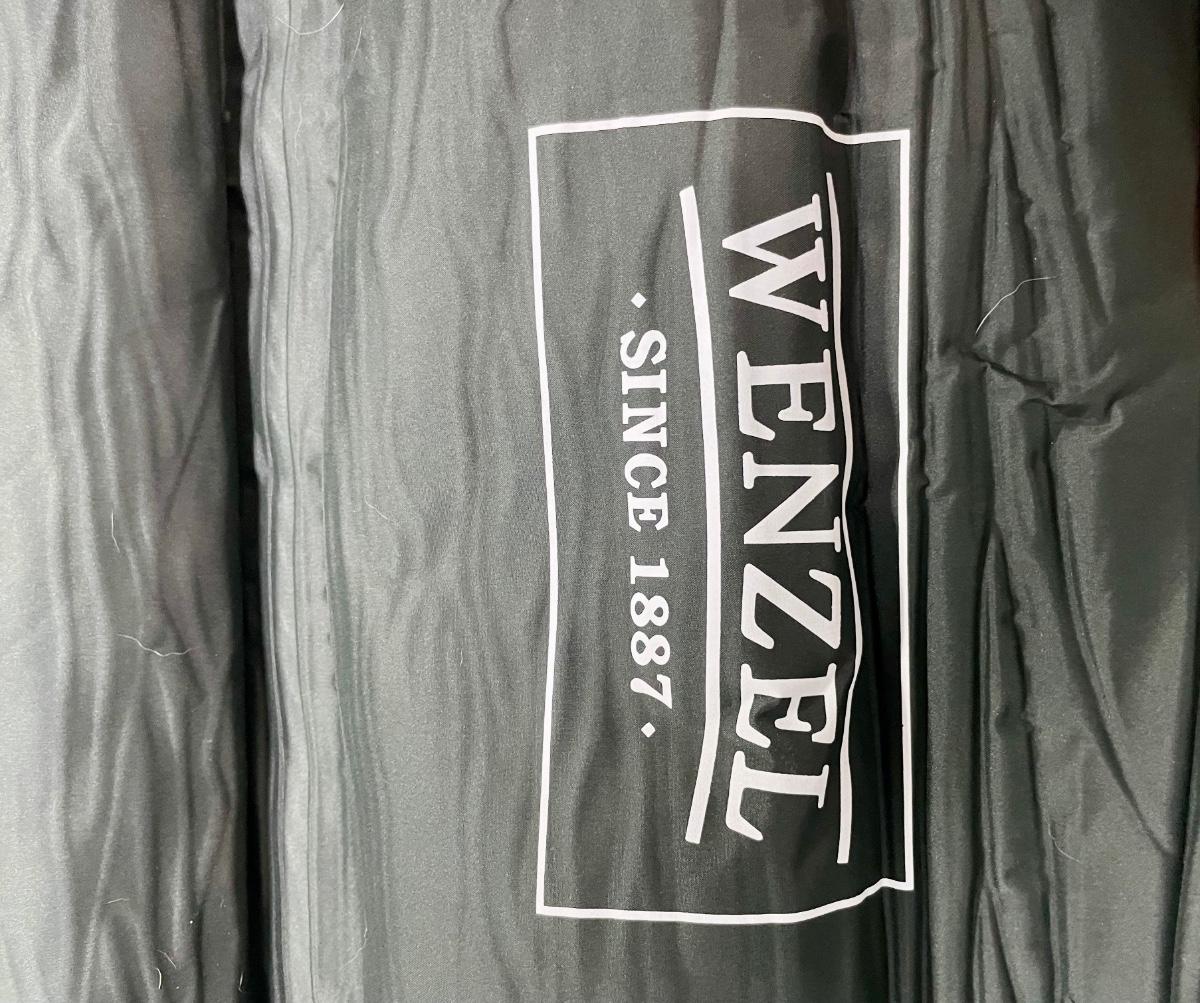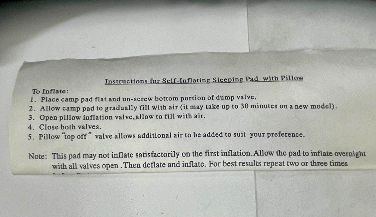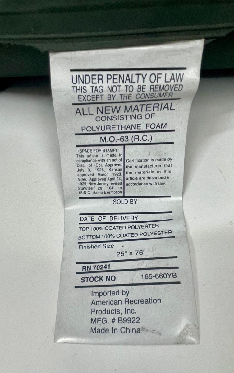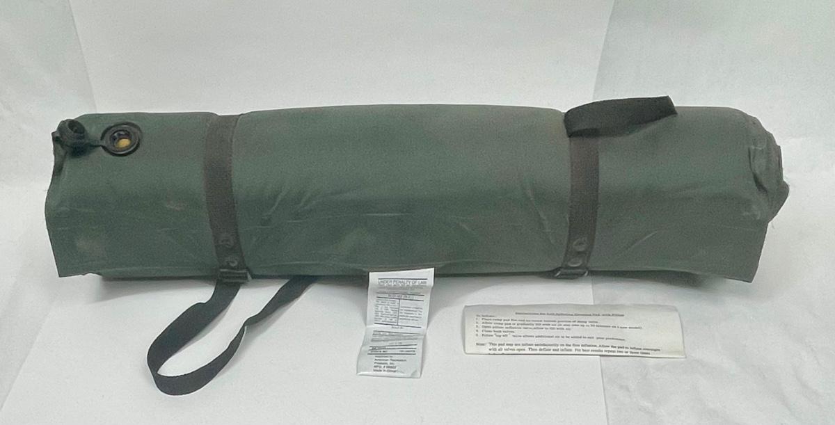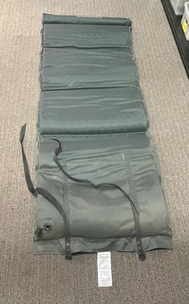 Dark green inflatable pad, includes straps for securing in a tight roll. Measures 76" x 25". Good condition, no visible damage.